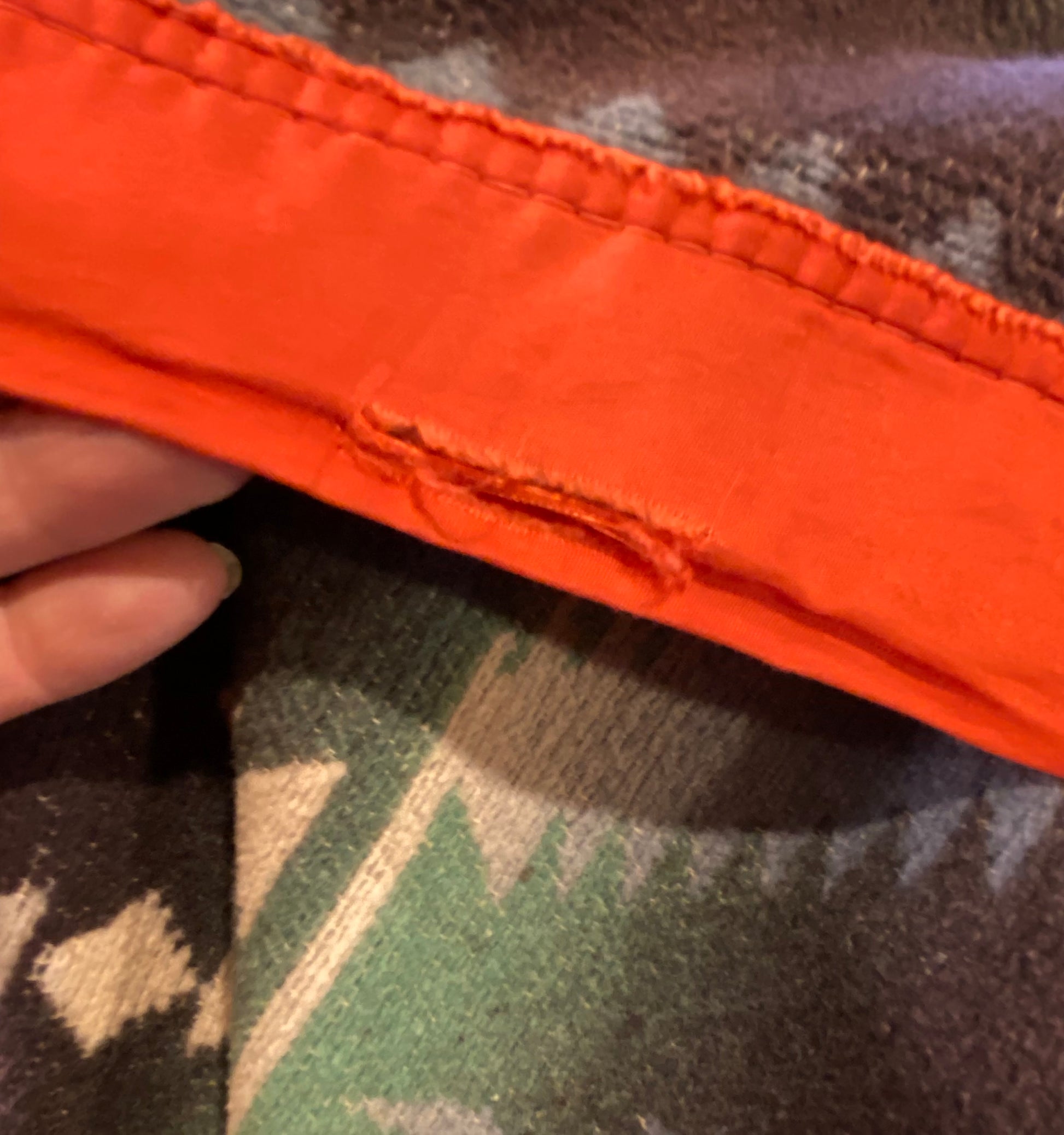 It looks like the original satin binding on the 2 ends is attached. I noticed a minor split in one spot of the red binding.