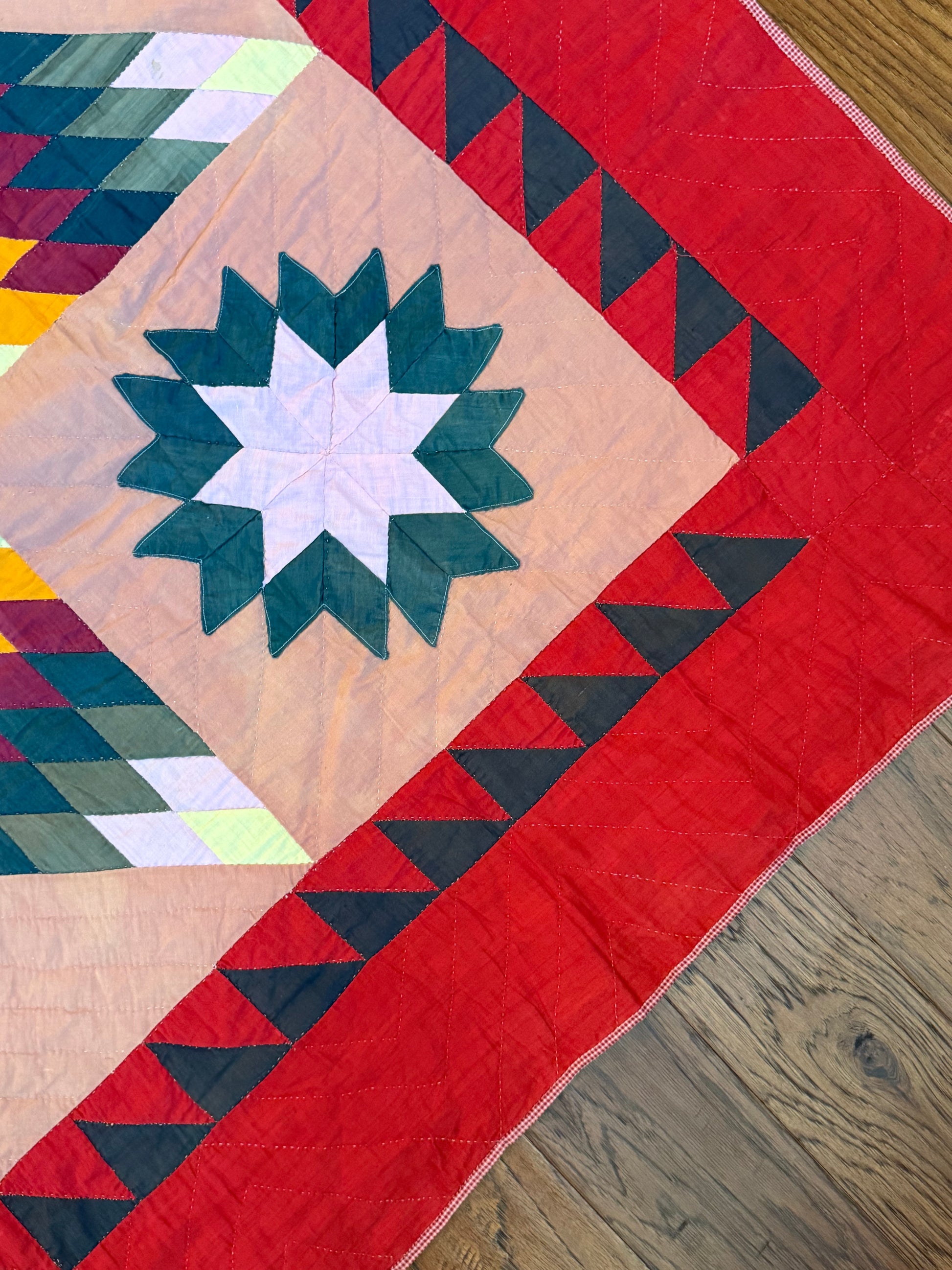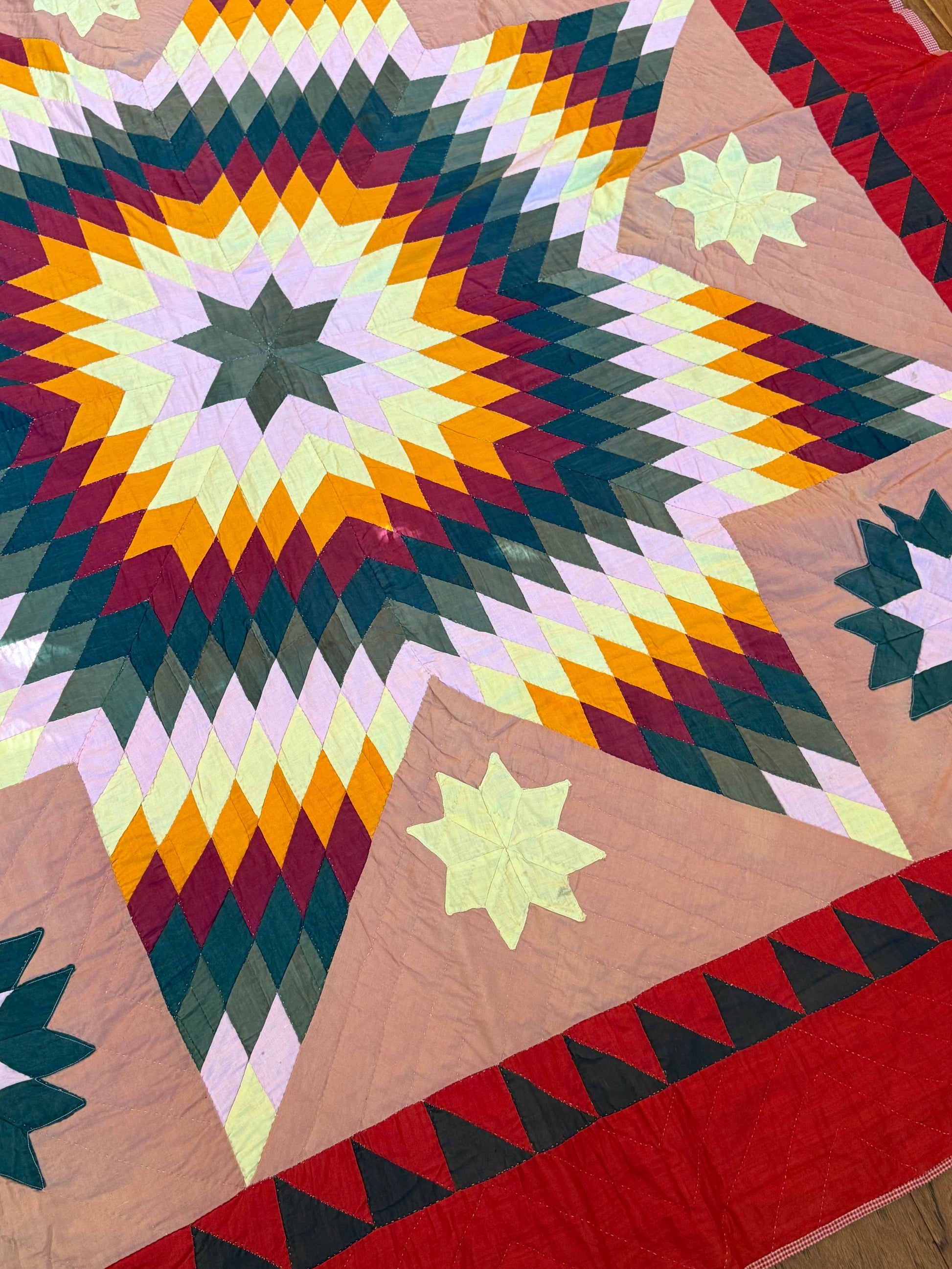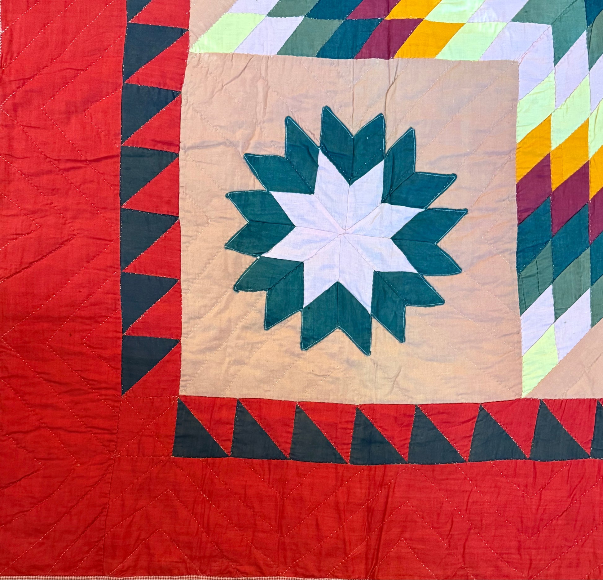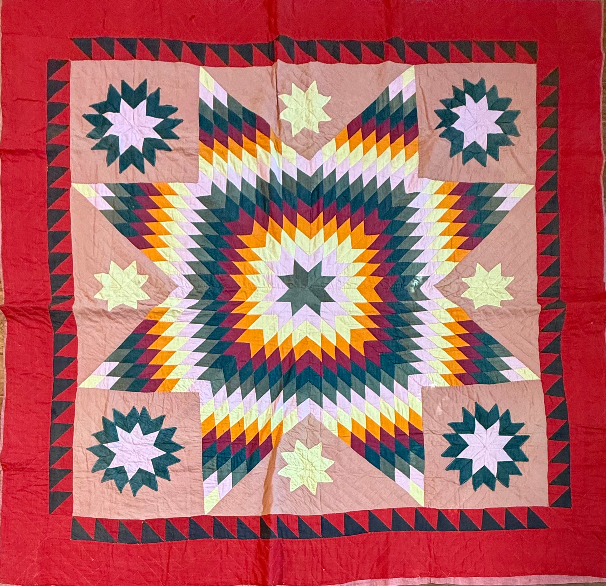 A Blazing Lone Star with satellite stars and framed with a sawtooth border and then finished with a nice red outer border.