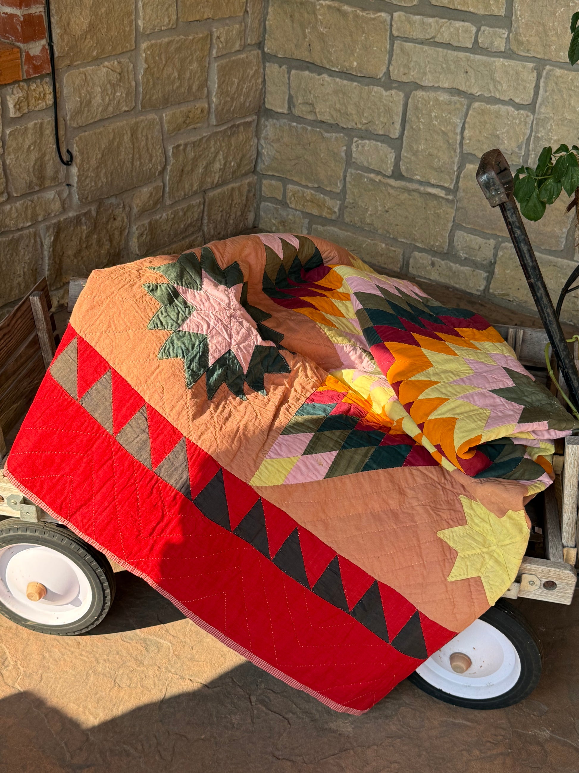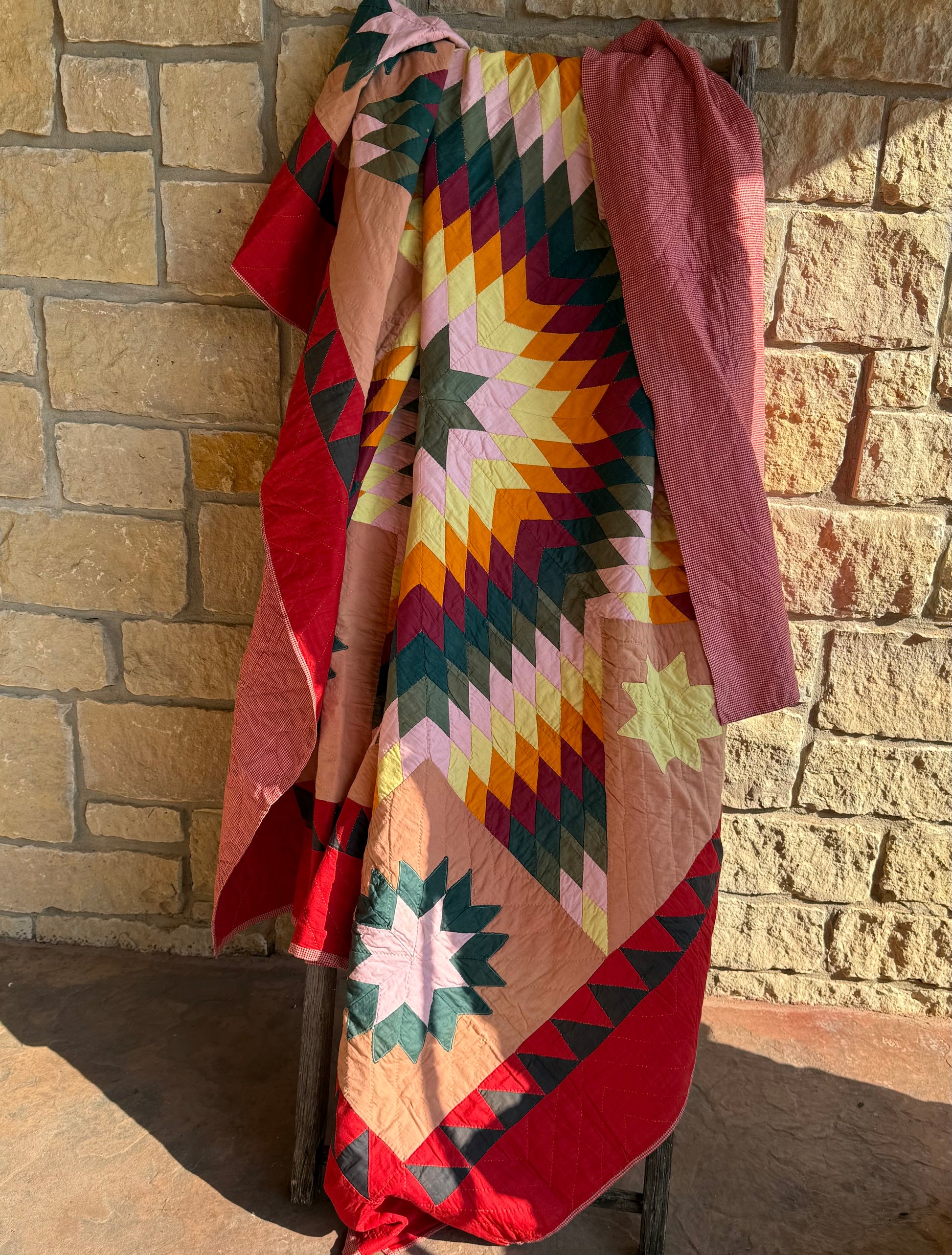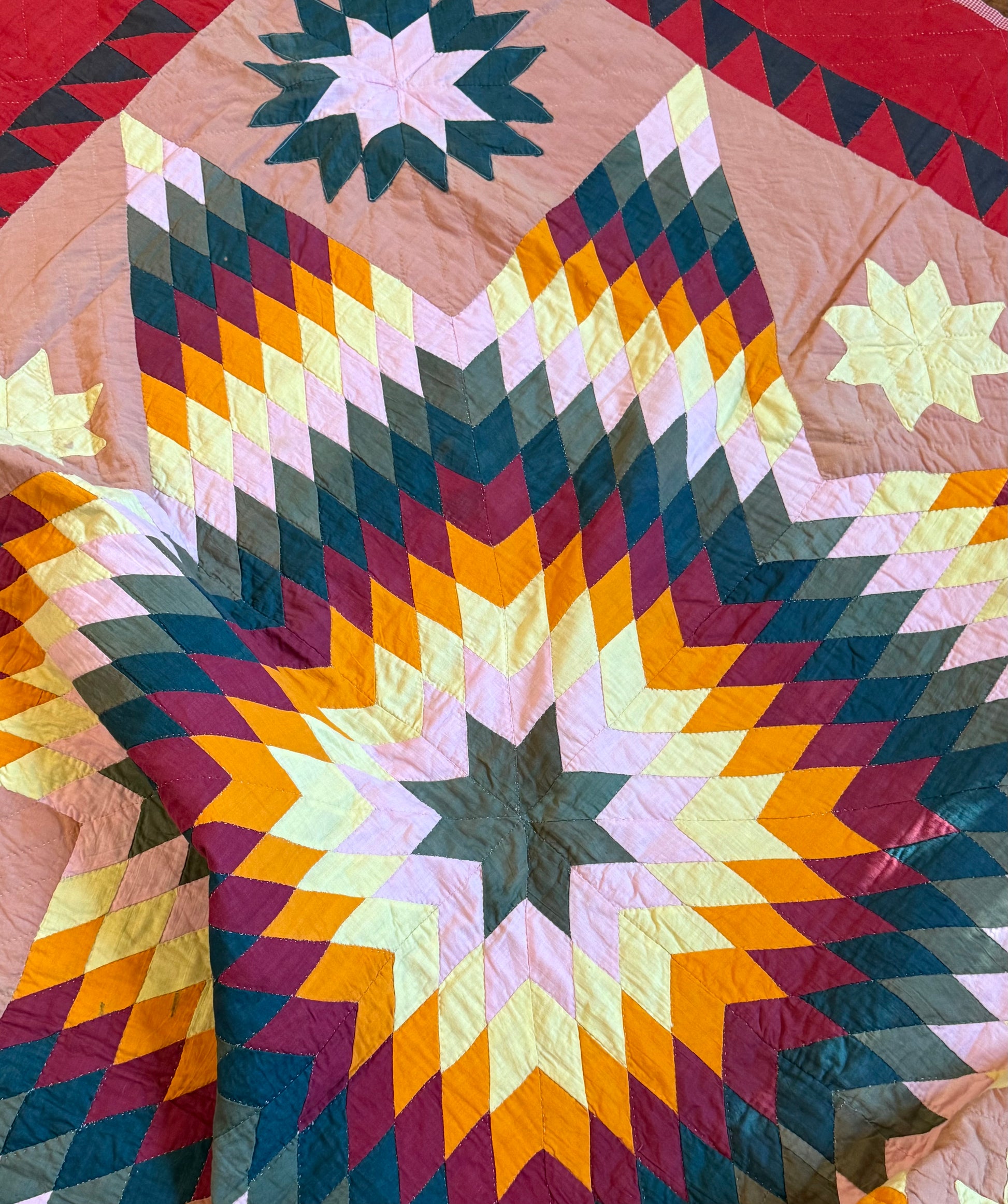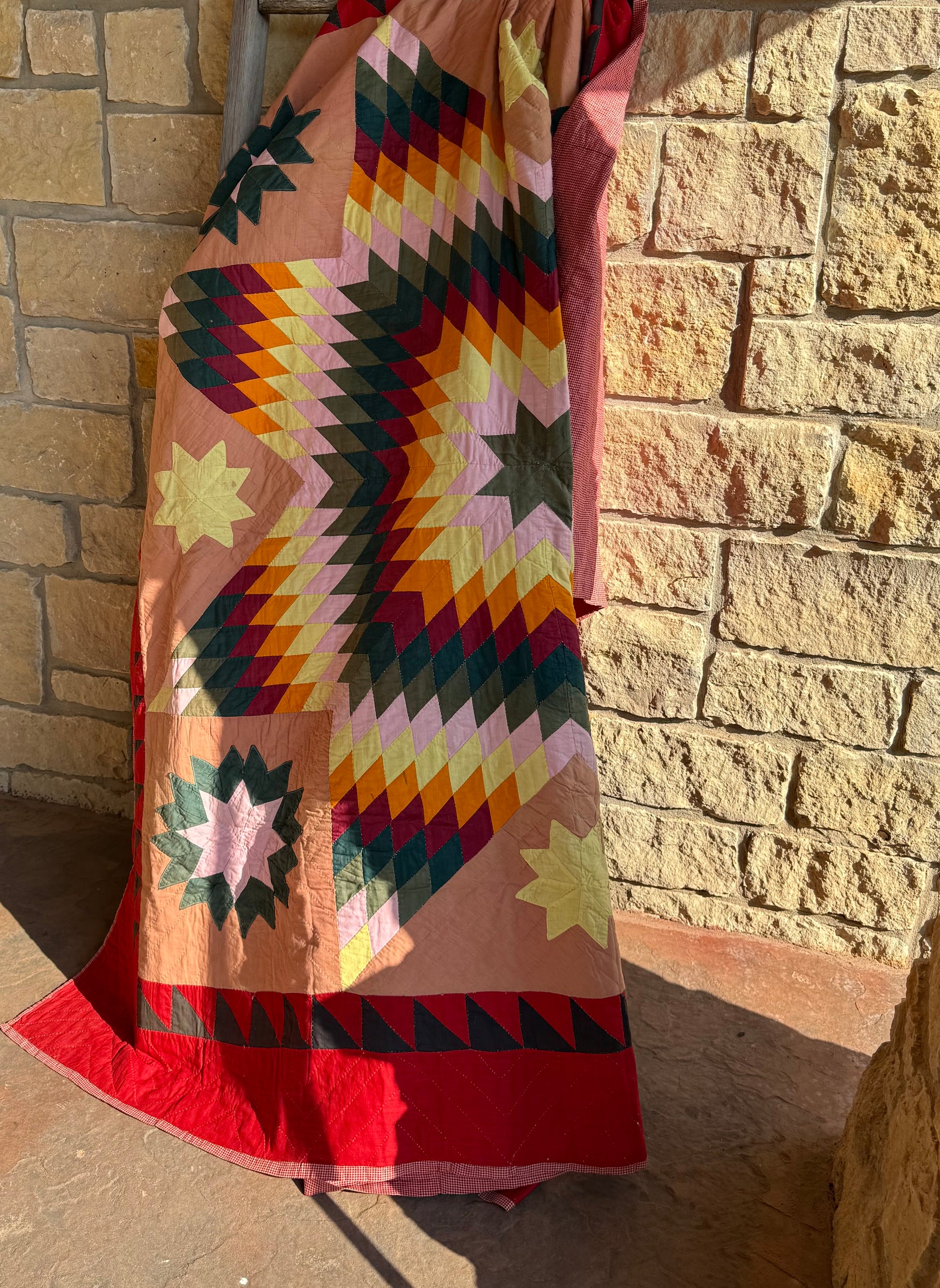 A Blazing Lone Star with satellite stars and framed with a sawtooth border and then finished with a nice red outer border.