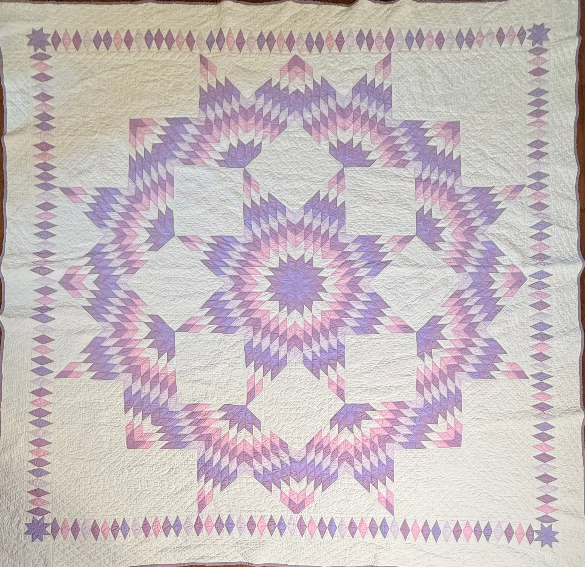 This outstanding Broken Star quilt with shades of lavenders is a super design and extremely fine antique quilt.