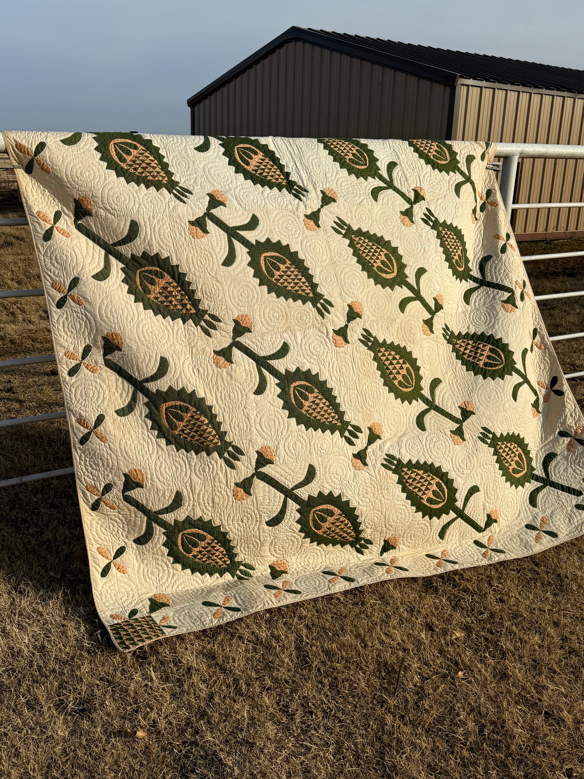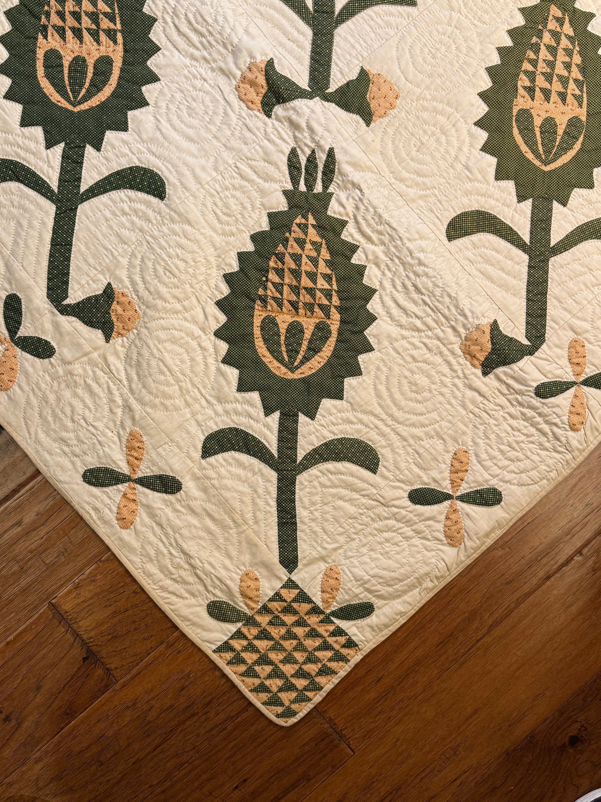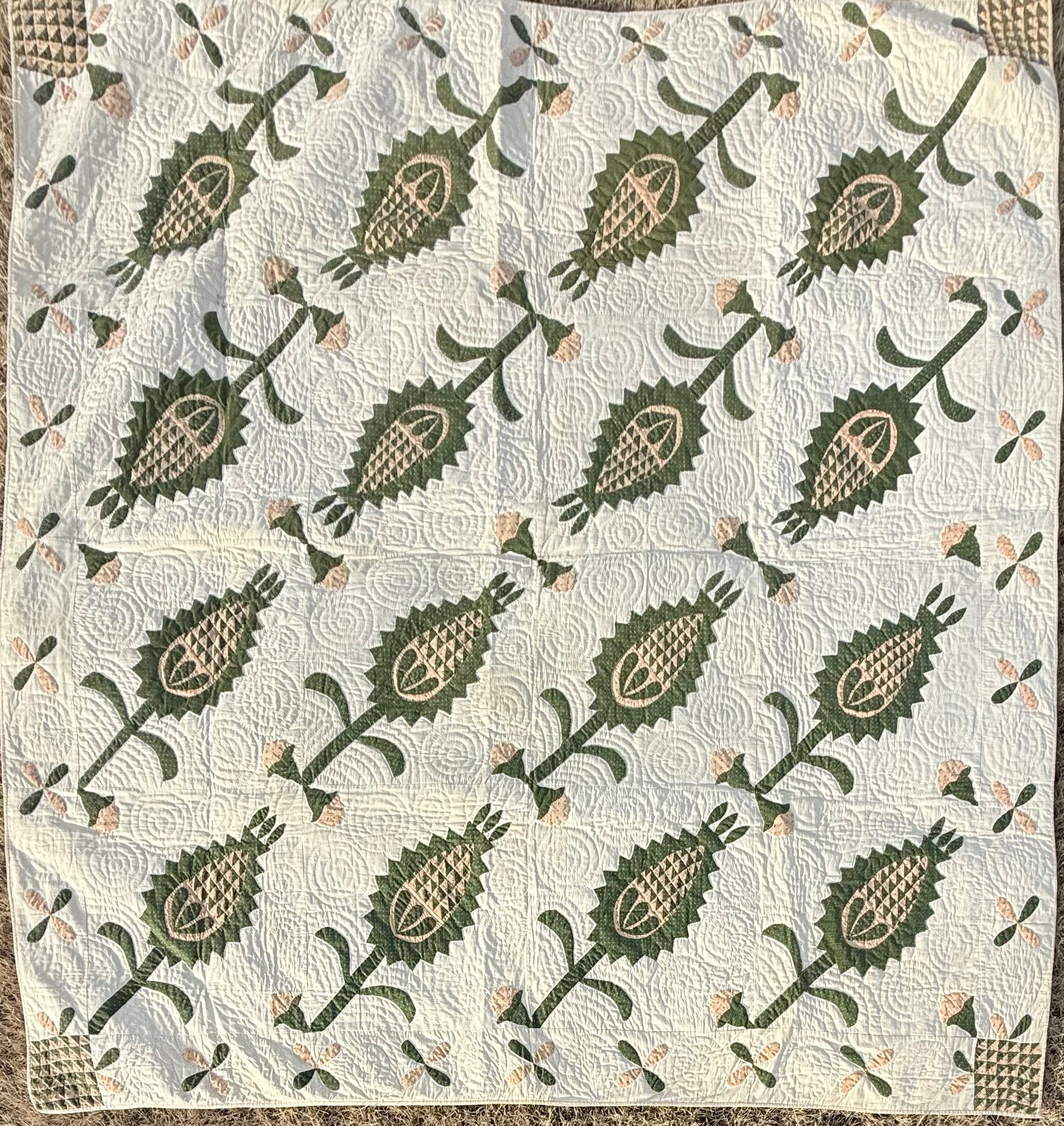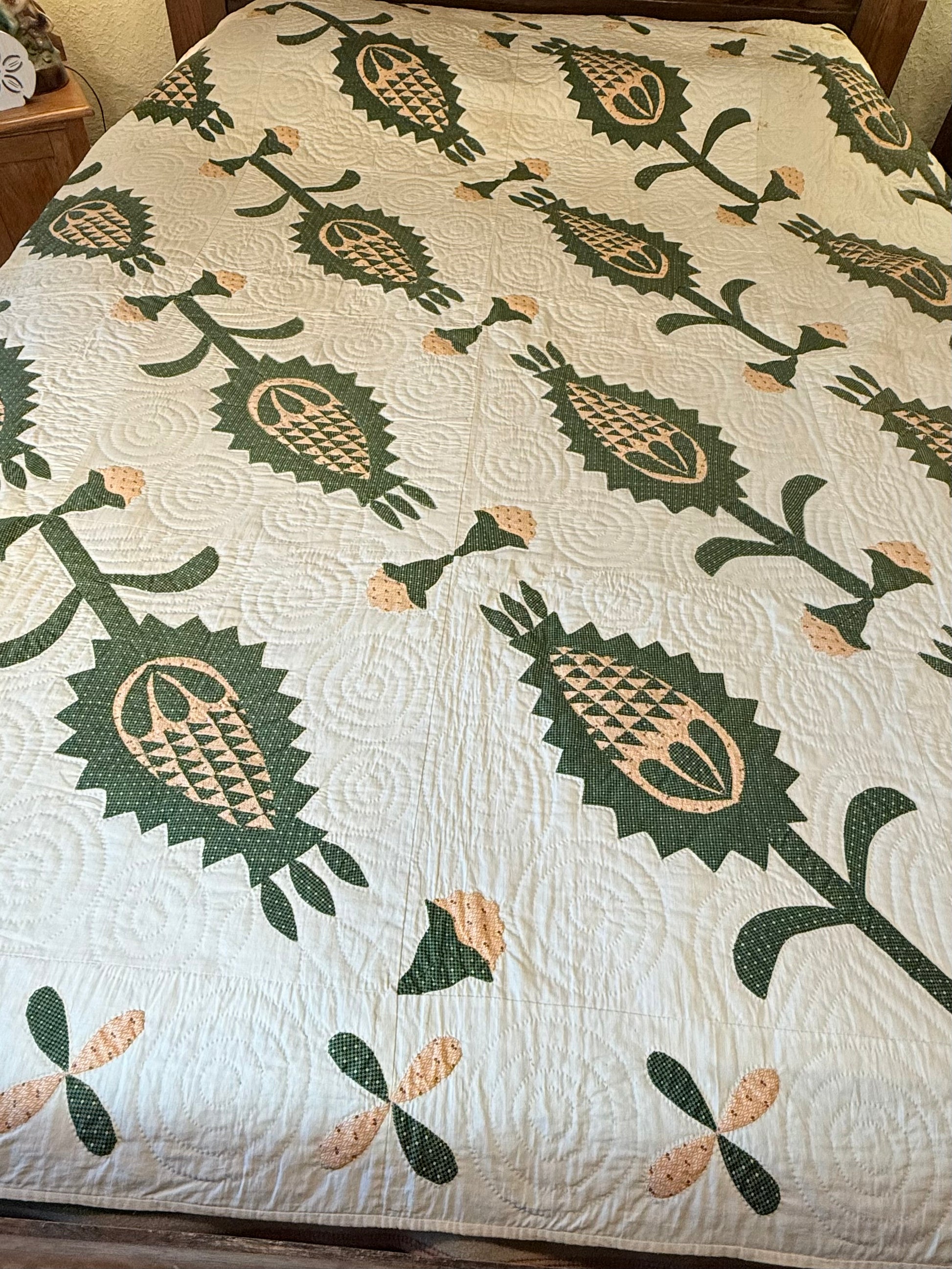 An incredible early appliqué and pieced Pineapple quilt. Detailed piece work and nice appliqué. I mention the appliqué as some of it is early machine appliqué and some is appliqué by hand .