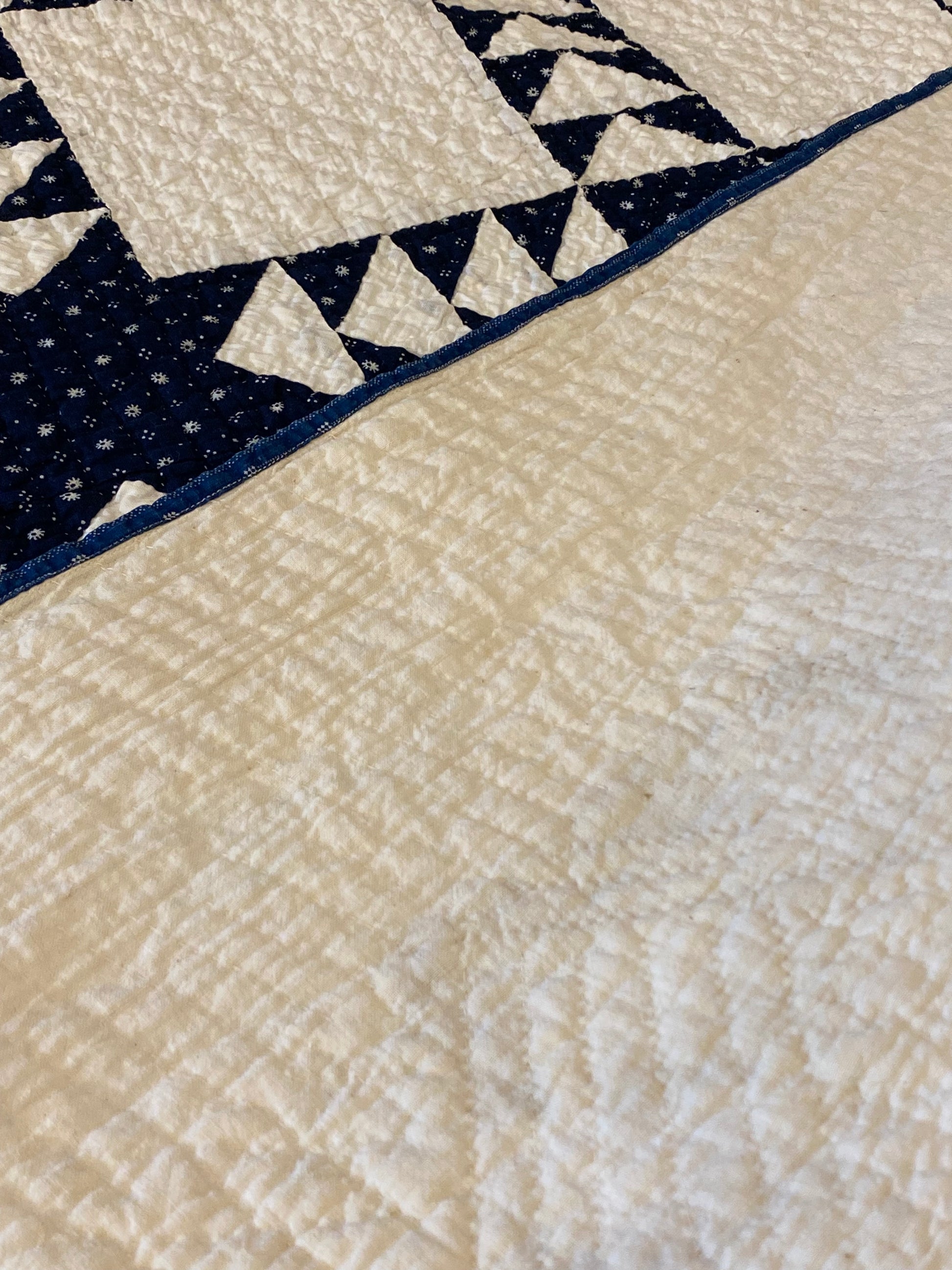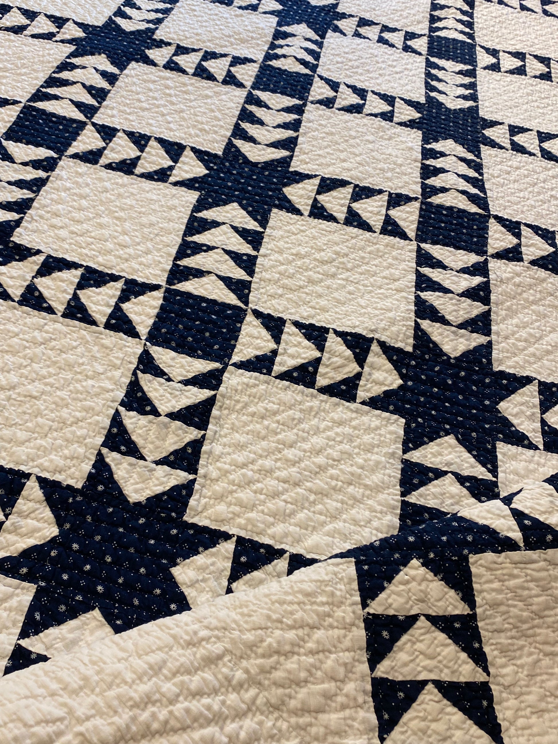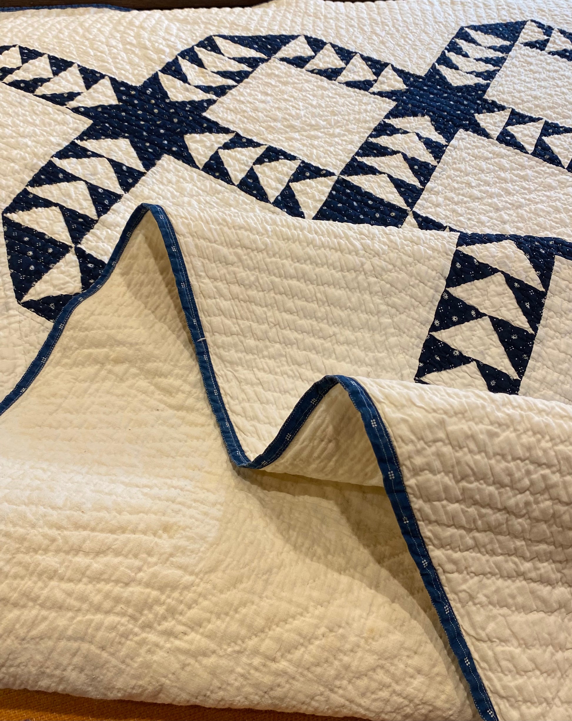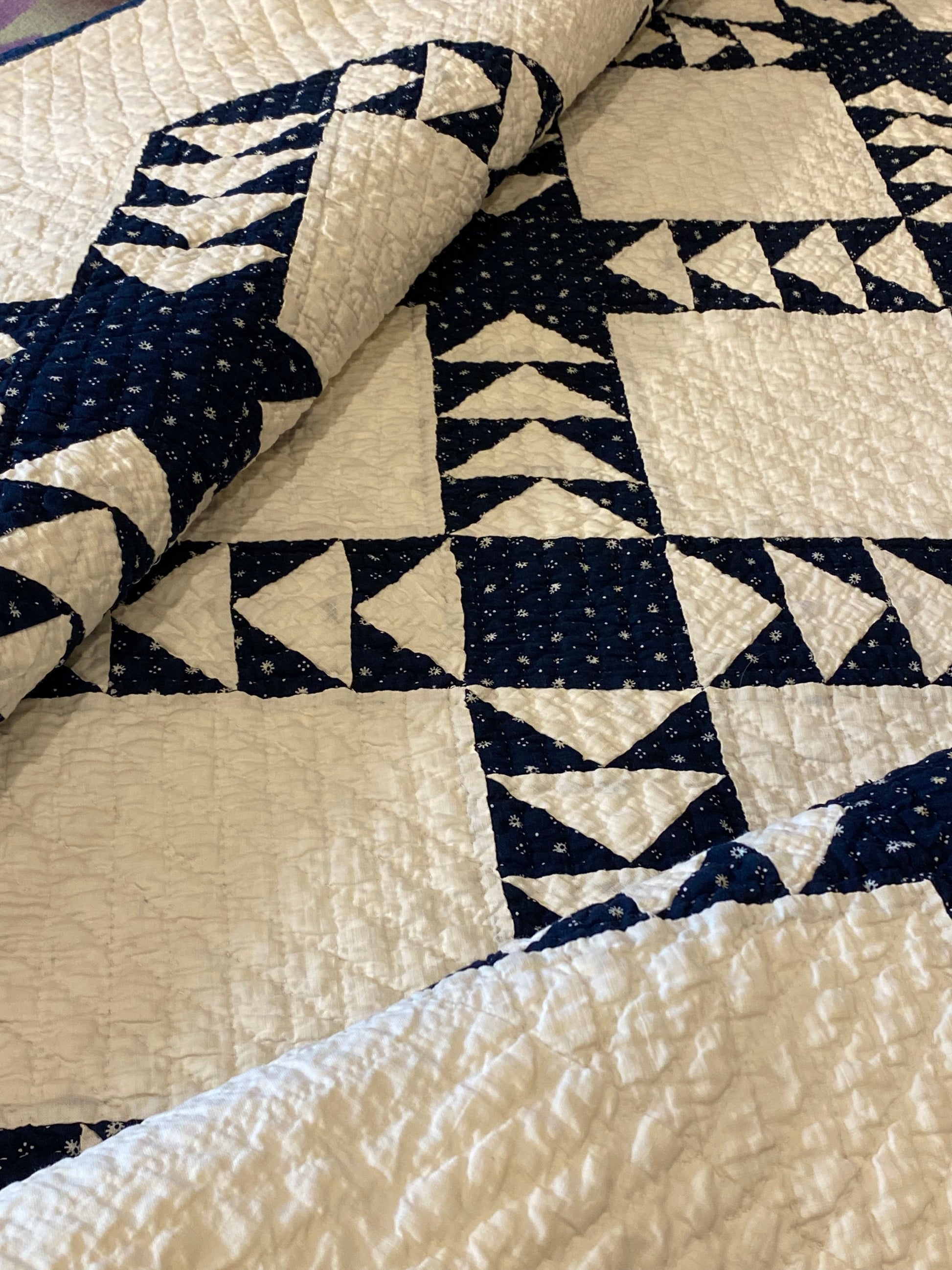 Stunning American classic indigo and white Flying Geese antique quilt.