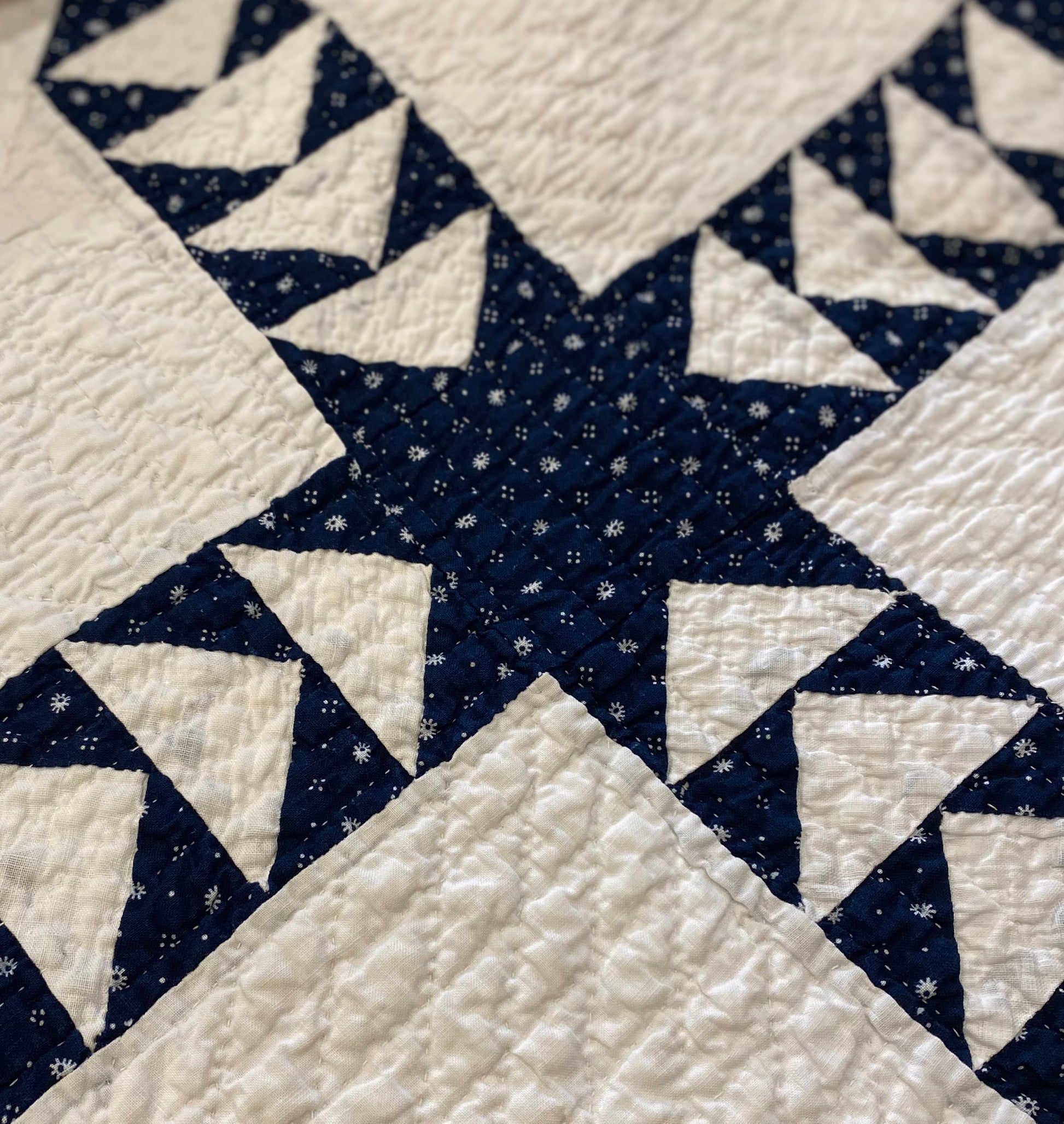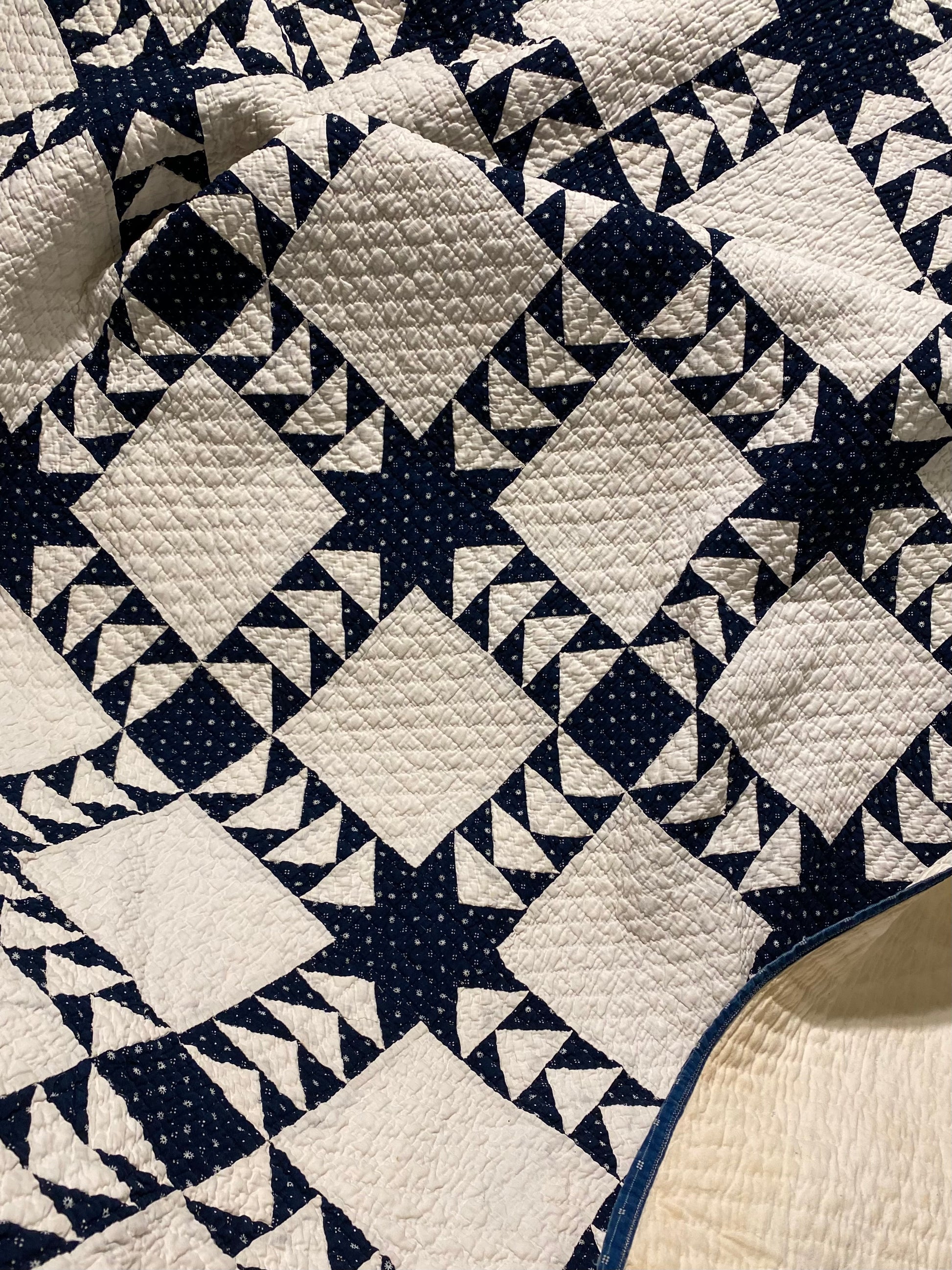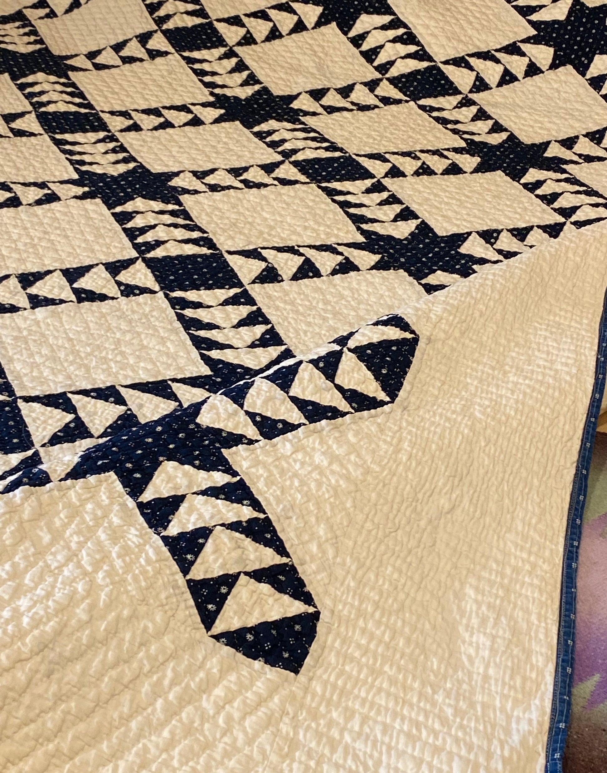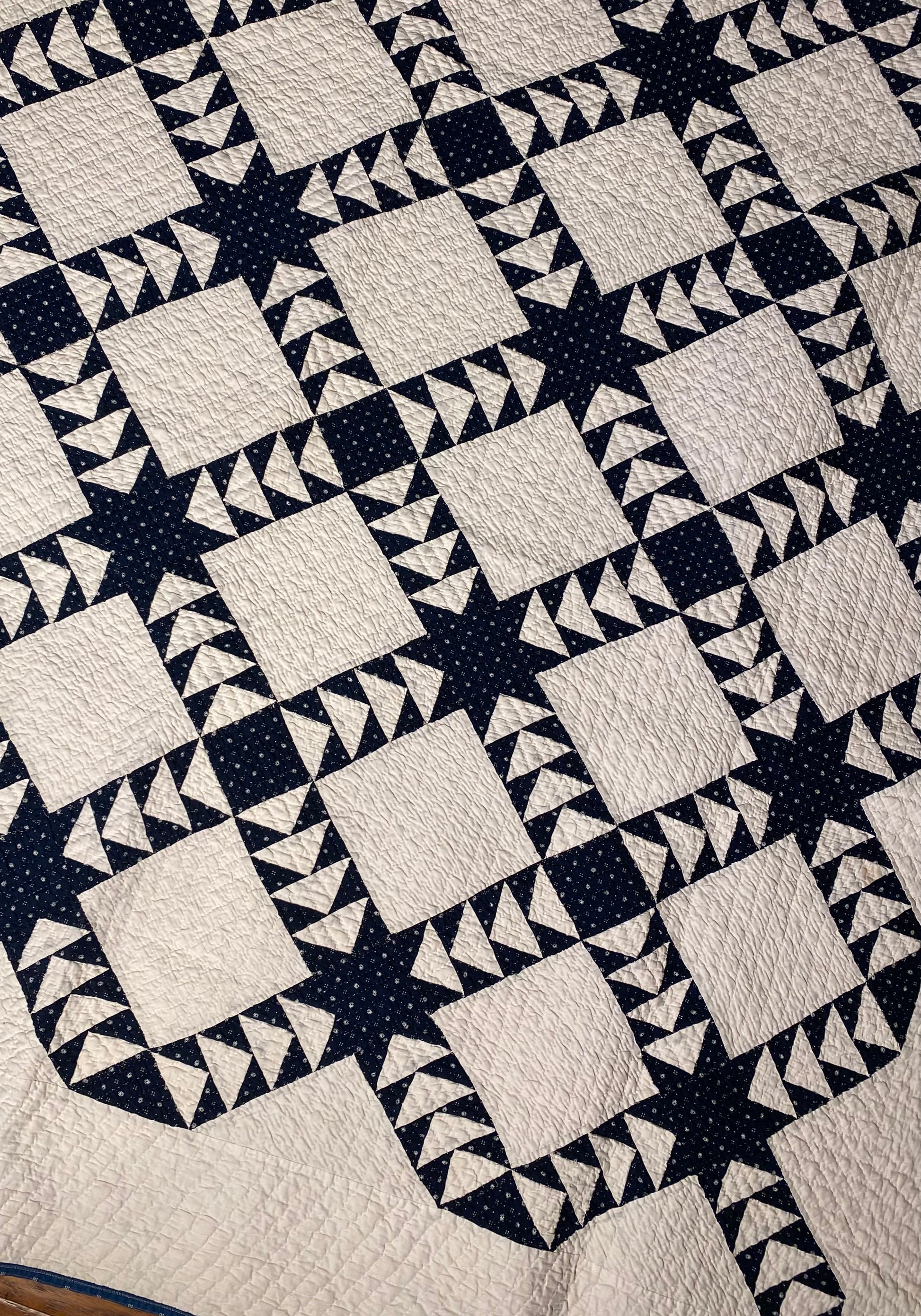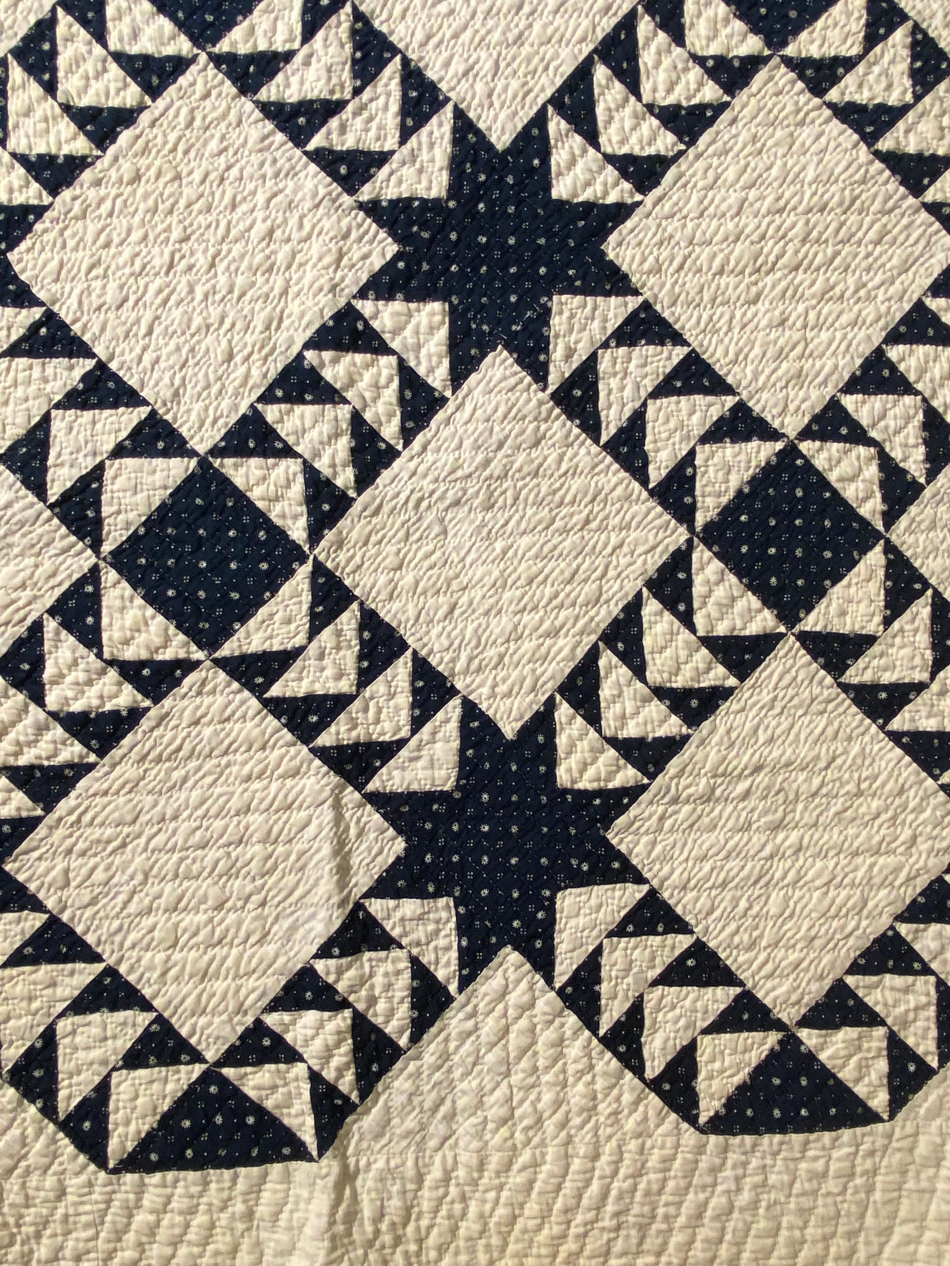 Stunning American classic indigo and white Flying Geese antique quilt.