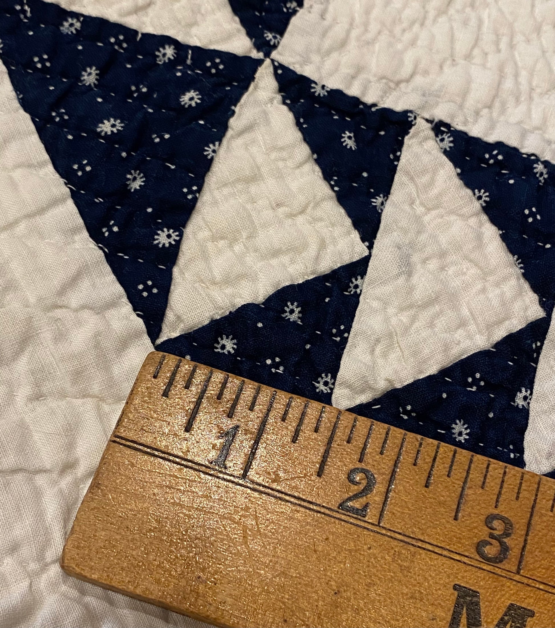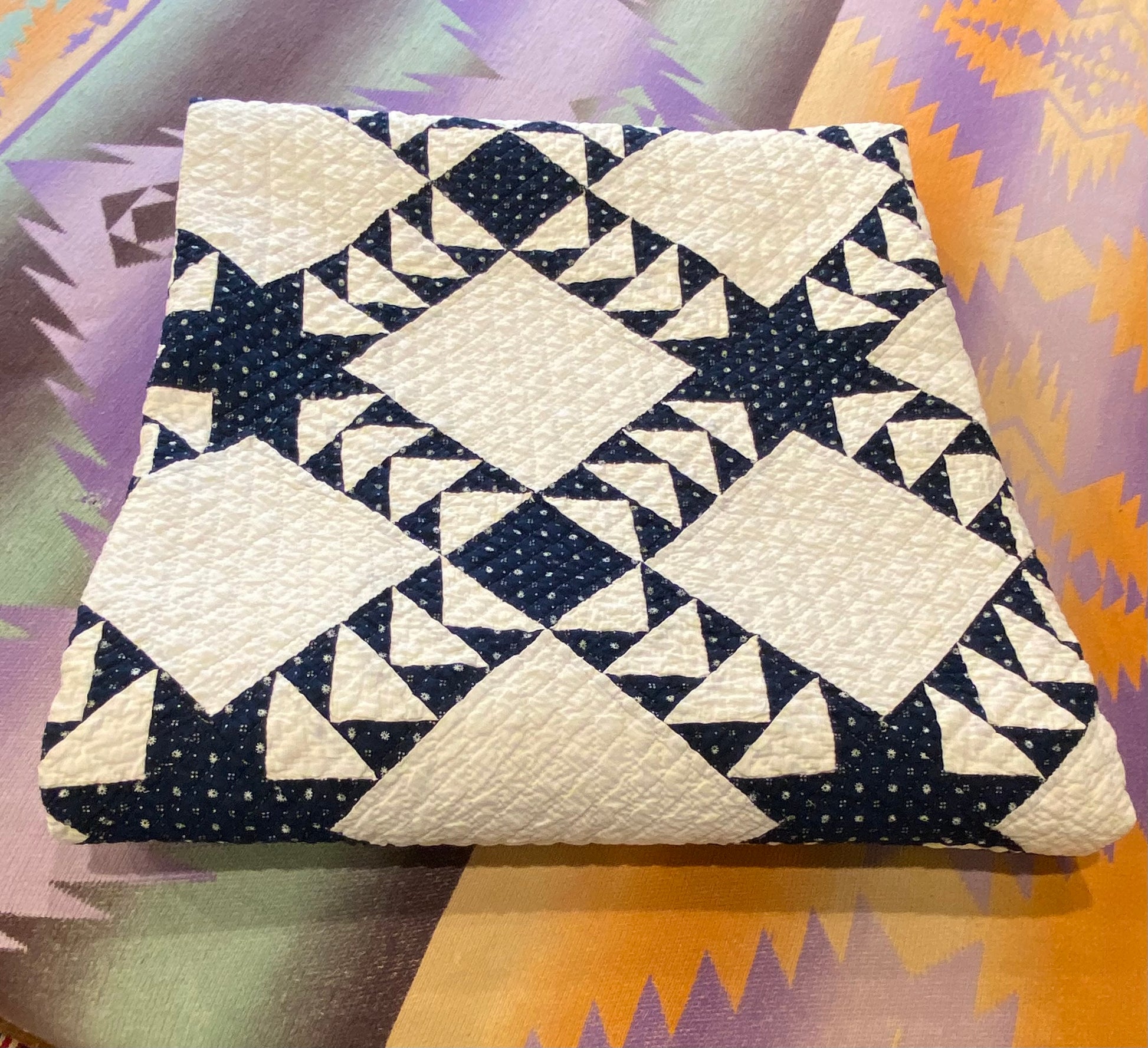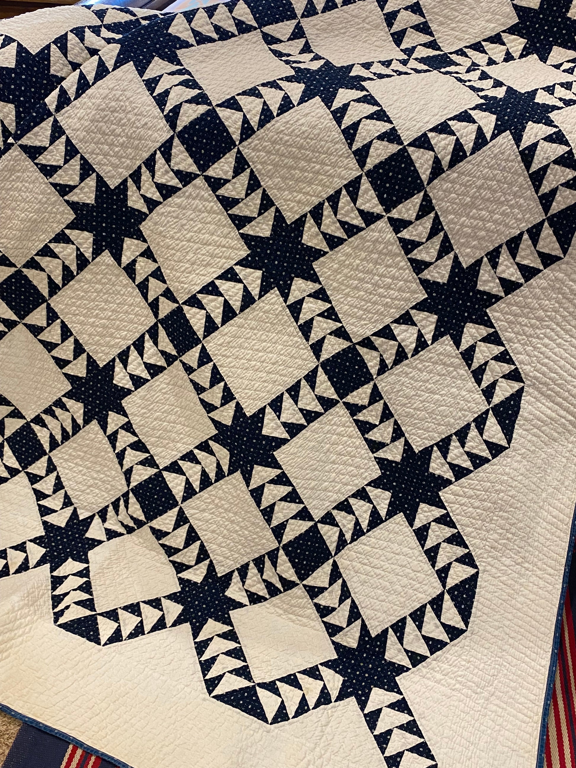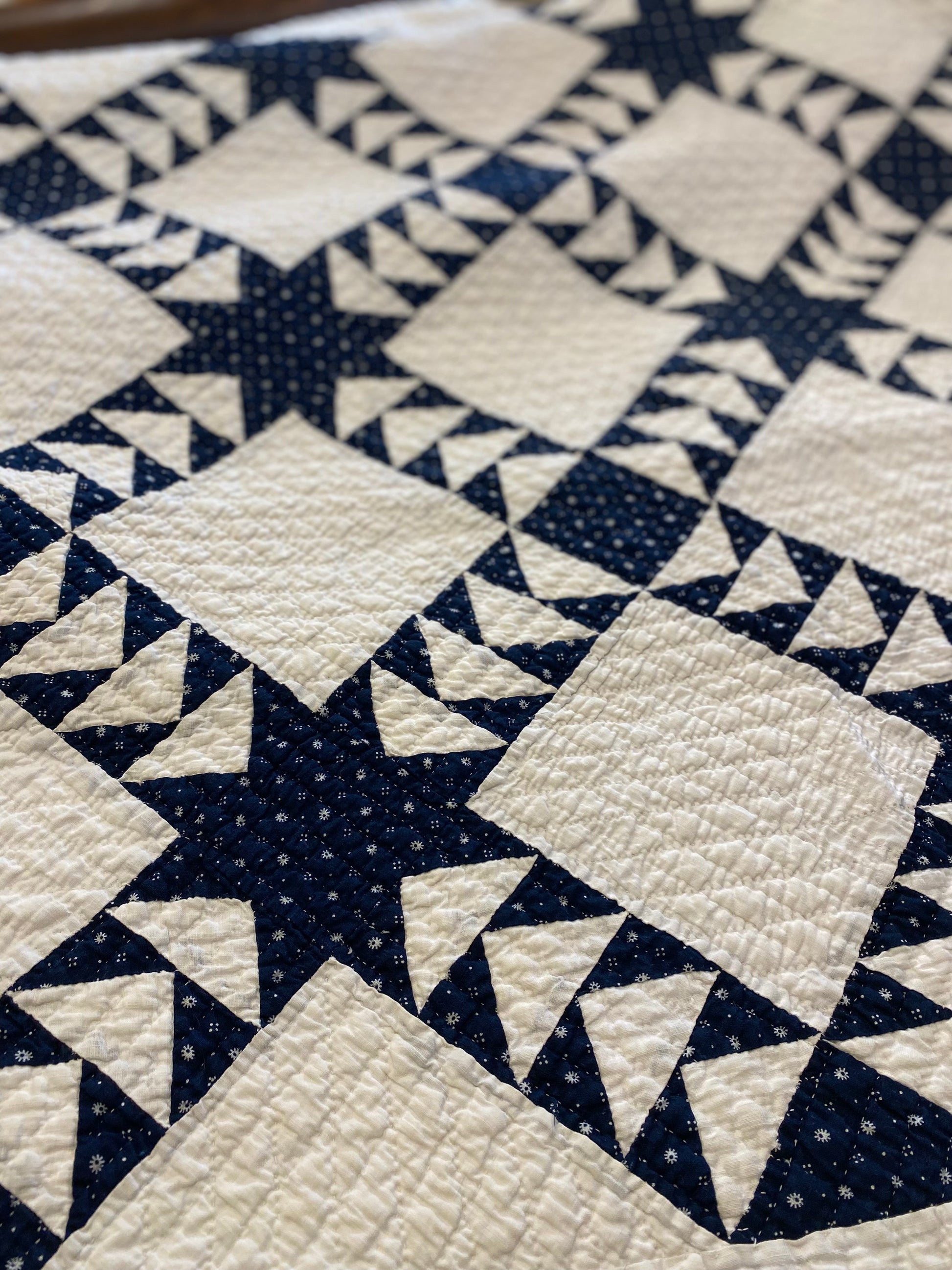 Stunning American classic indigo and white Flying Geese antique quilt.