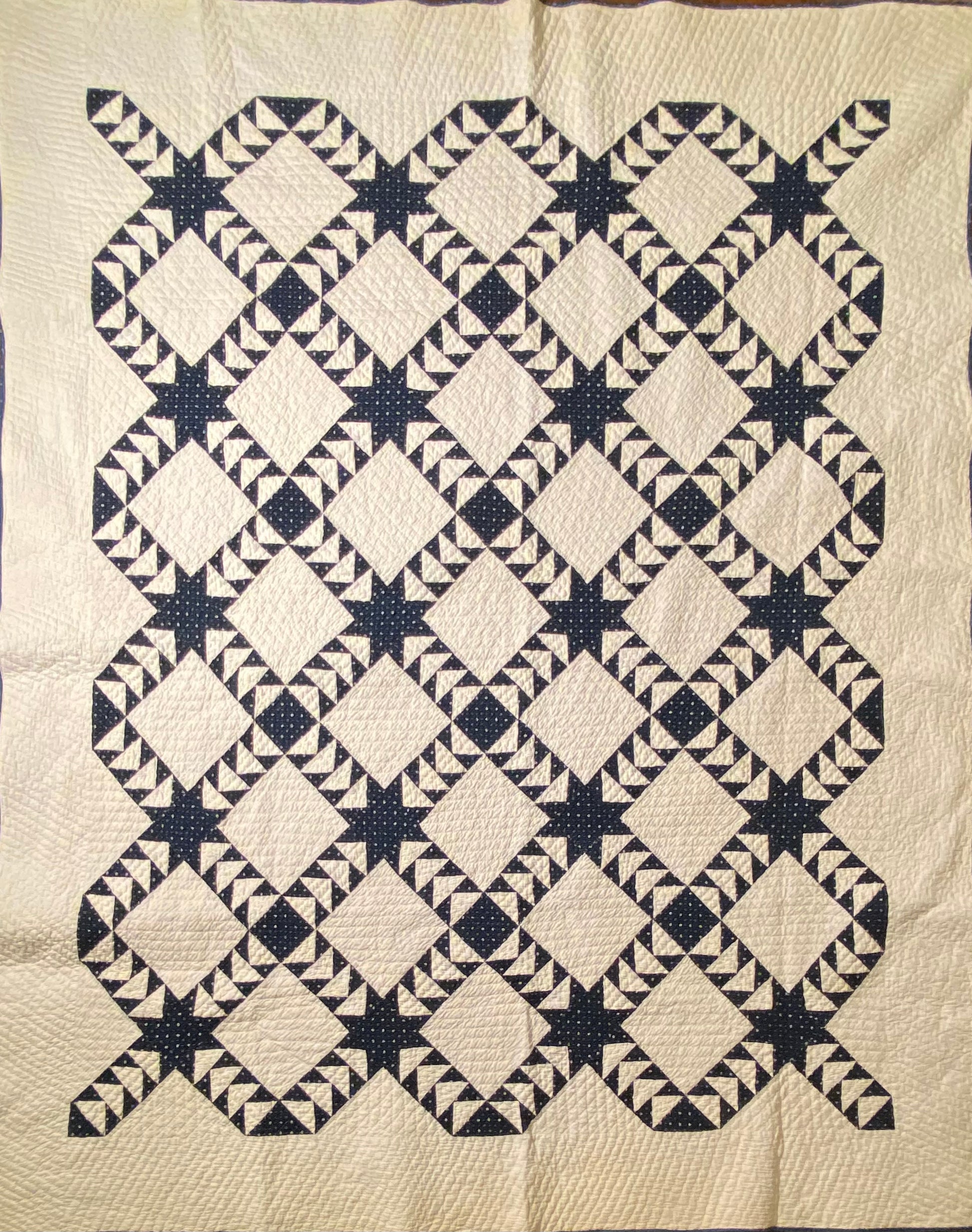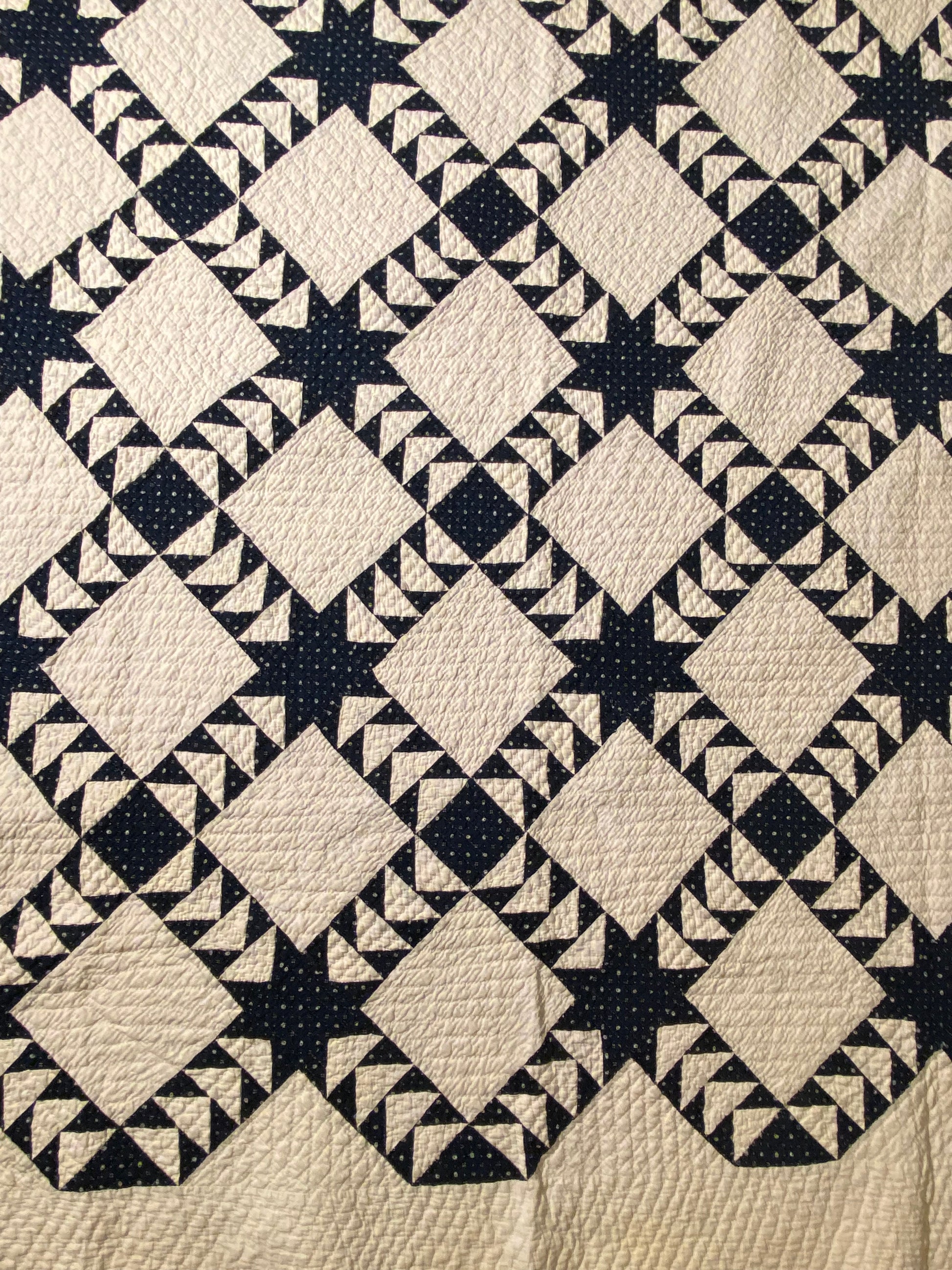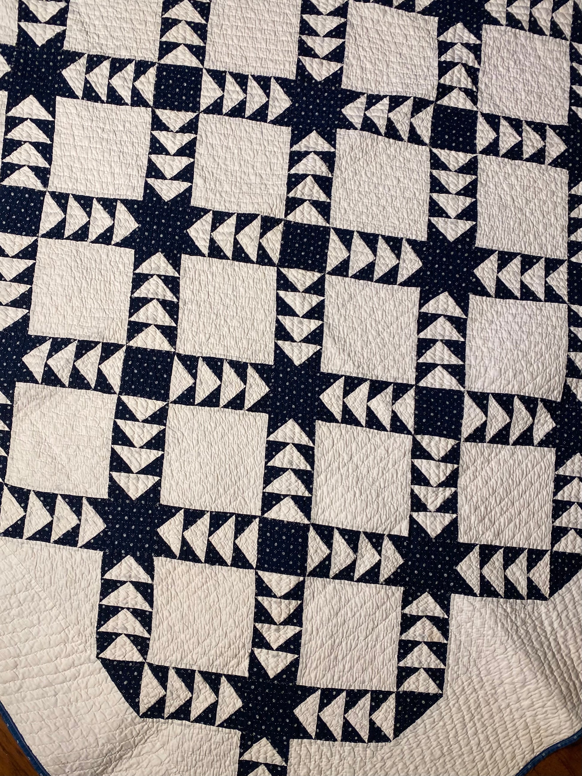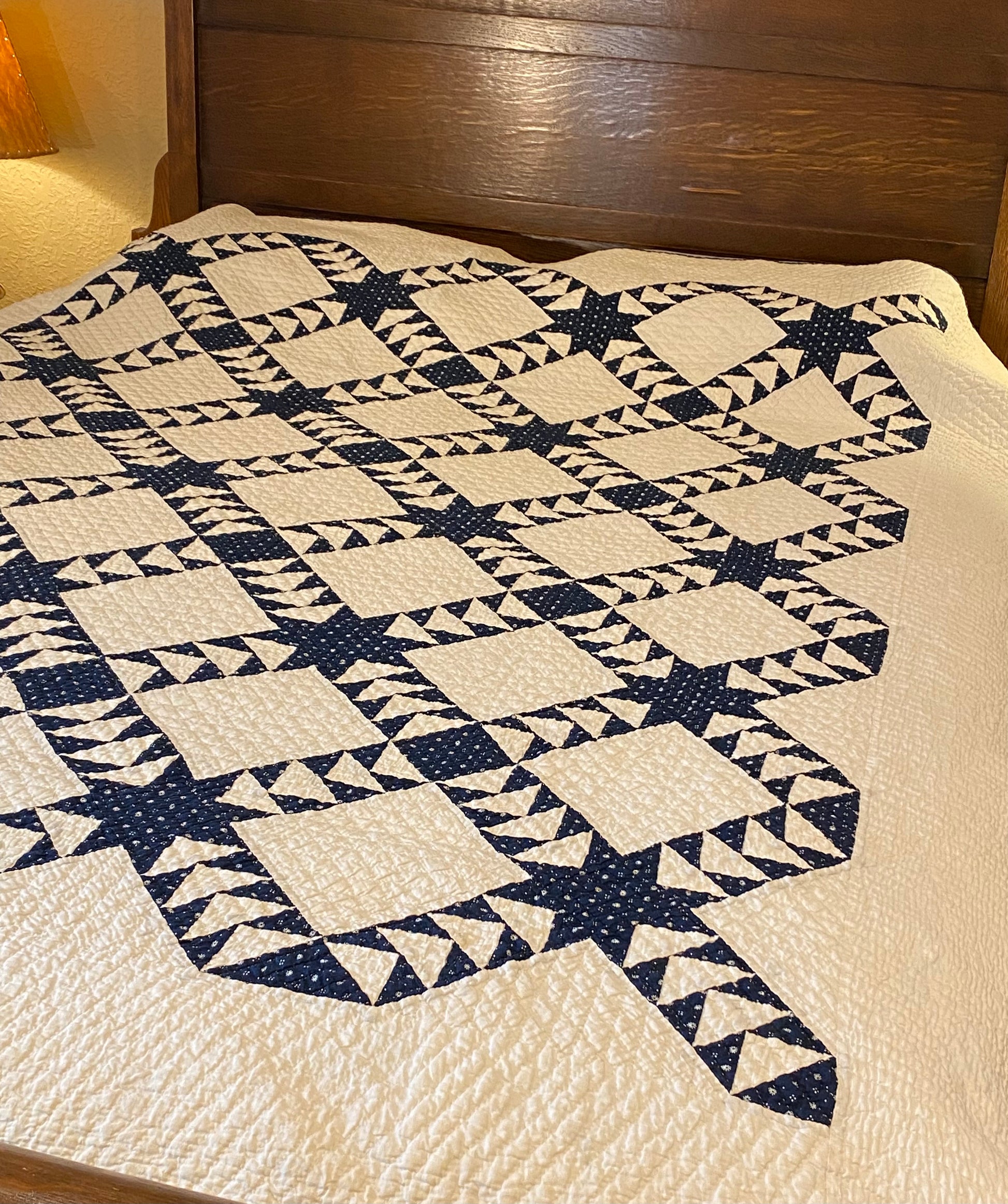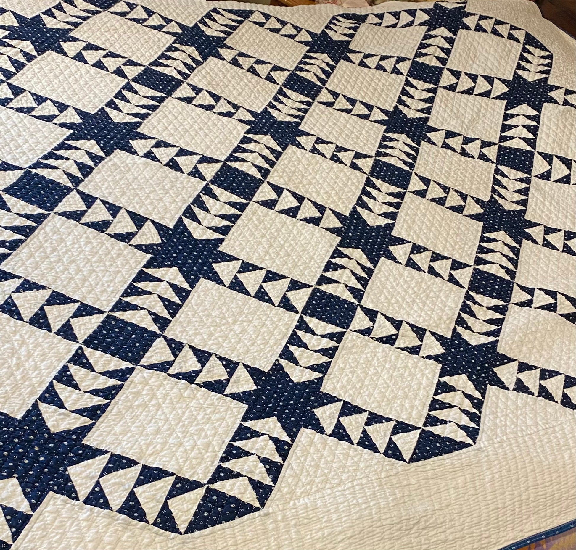 Stunning American classic indigo and white Flying Geese antique quilt.