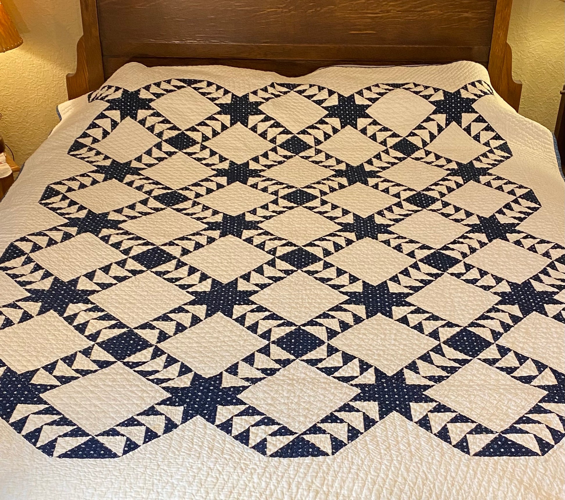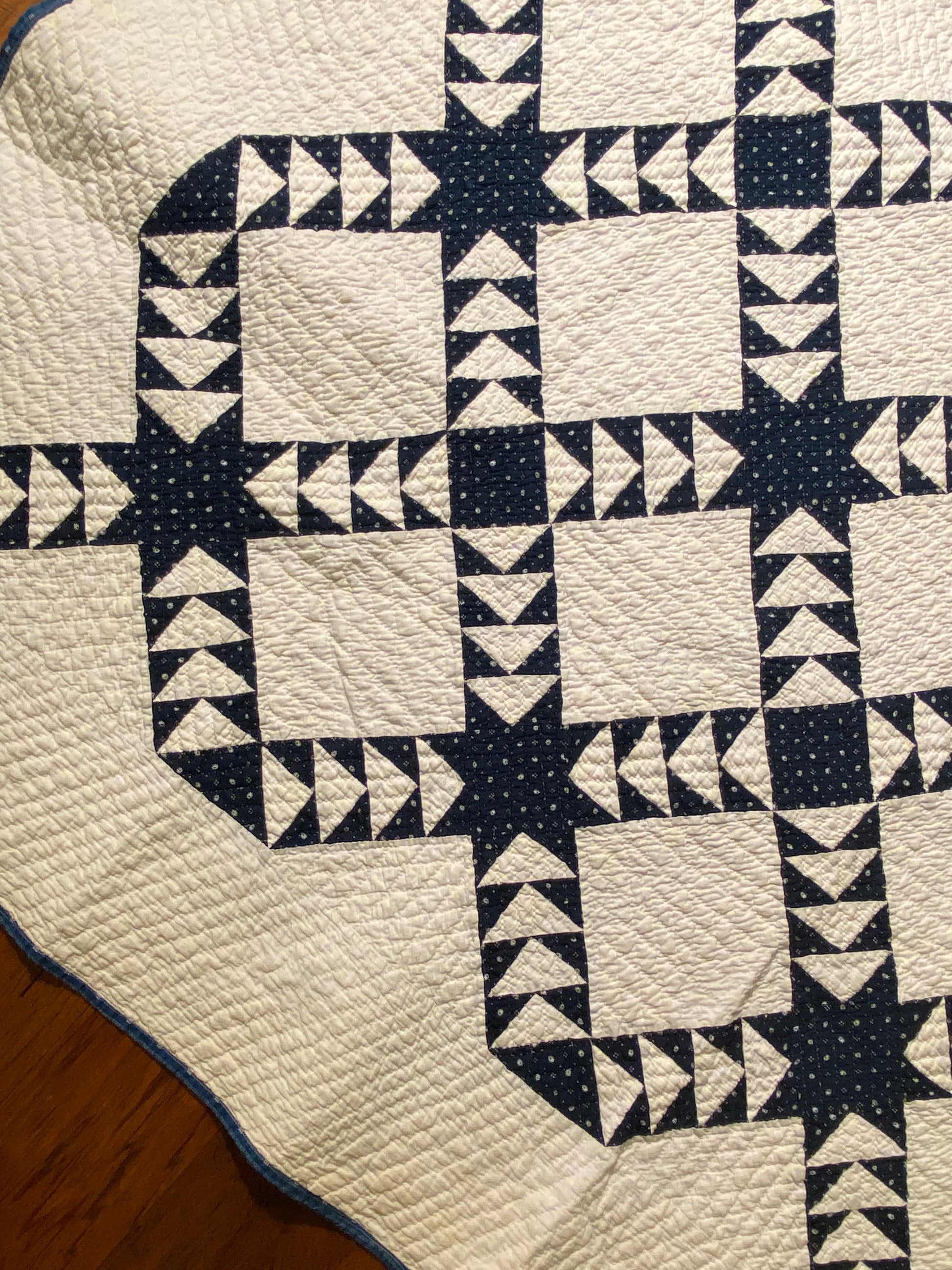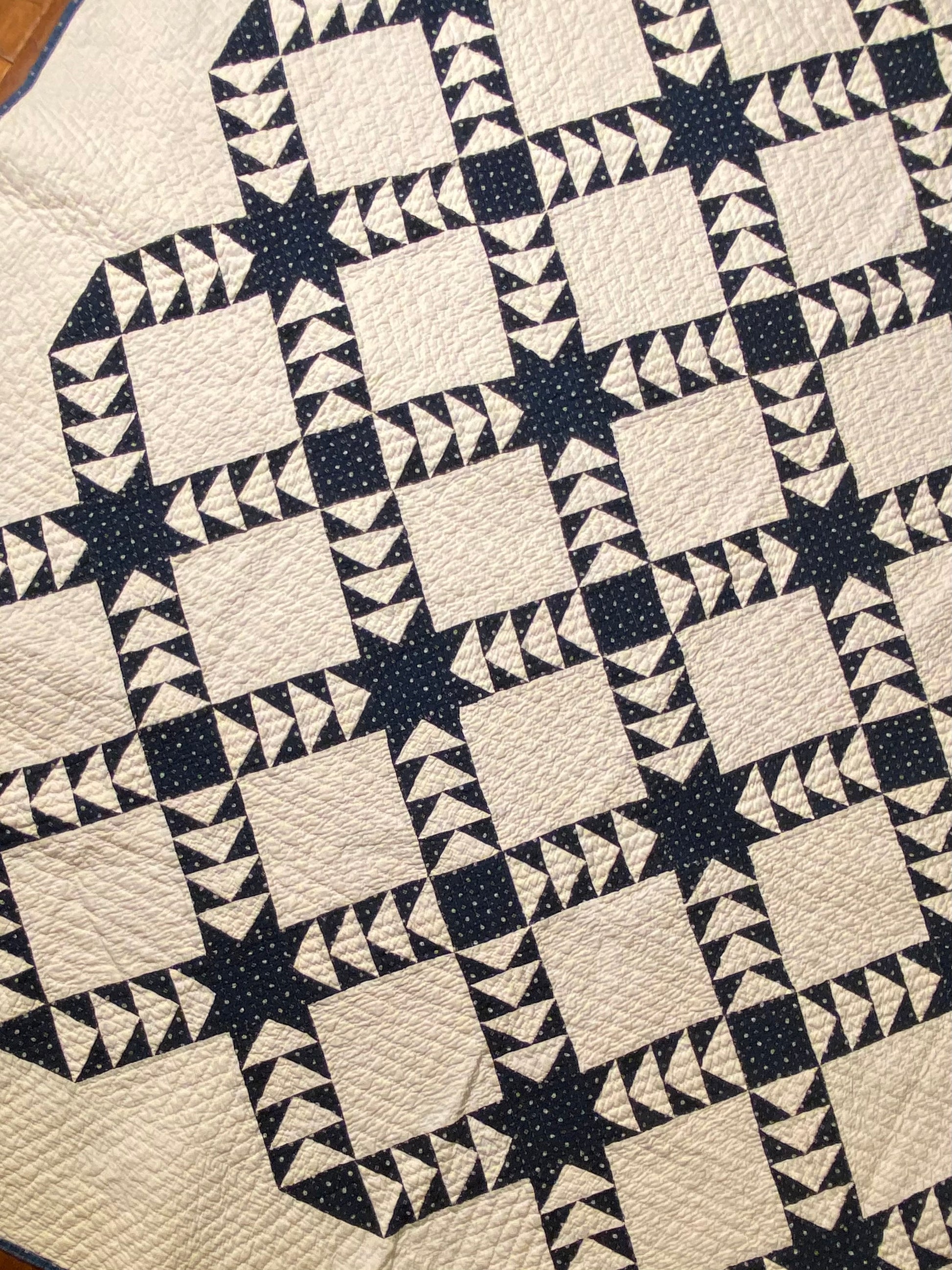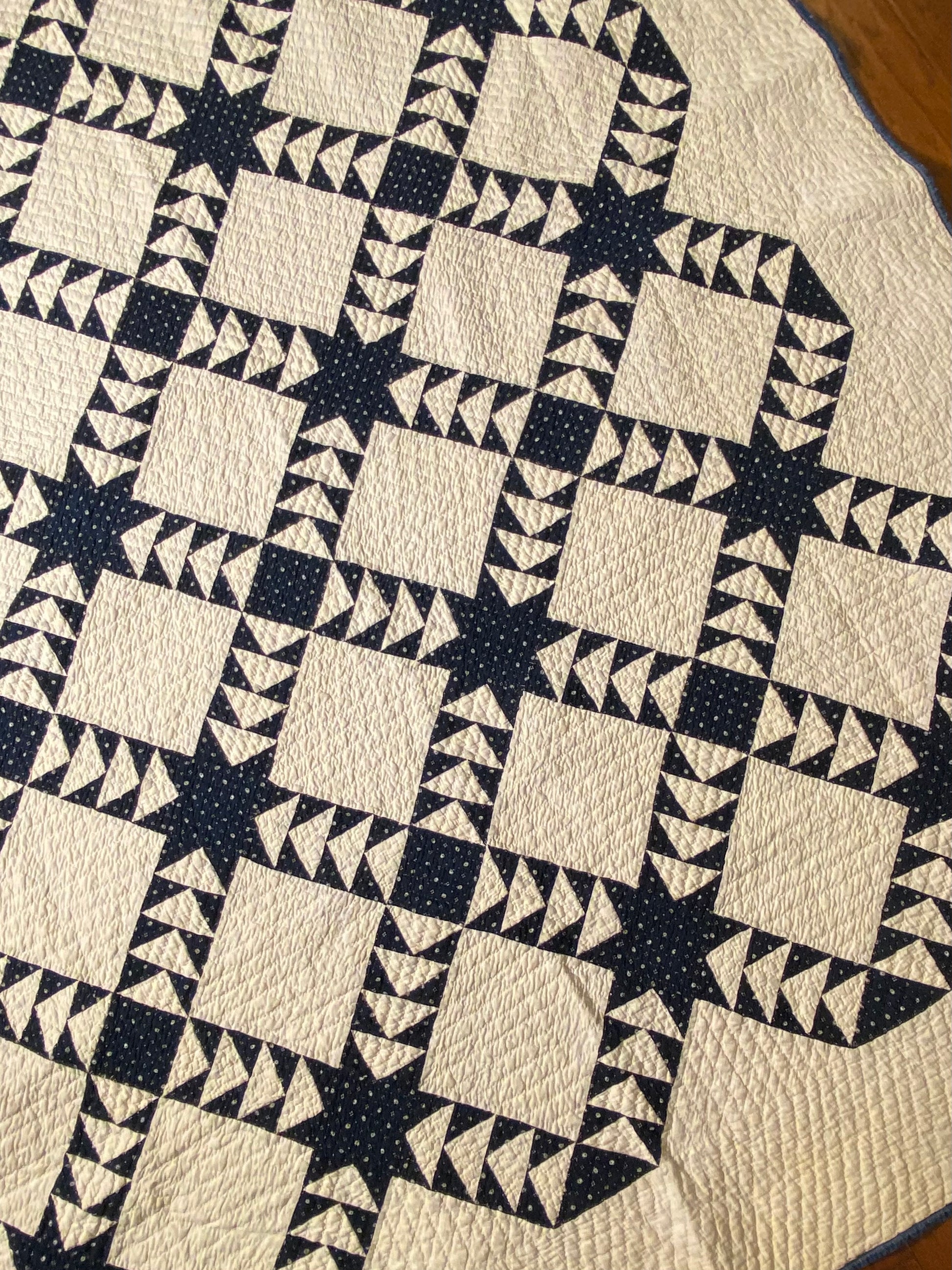 Stunning American classic indigo and white Flying Geese antique quilt.