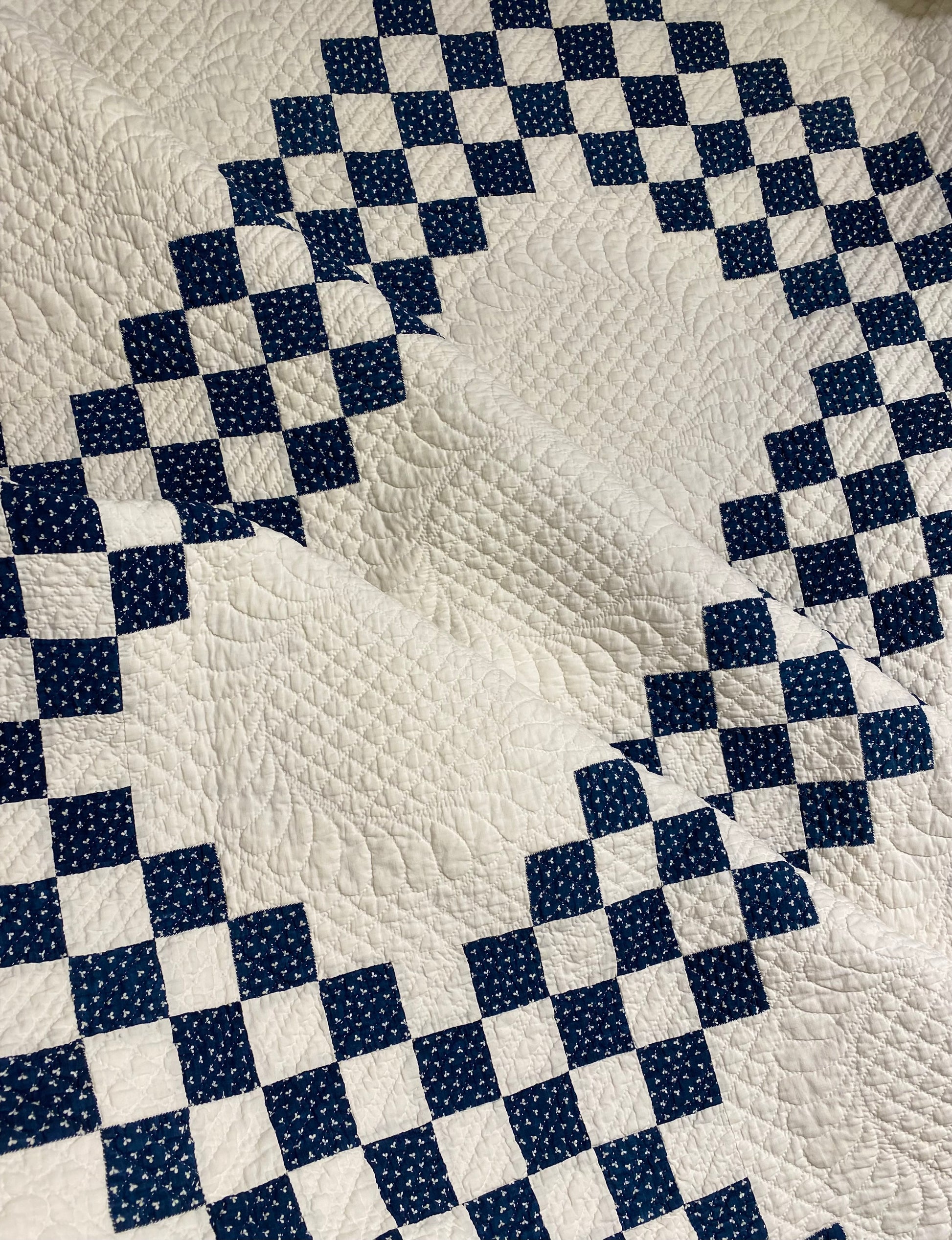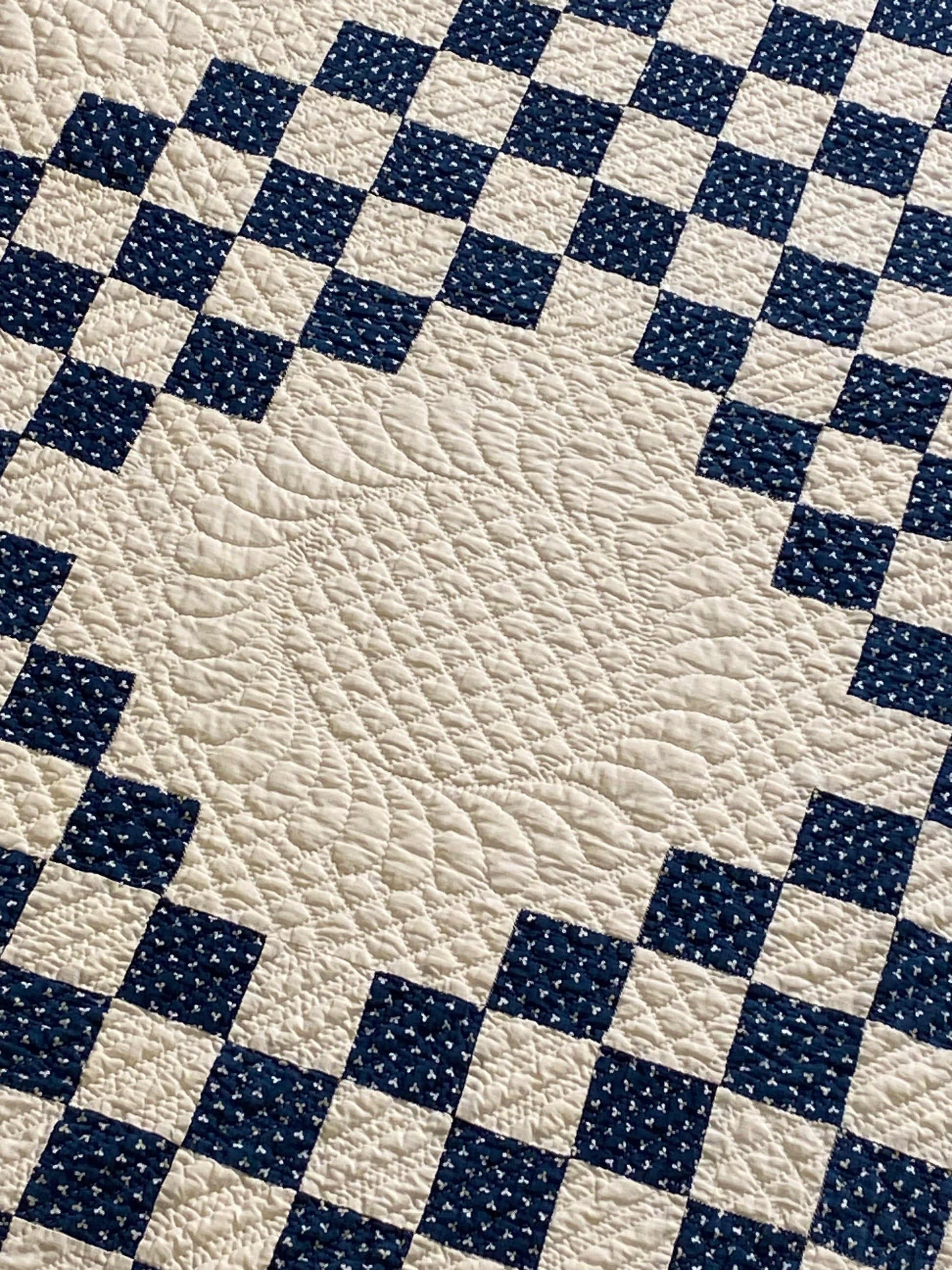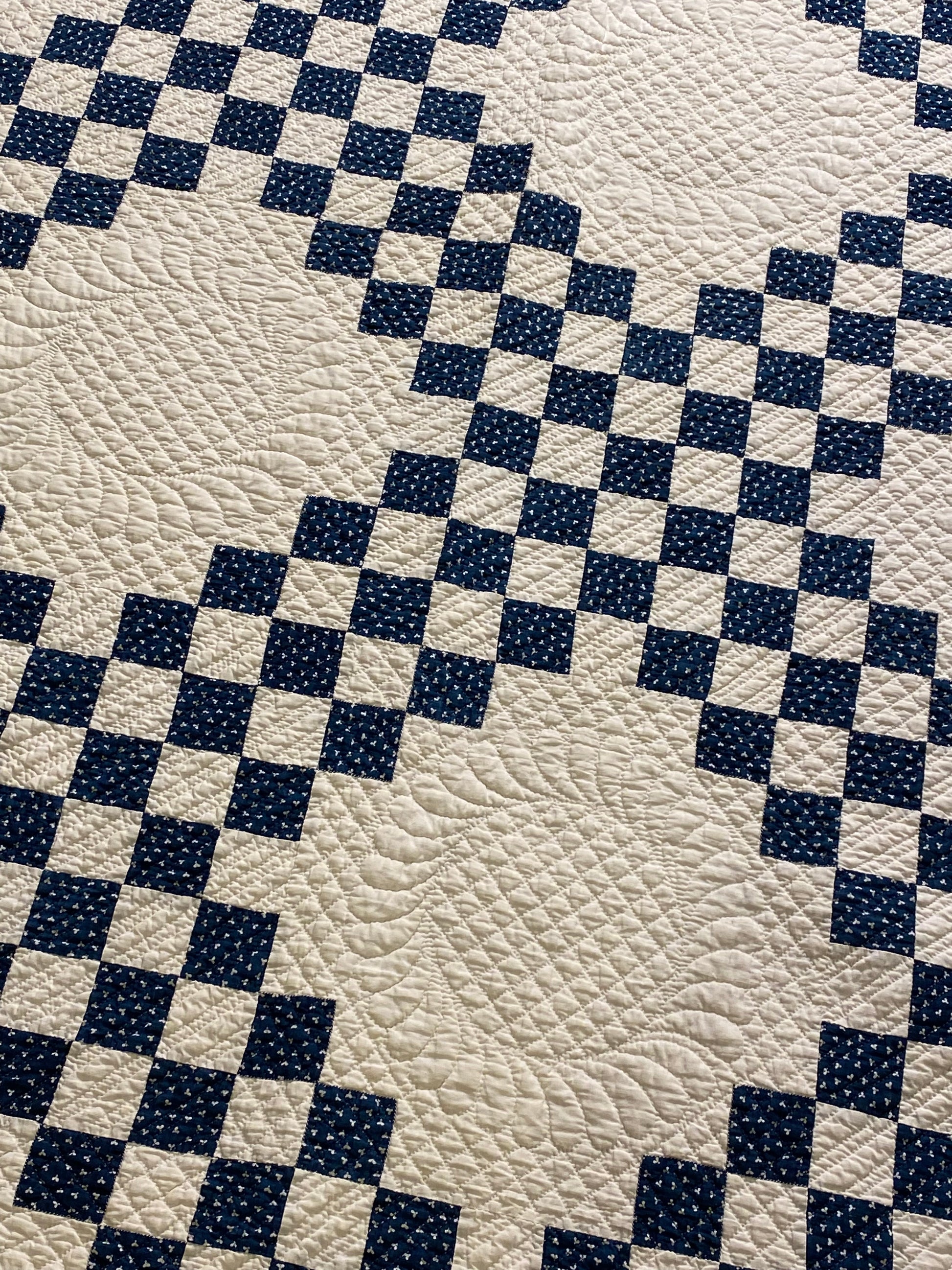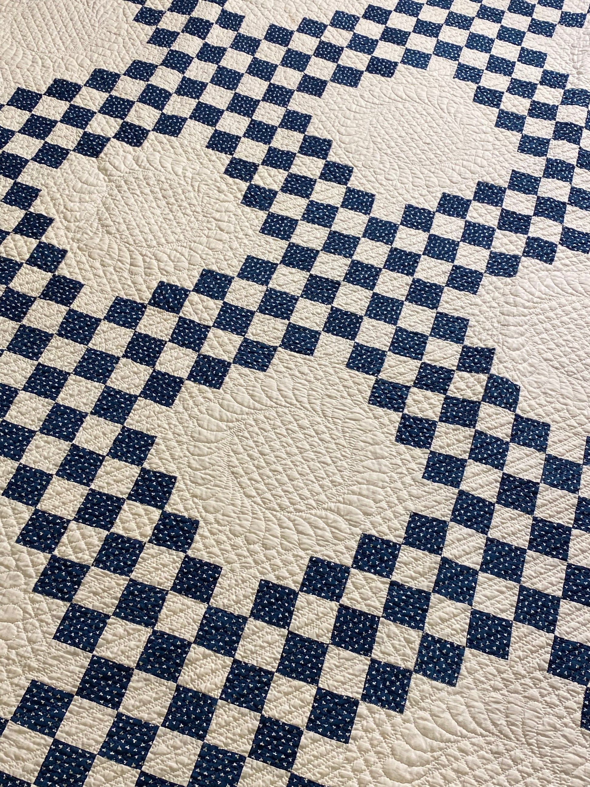 This glorious blue and white Triple Irish Chain quilt has the finest of hand quilting and details.