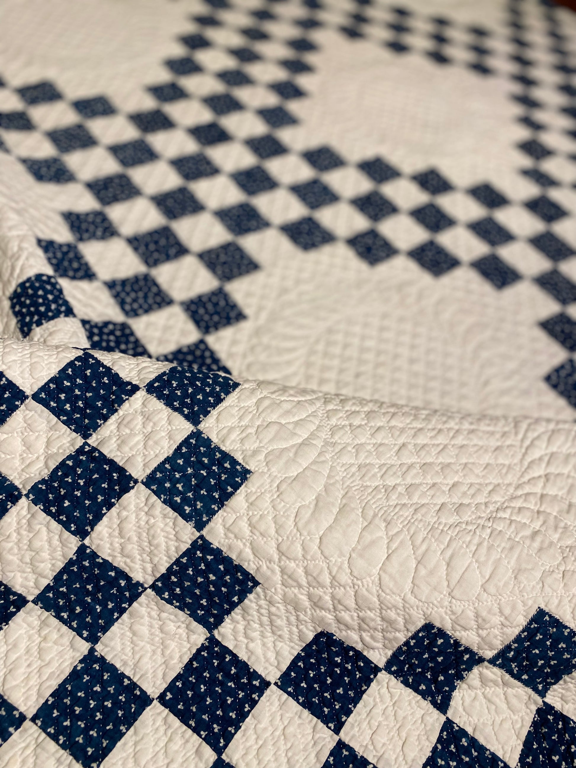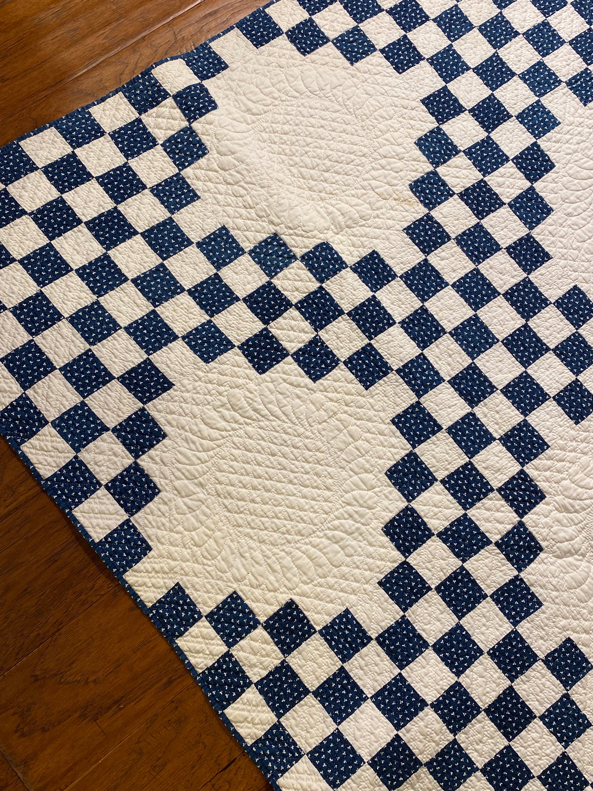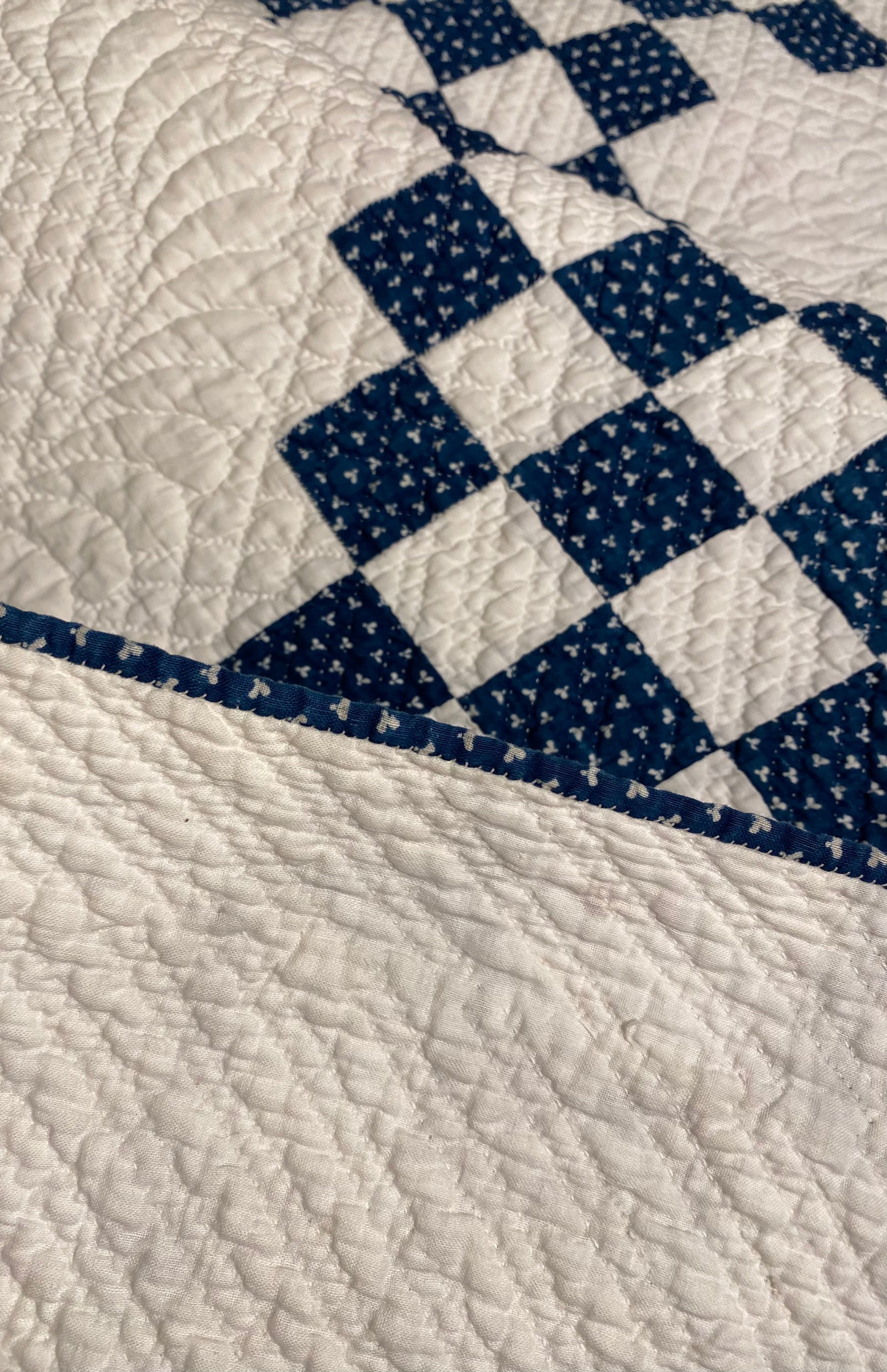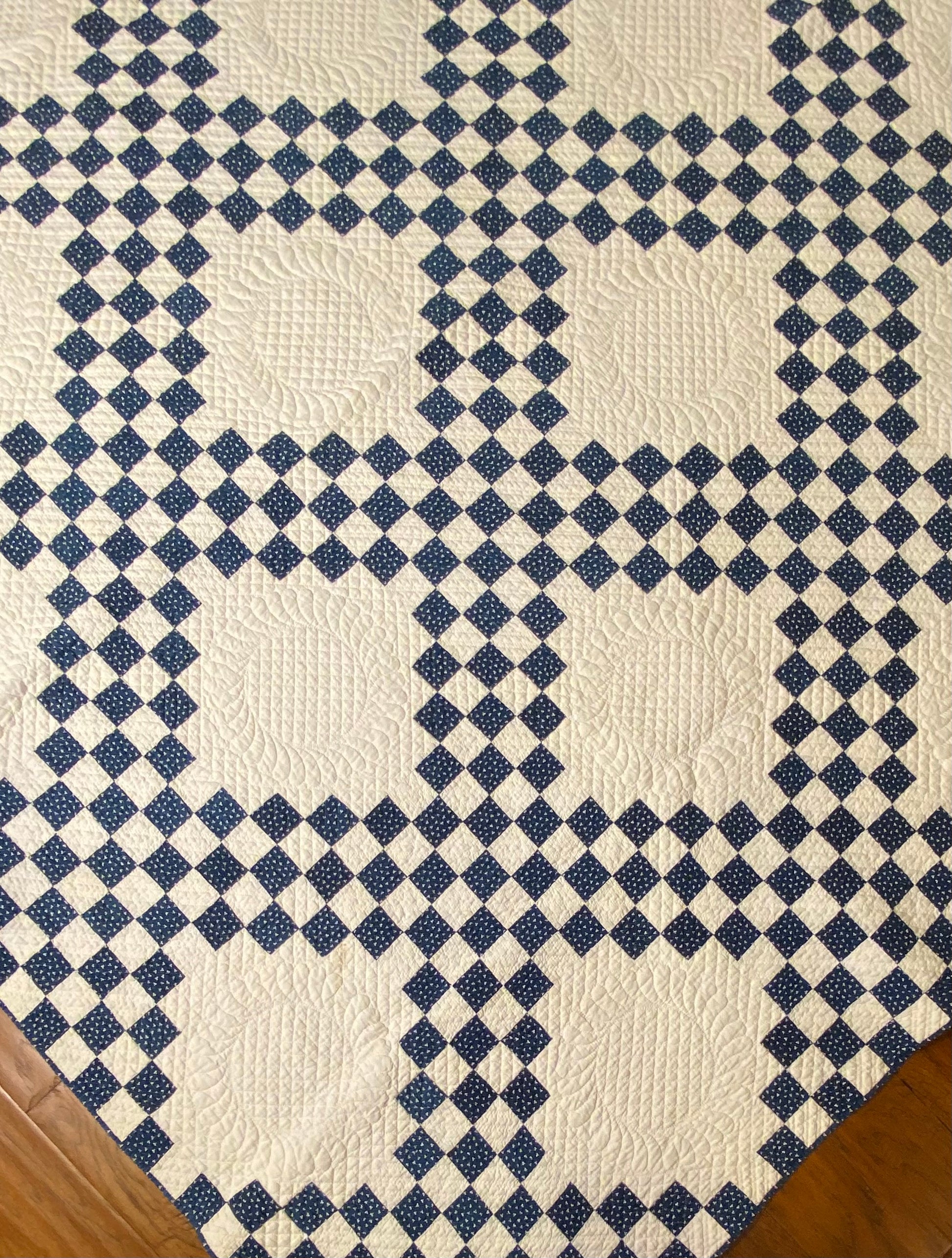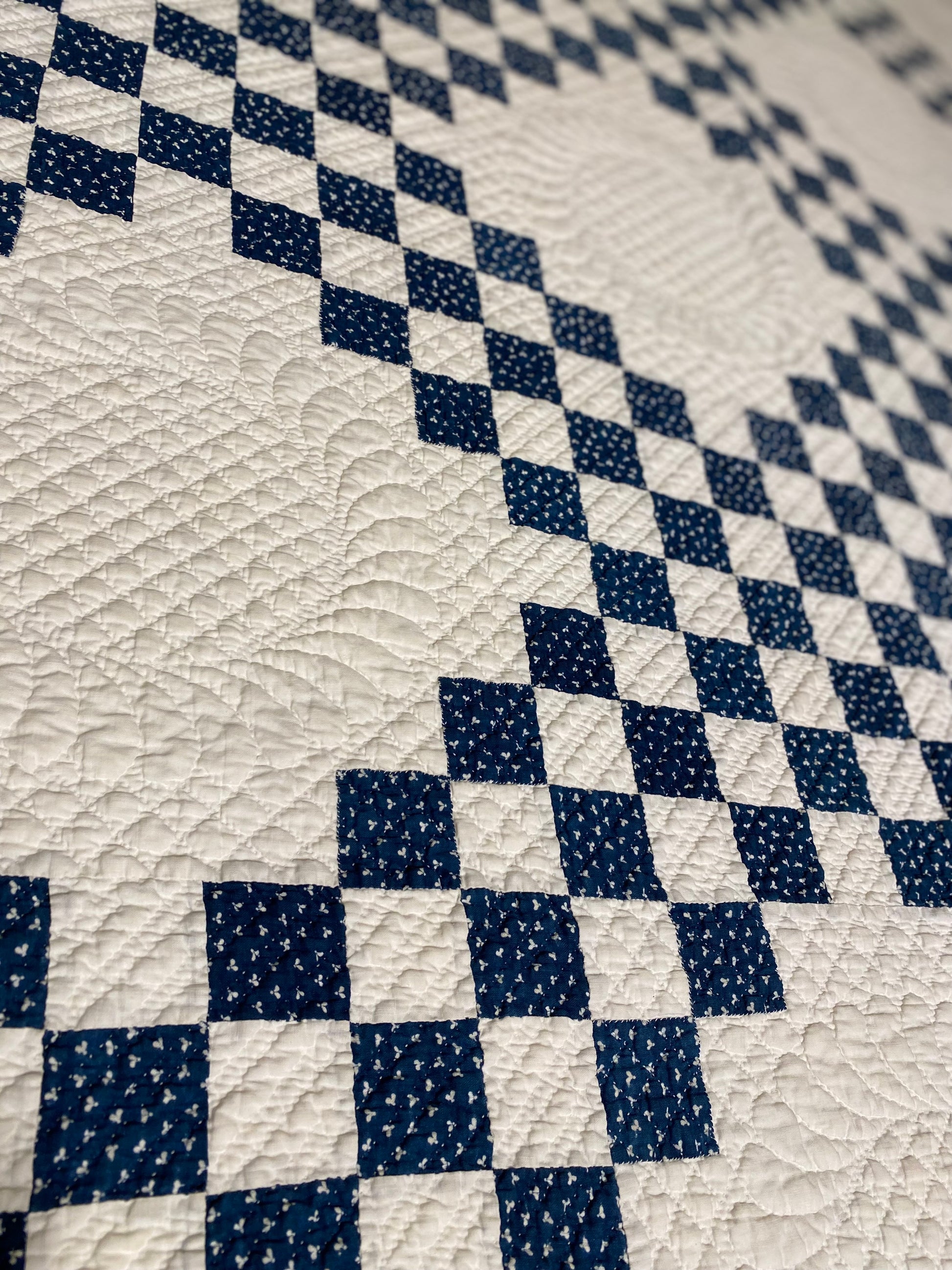 This glorious blue and white Triple Irish Chain quilt has the finest of hand quilting and details.
