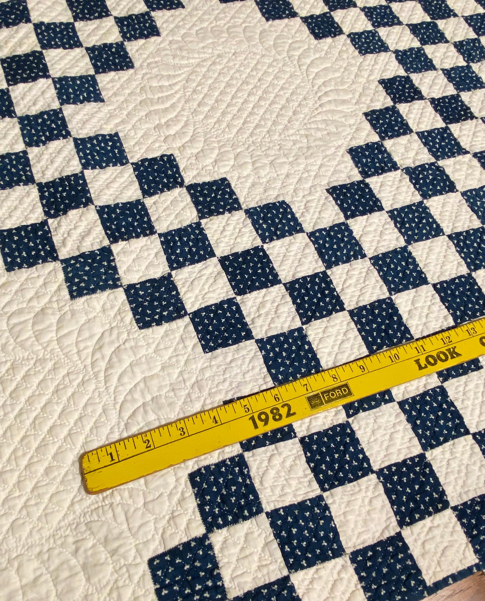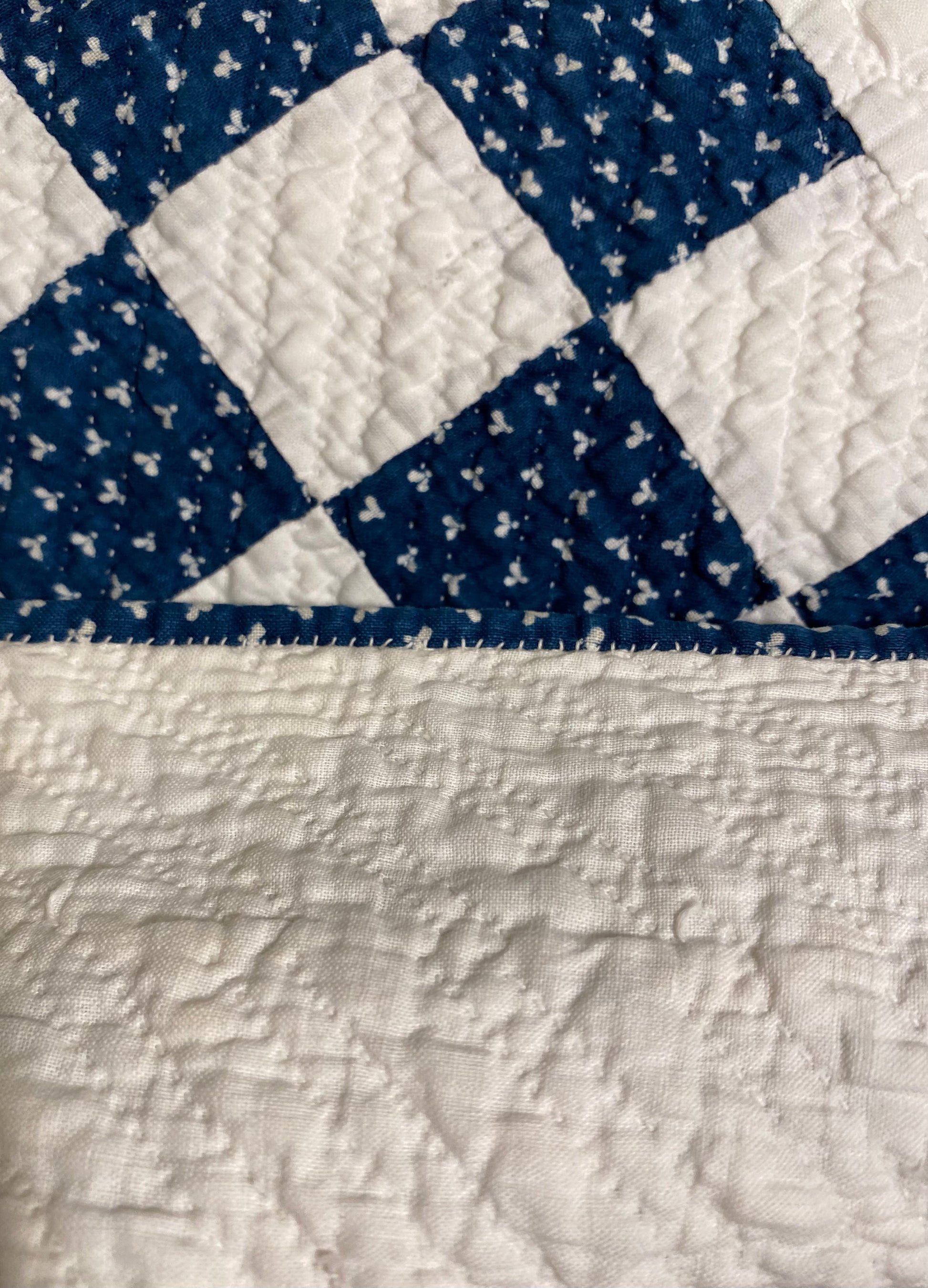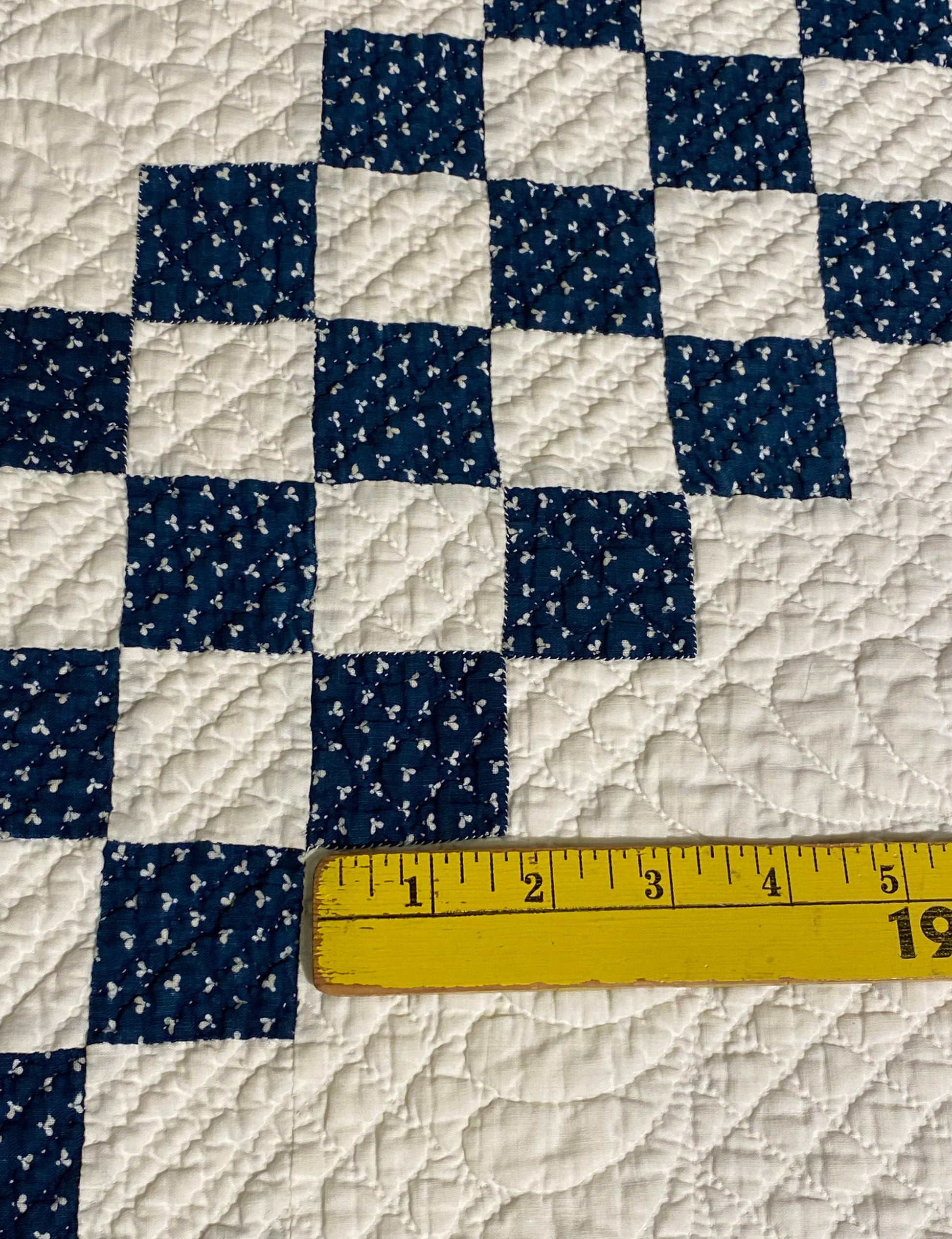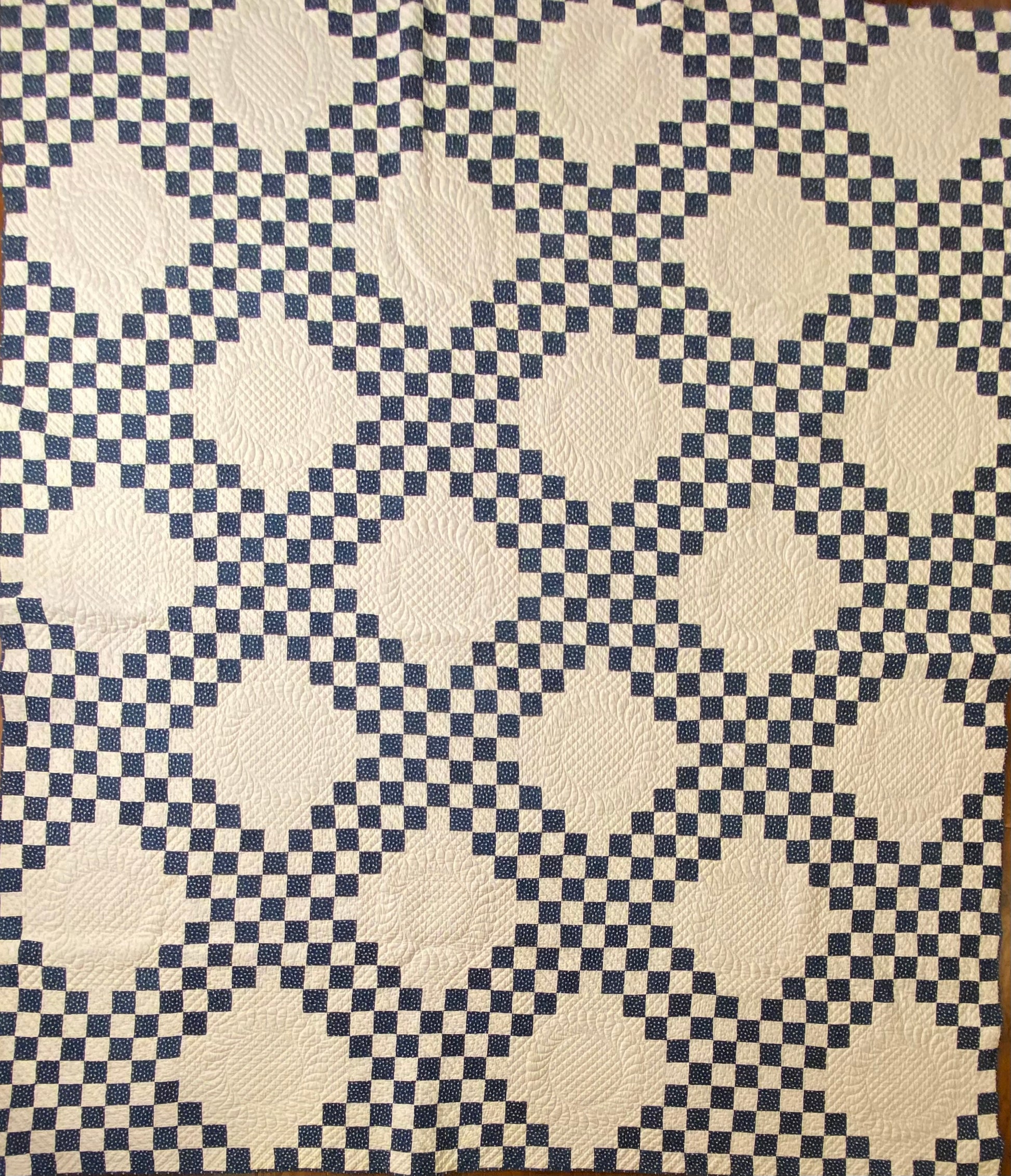 This glorious blue and white Triple Irish Chain quilt has the finest of hand quilting and details.
