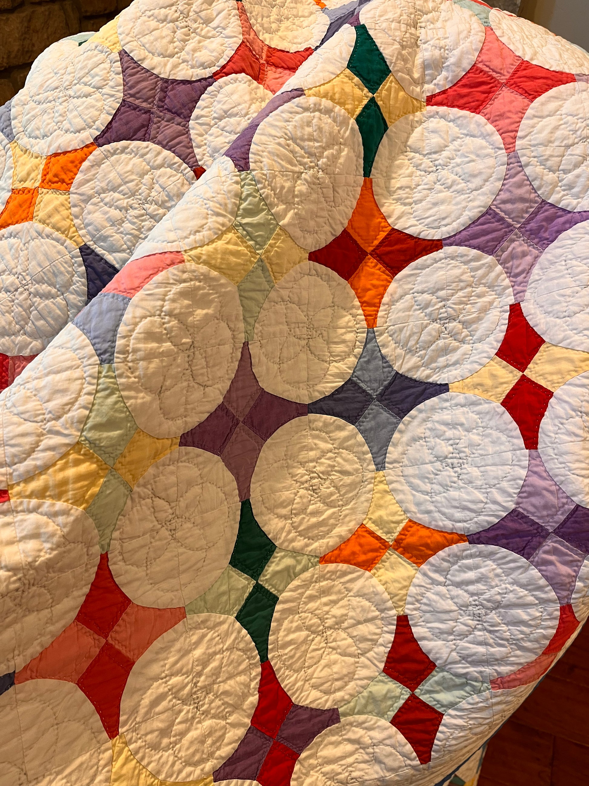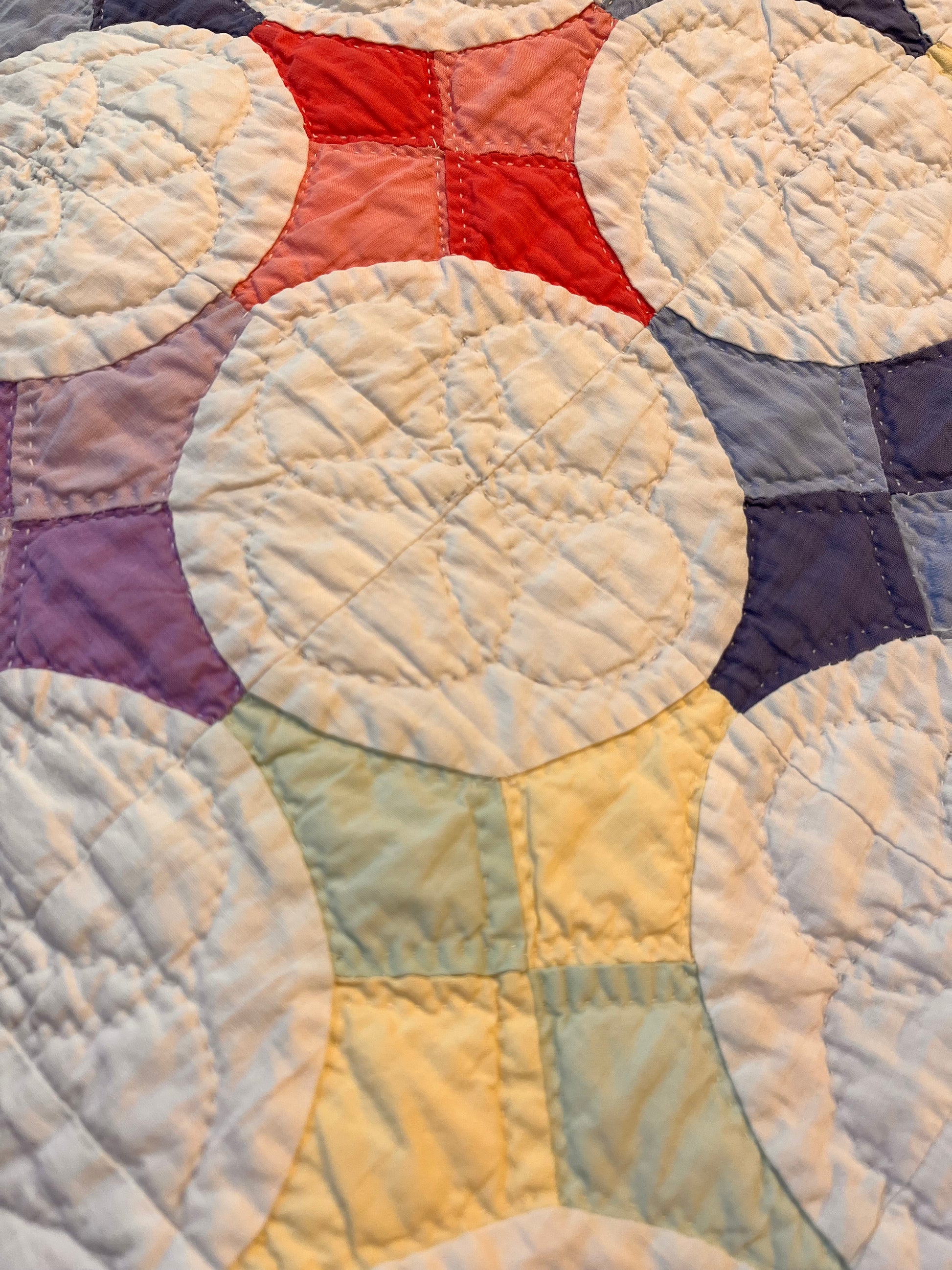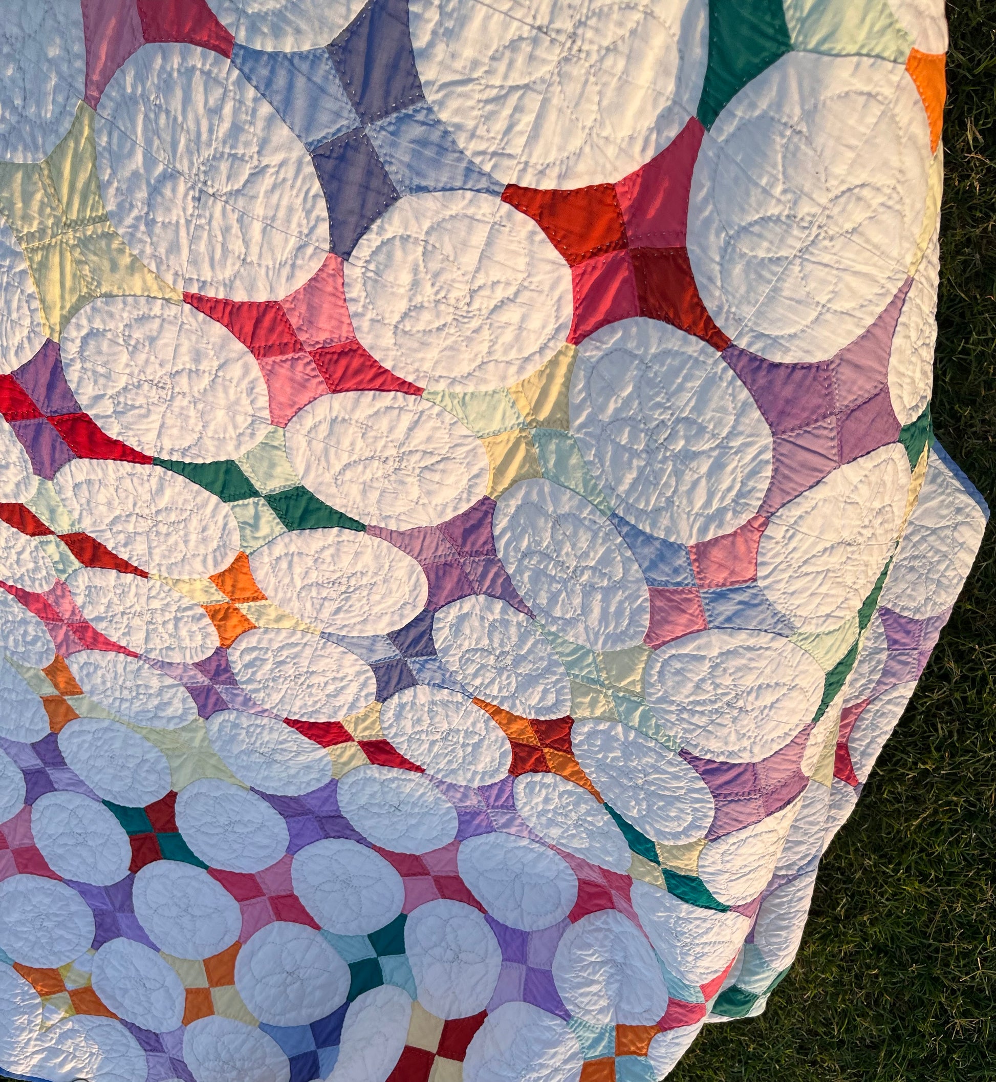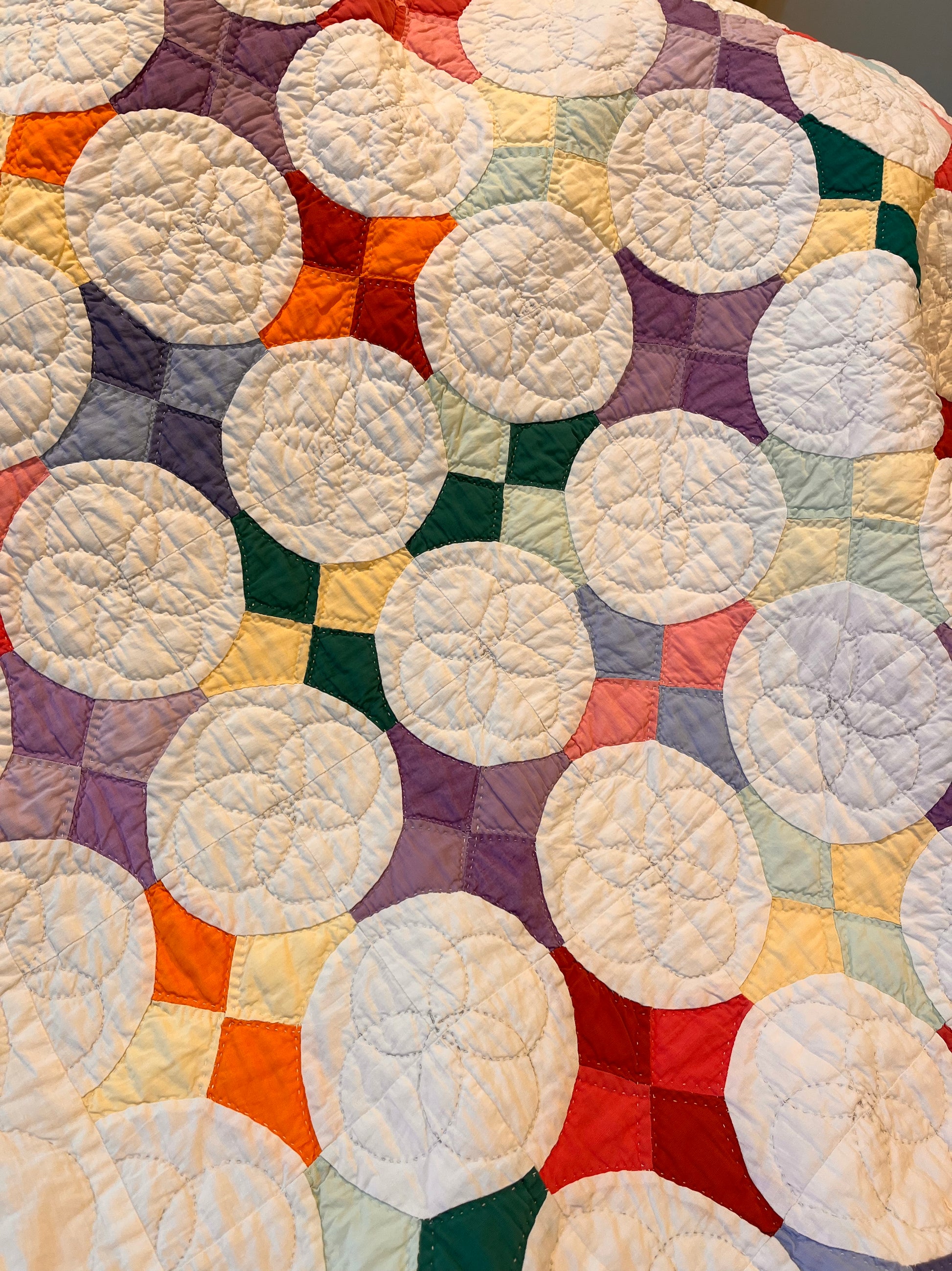 Nicely hand quilted. Note the neat interlocking circles design quilted in-between the pattern. Imagine a quilter maybe using a jar or glass for the design.