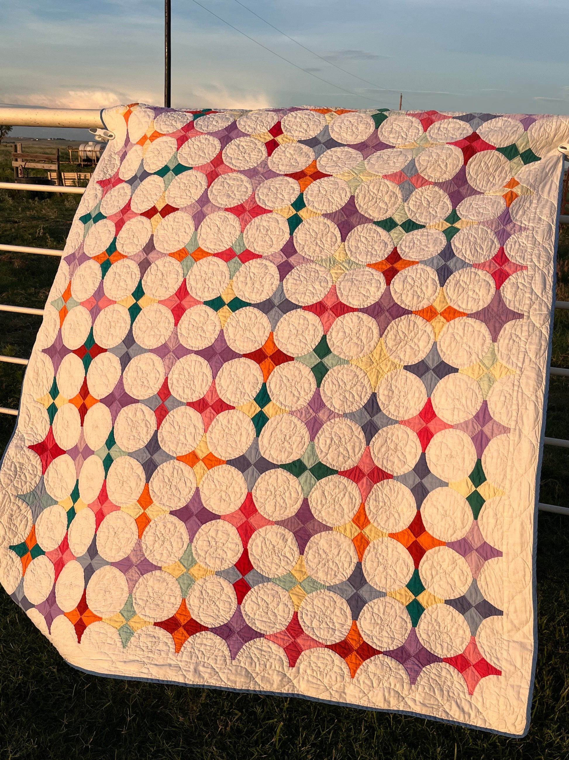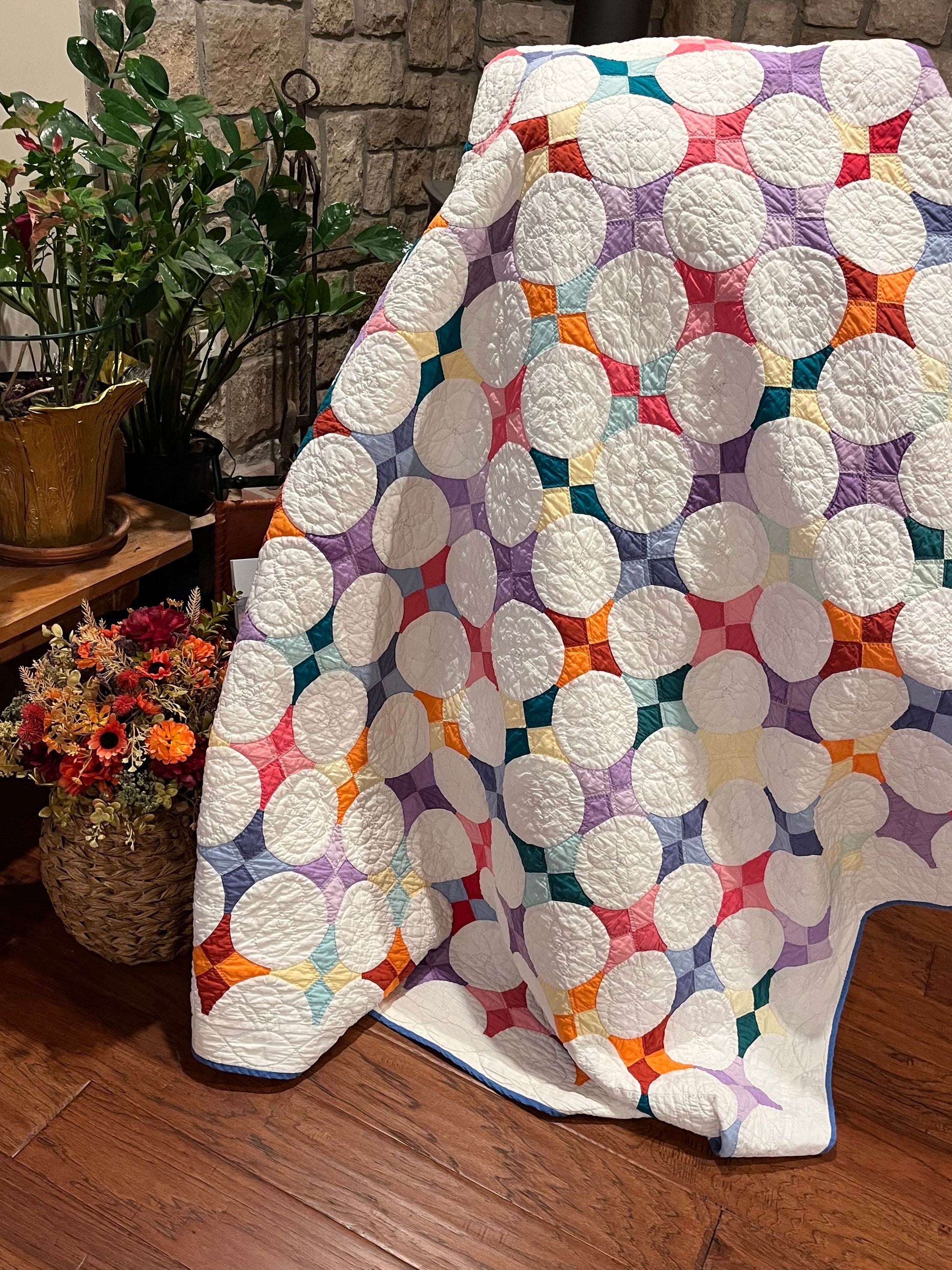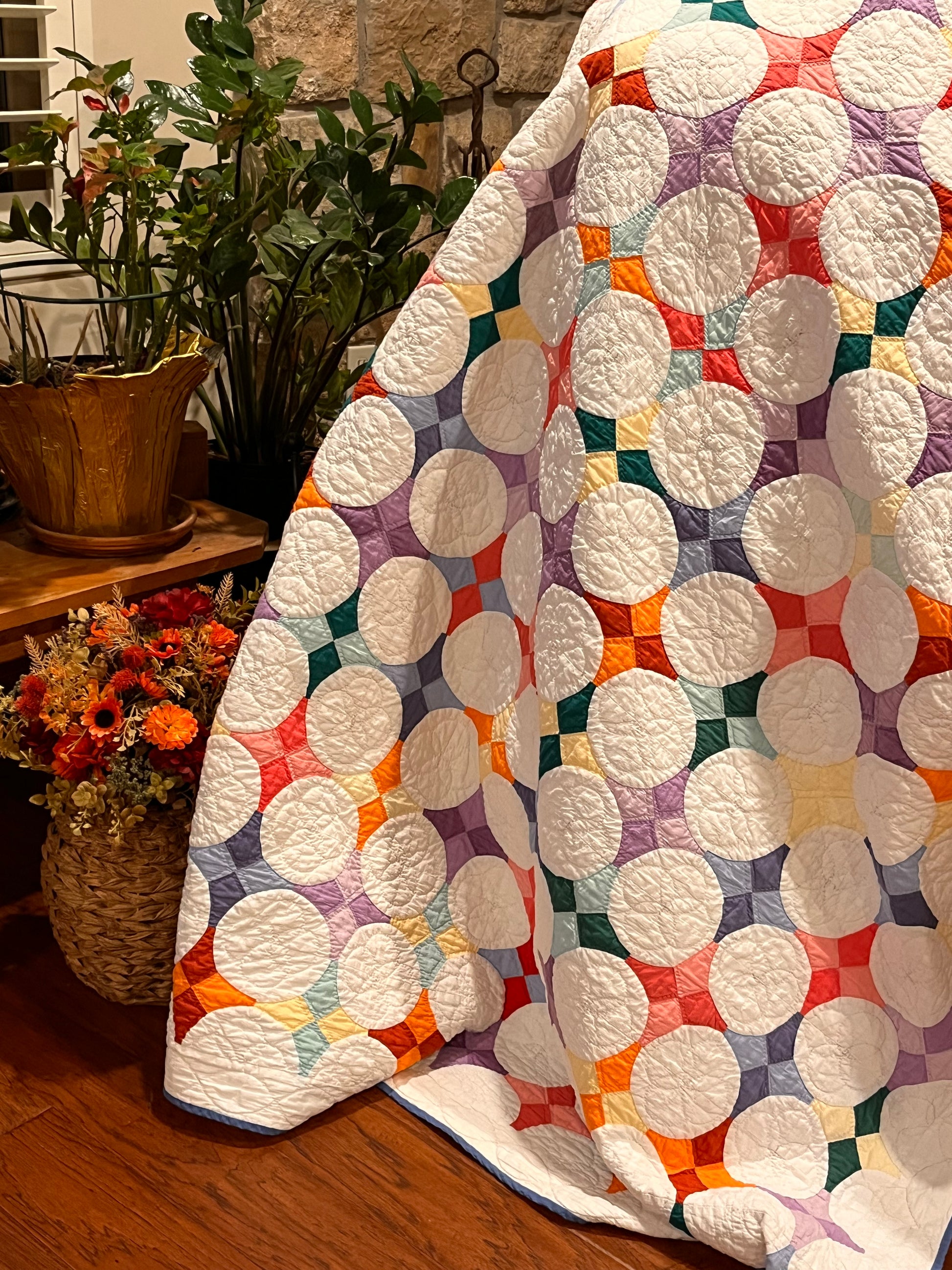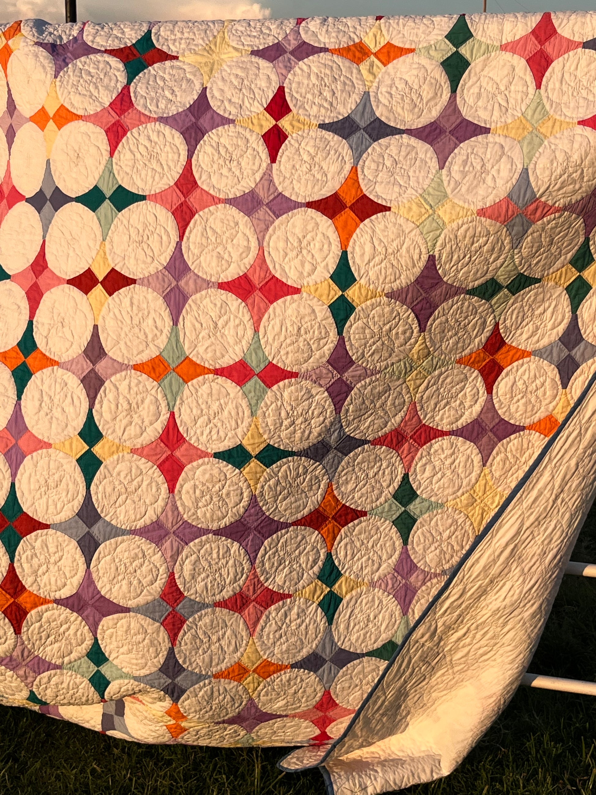Nicely hand quilted. Note the neat interlocking circles design quilted in-between the pattern. Imagine a quilter maybe using a jar or glass for the design.