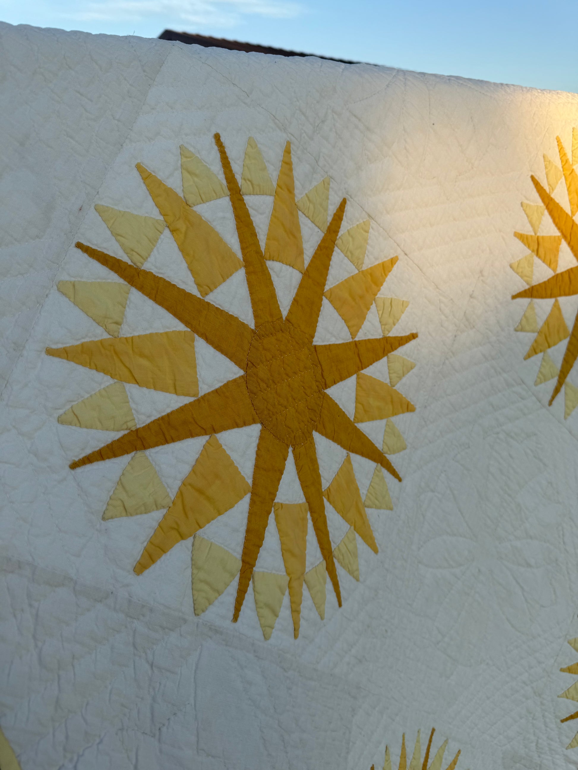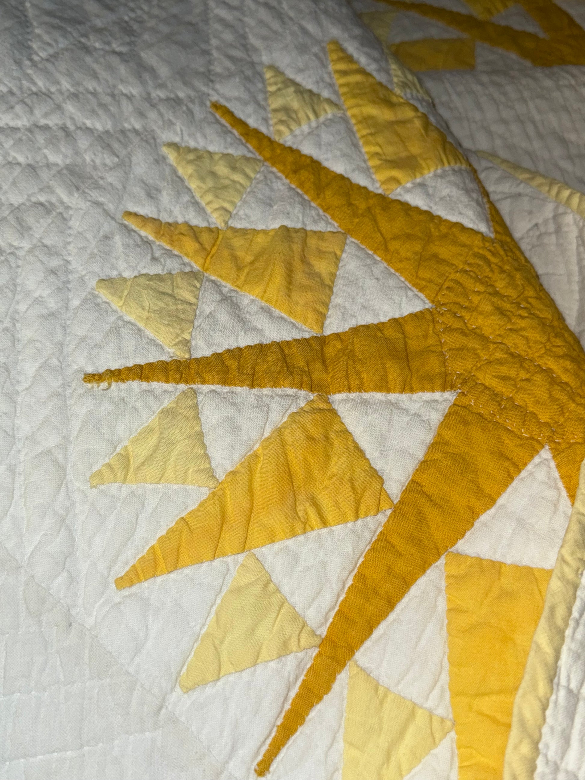 This outstanding design, a Mariners Compass quilt in yellows/melon and white is a beauty. The design also has a Sunburst look.