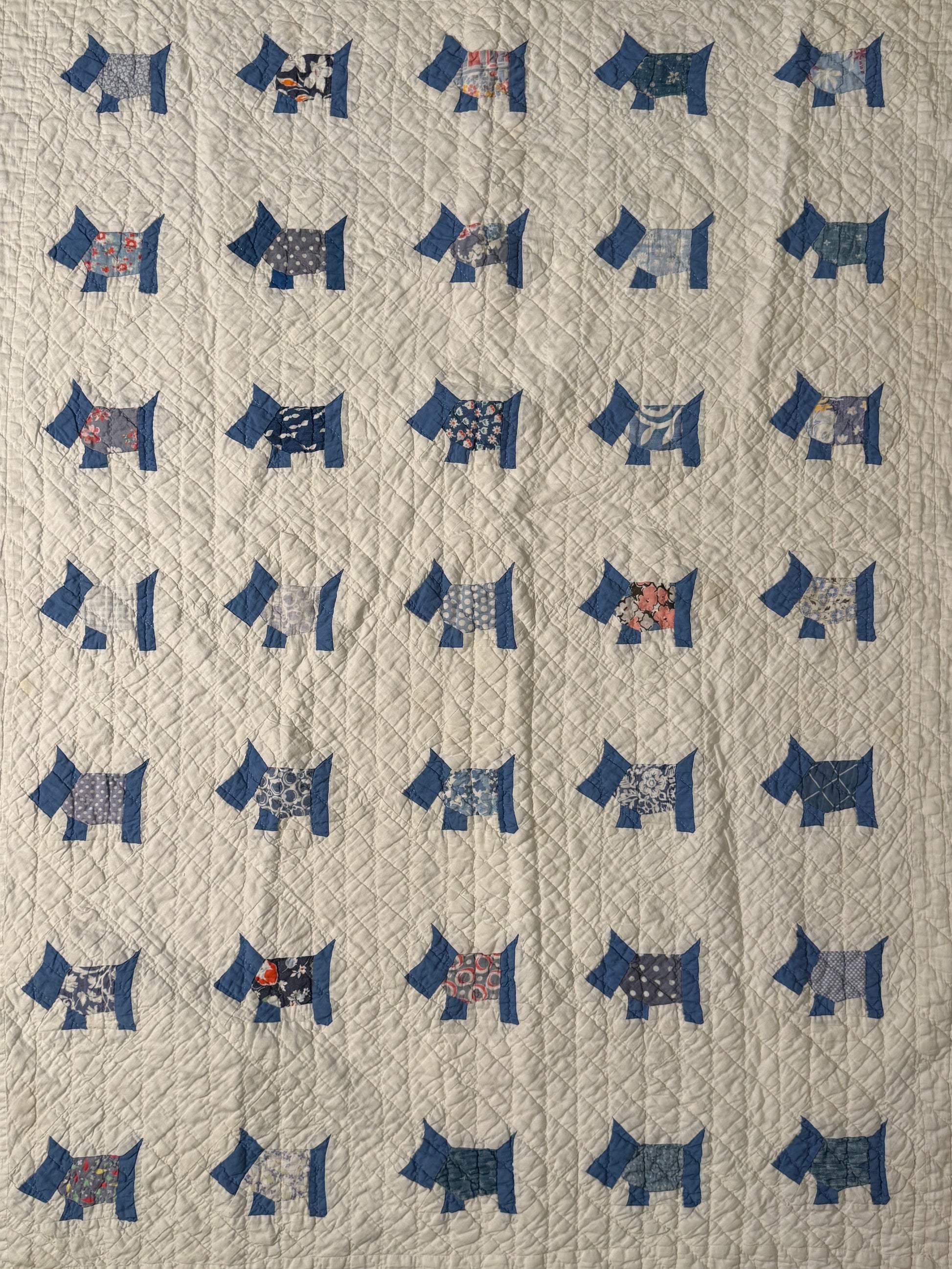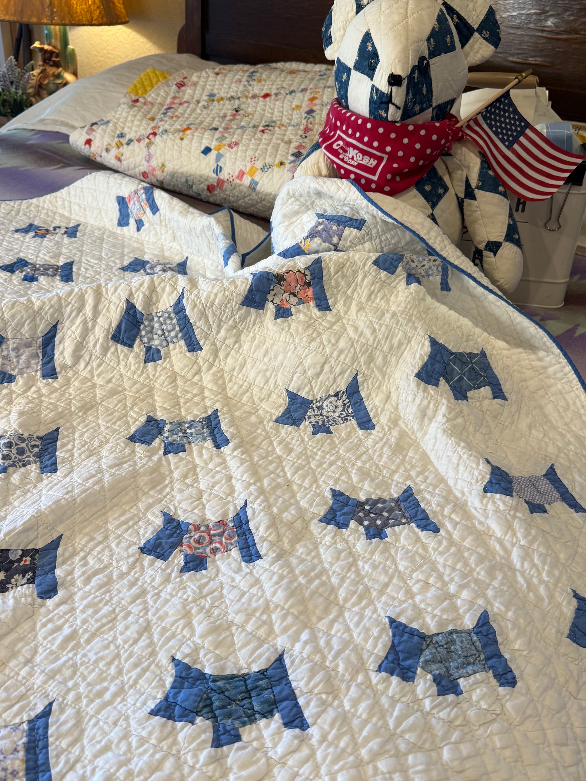 Super charming original size Scottie Dog quilt. This one is really quite a unique one with the really small scale pattern of Scotties. There are 35 Scottie blocks!!