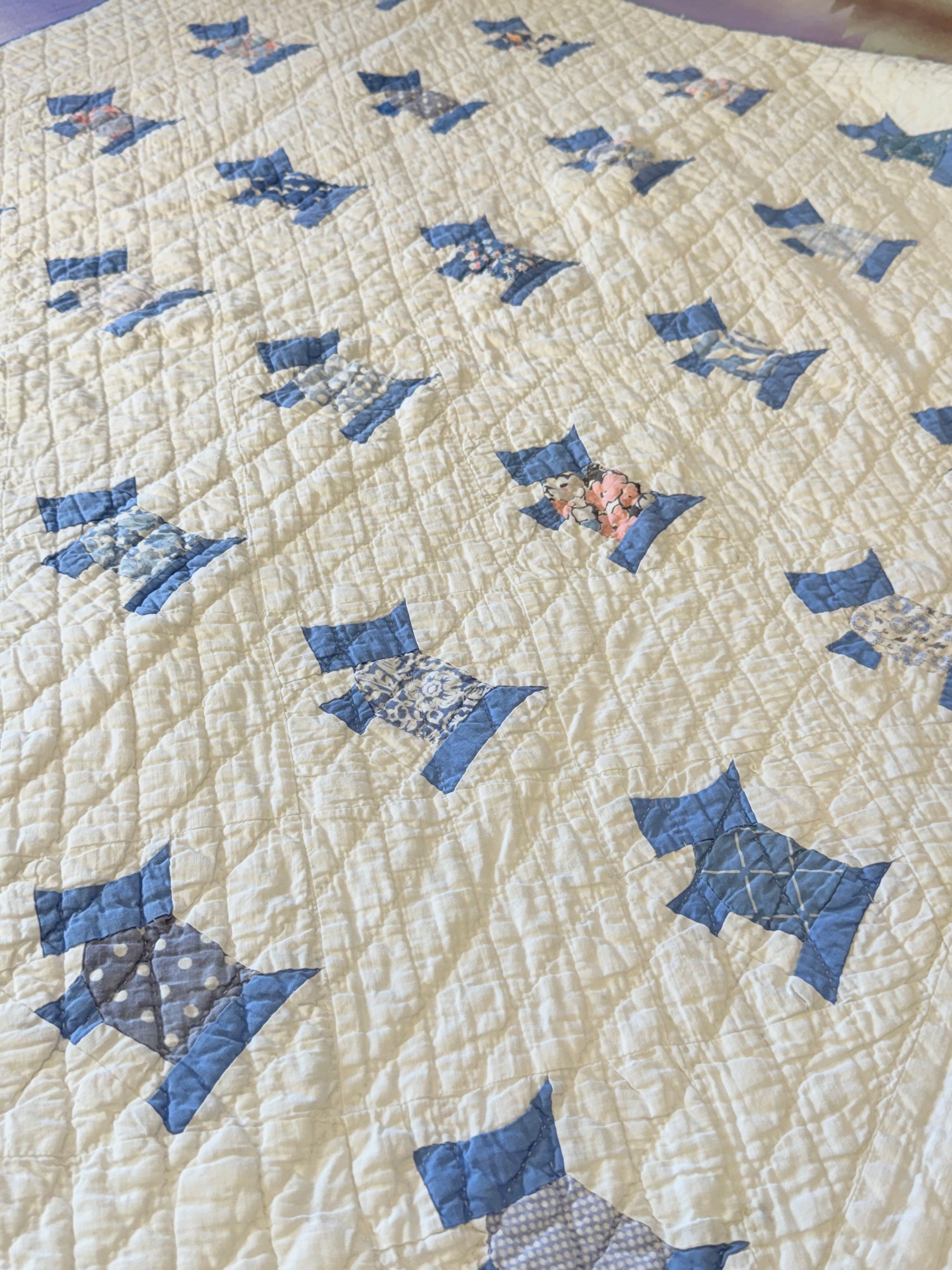 Made with solids and prints. Many of the prints are what look like feedsack fabrics, and actually some of the fabrics in the blocks are an earlier or a 1900’s blue, but dating it to the newest fabrics used.
