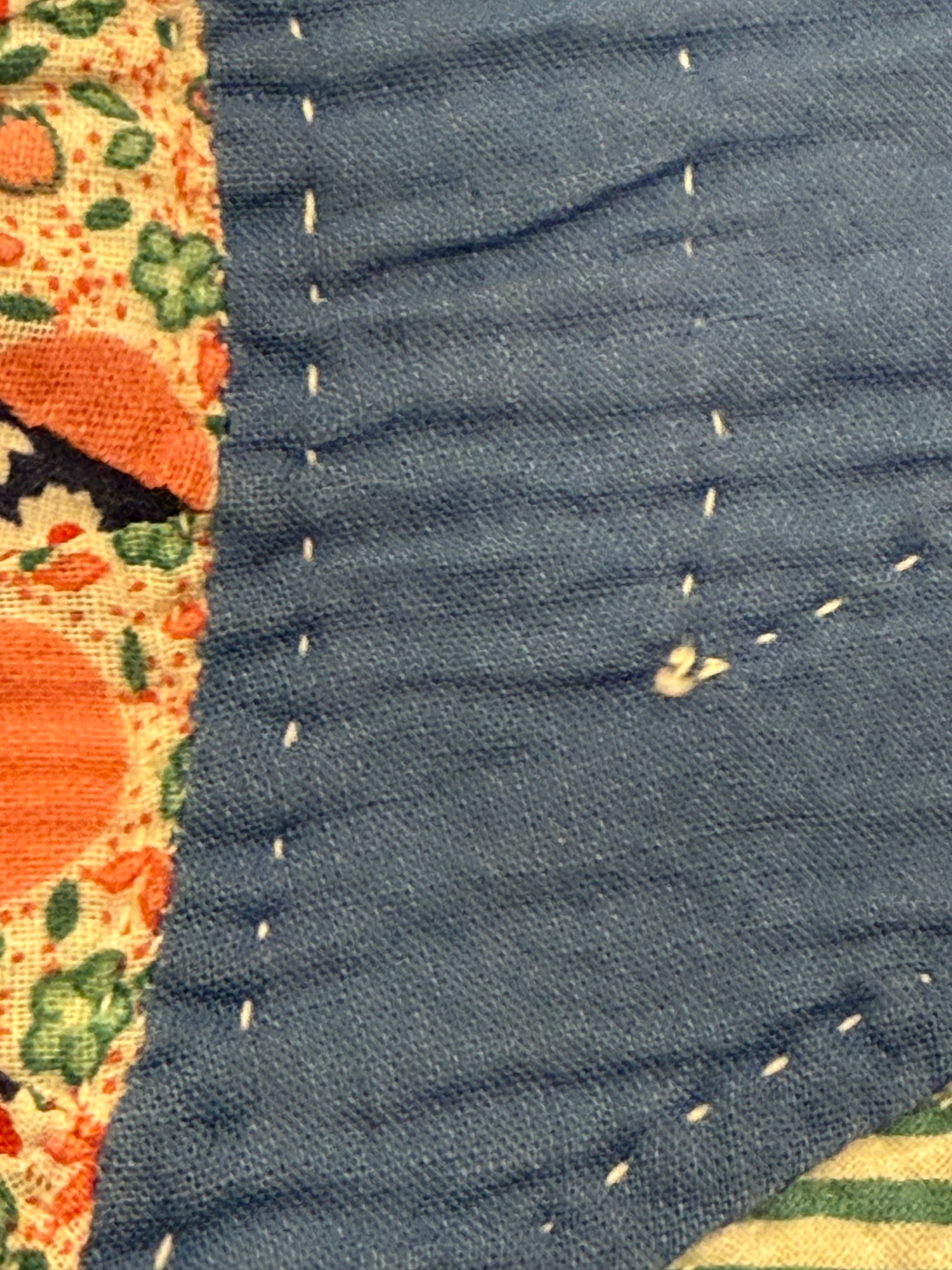 I love the details of this hand quilted beauty as the maker left their knots on the top (not on the back of the quilt as generally seen) and the ground is blue instead of the traditional white.