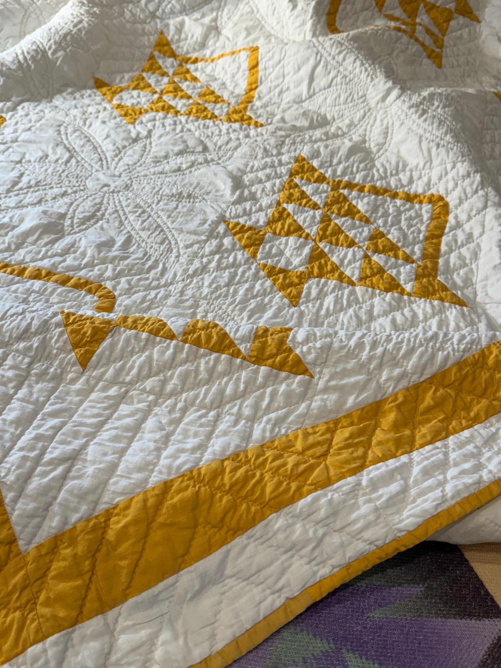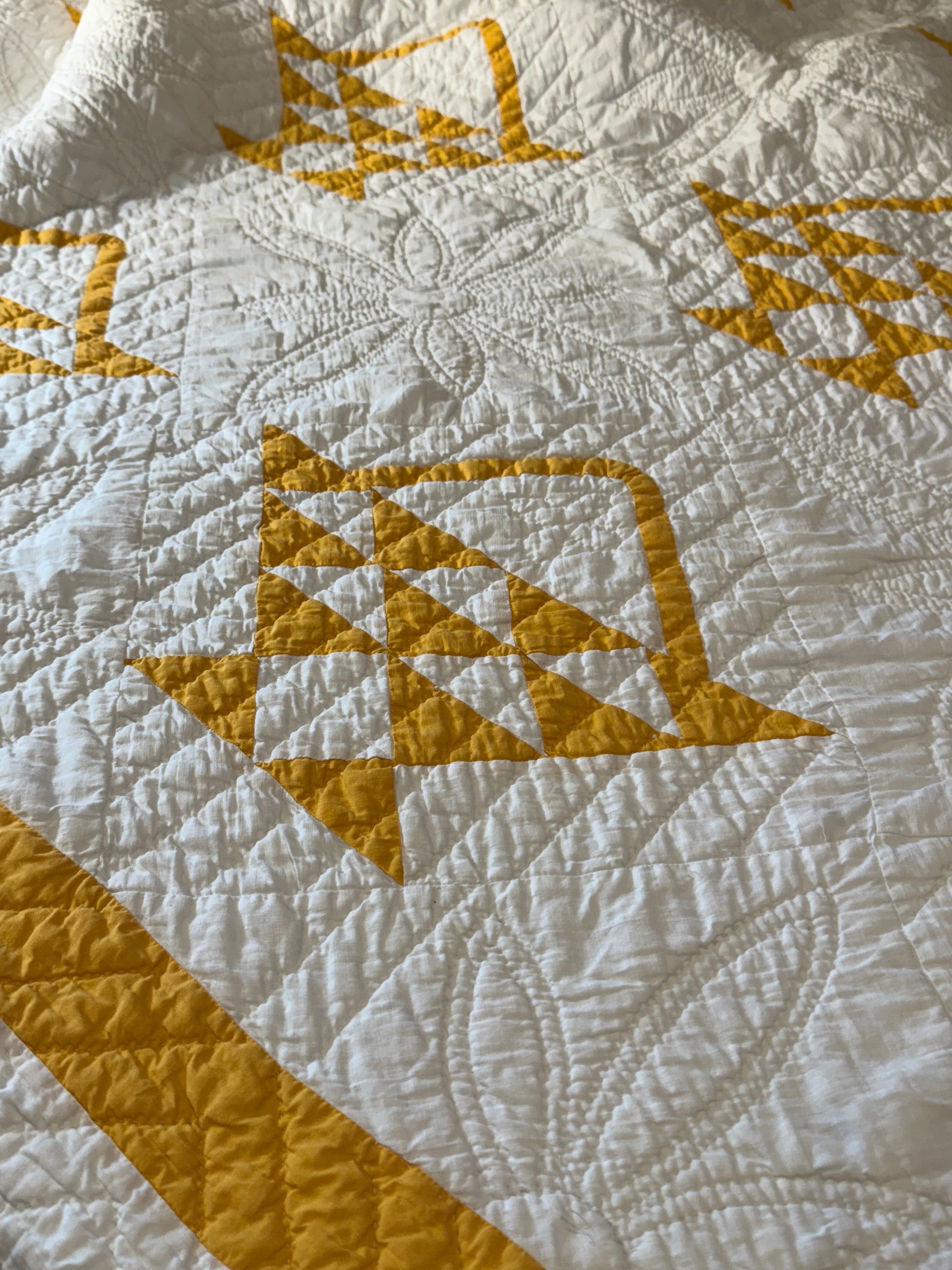 A circa 1890’s hand quilted quilt. See the detailed quilting designs on the quilt in the many images. The designs look like dahlias or daisies.