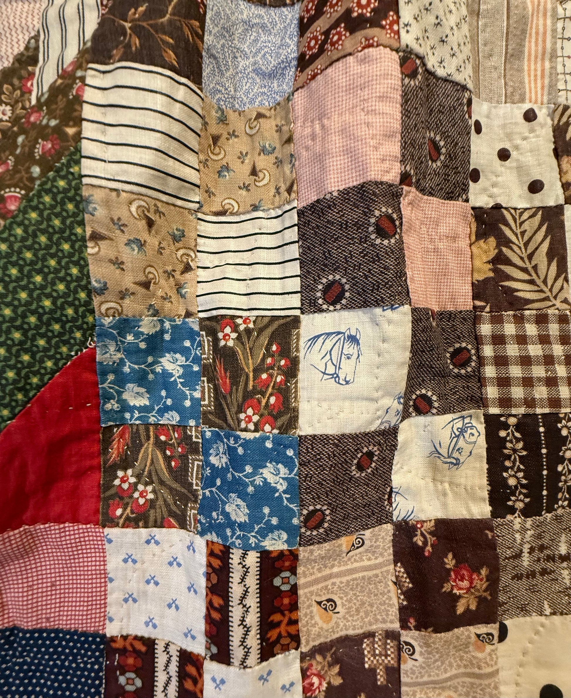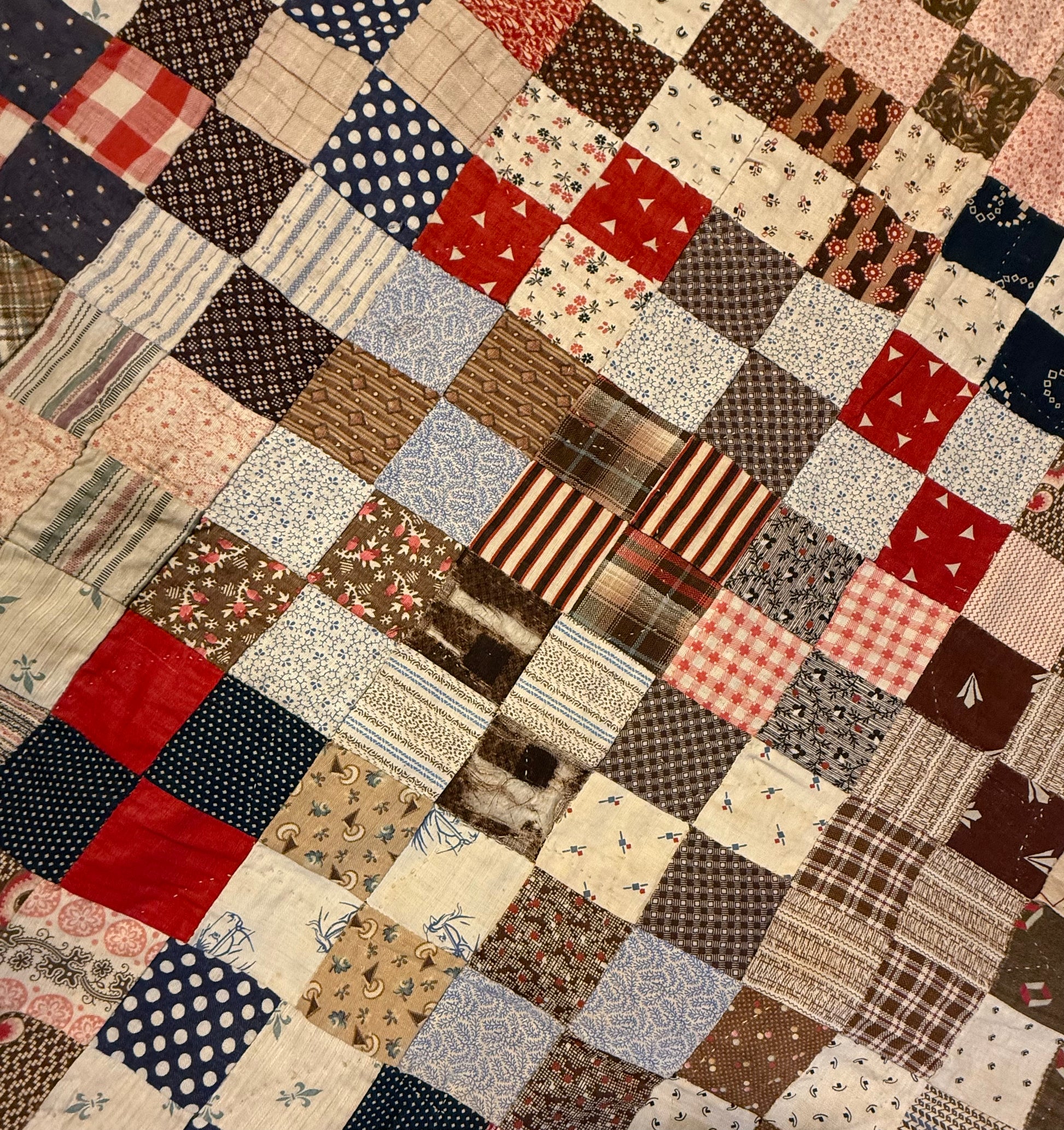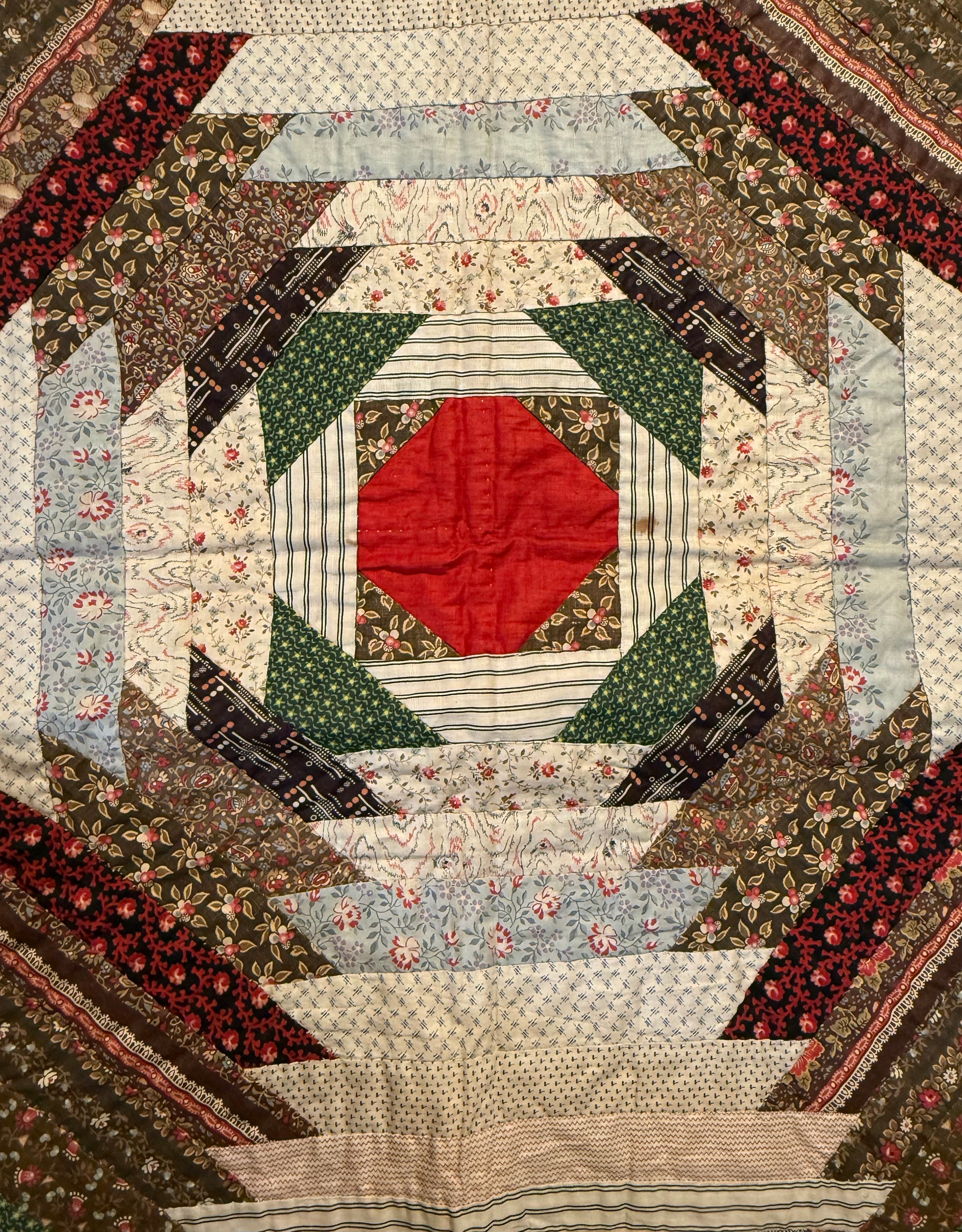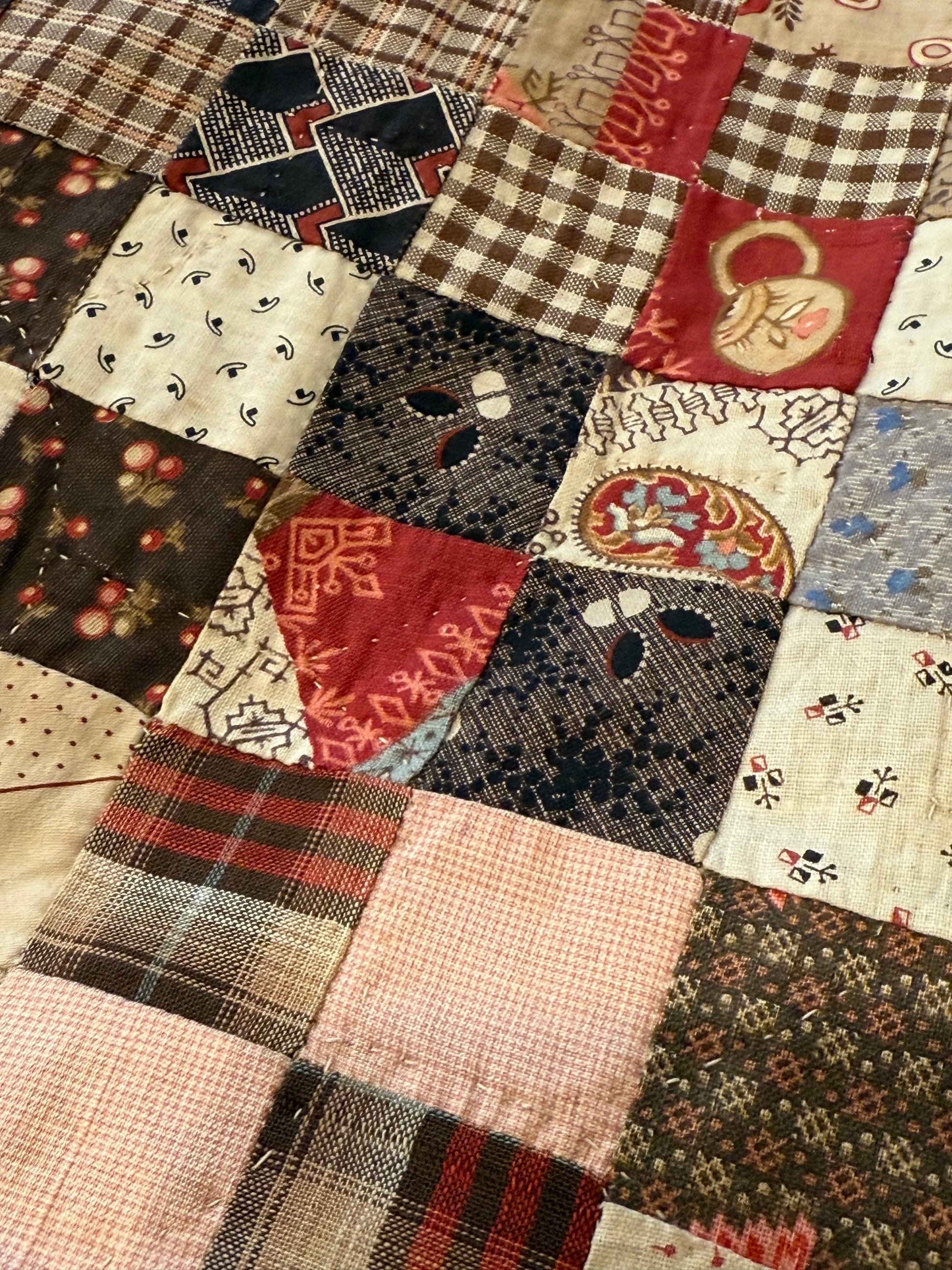 Circa 1870/80’s. I’m seeing fabrics of madder, shirtings, paisleys, checks, plaids, reds, many browns, some blues, greens, and so much more.