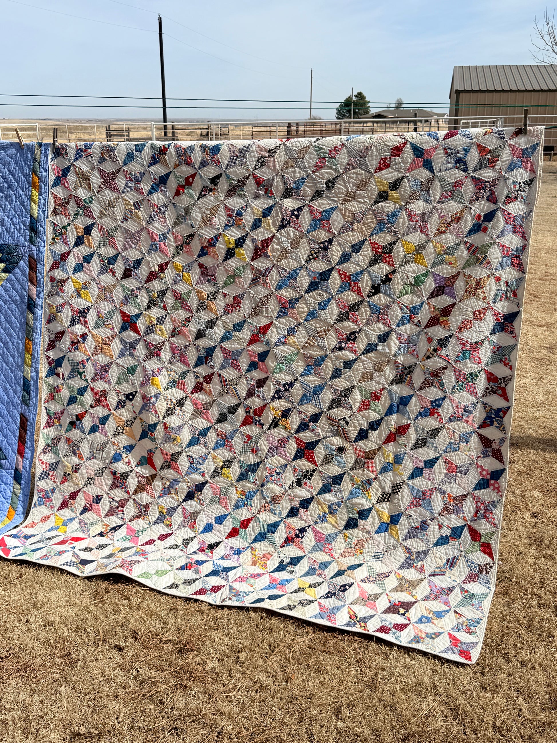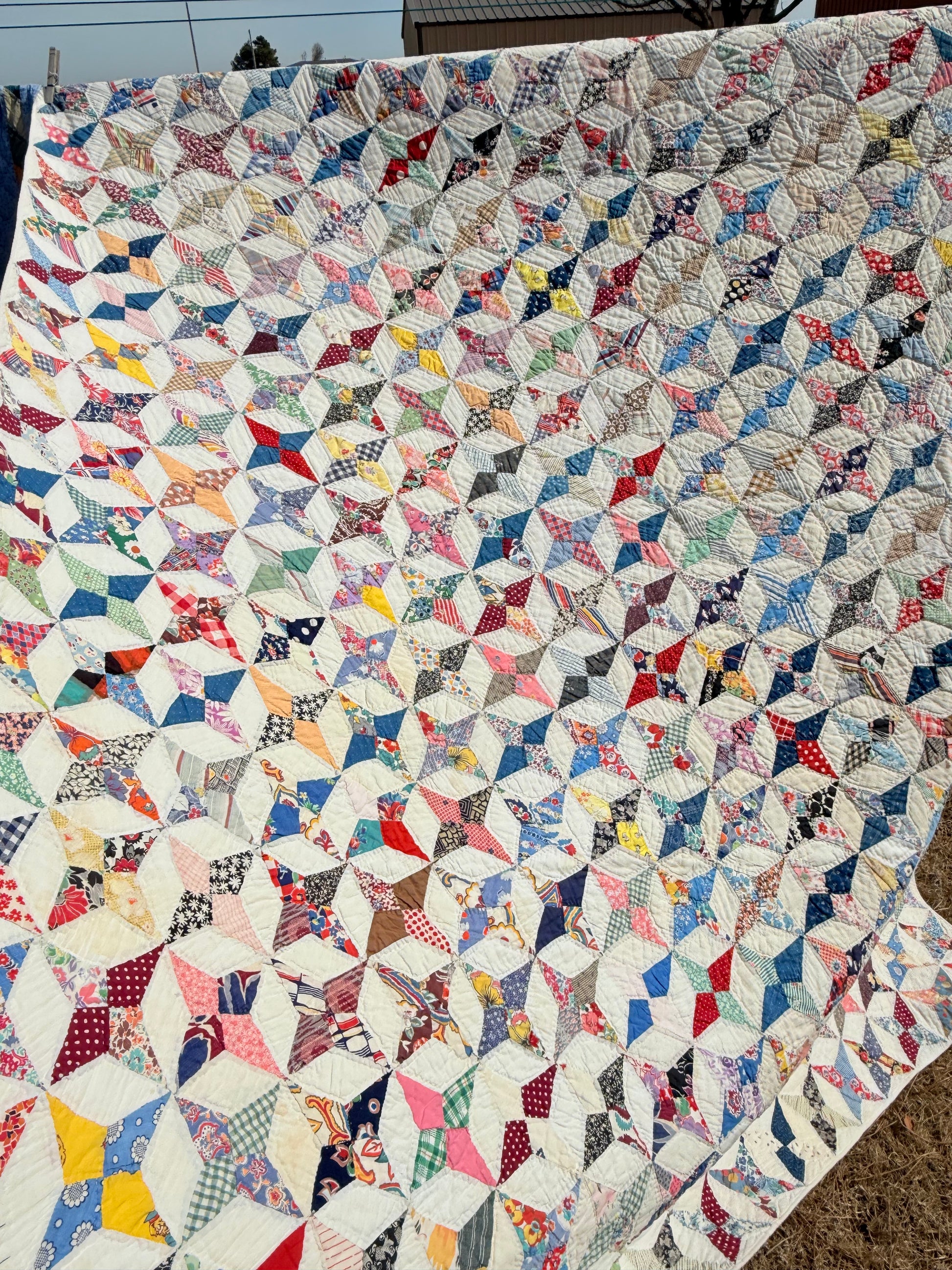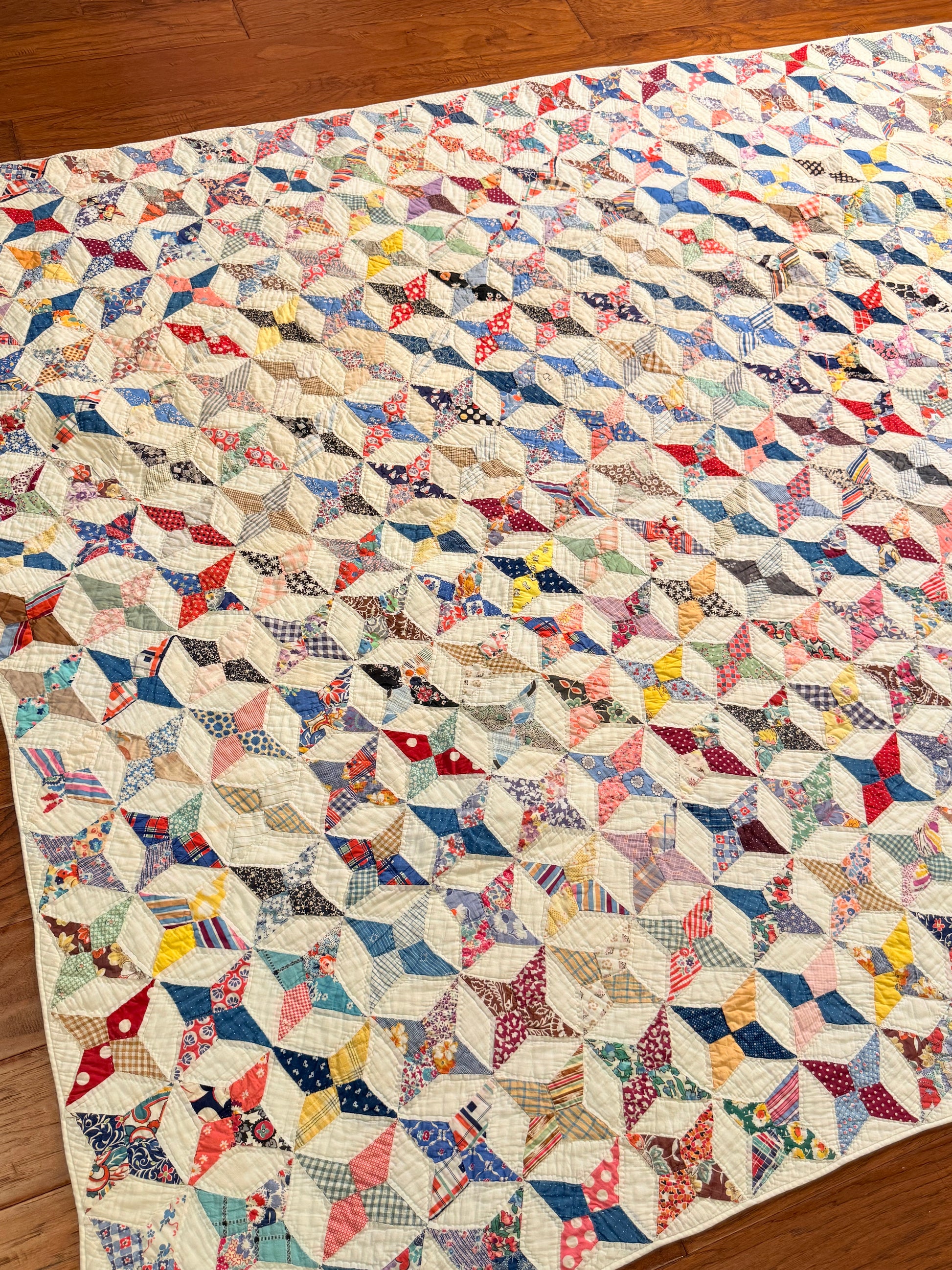 This happy quilt of so many small scale Touching Stars is wonderfully made and in excellent condition. The hand piecing and all the hand quilting makes this a true labor of love quilt.