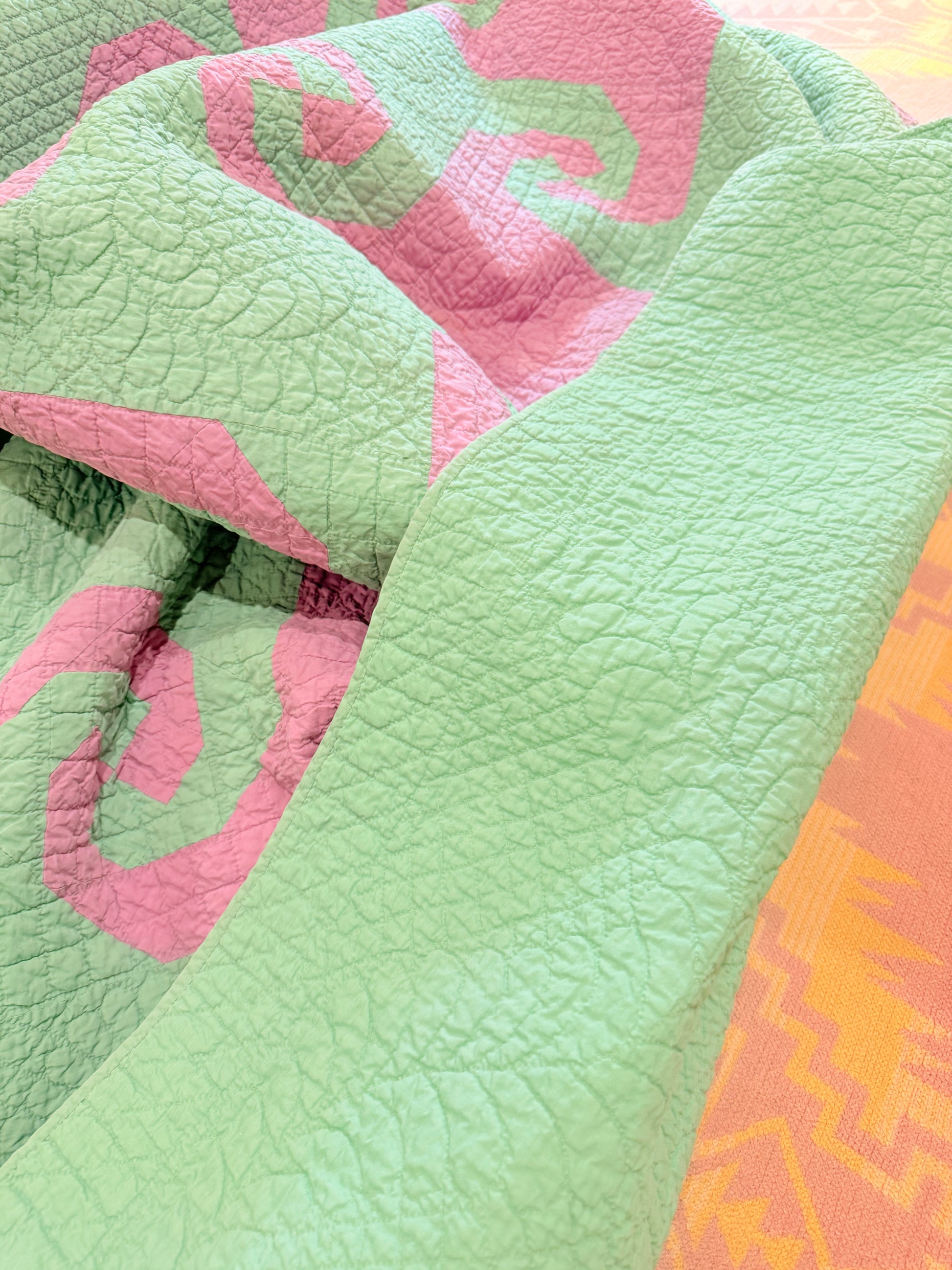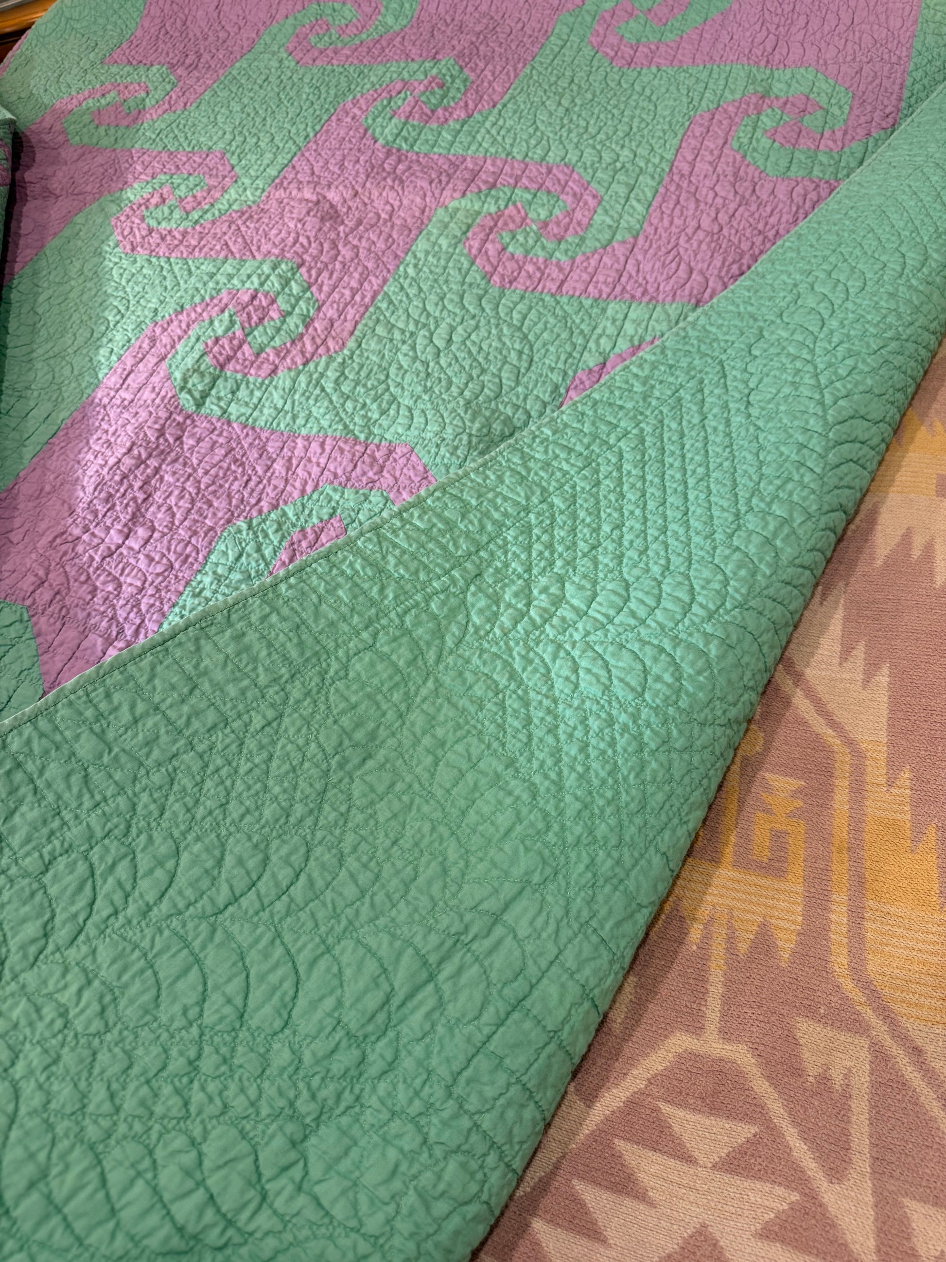 This quilt very possibly a Mennonite quilt has the finest of hand quilting and hand quilting designs.