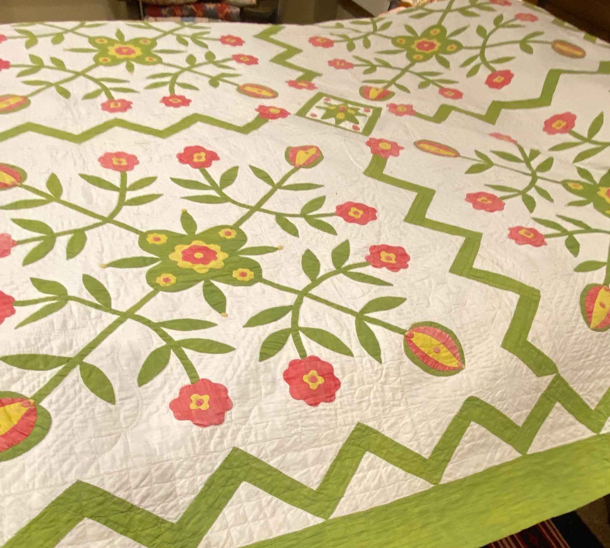 This outstanding early appliqué, a Floral 4 block Rose/Love Apple Variation with a central design and then each of the 4 blocks is framed with a zig zag like sashing and the same zig zag is around the border of the quilt.