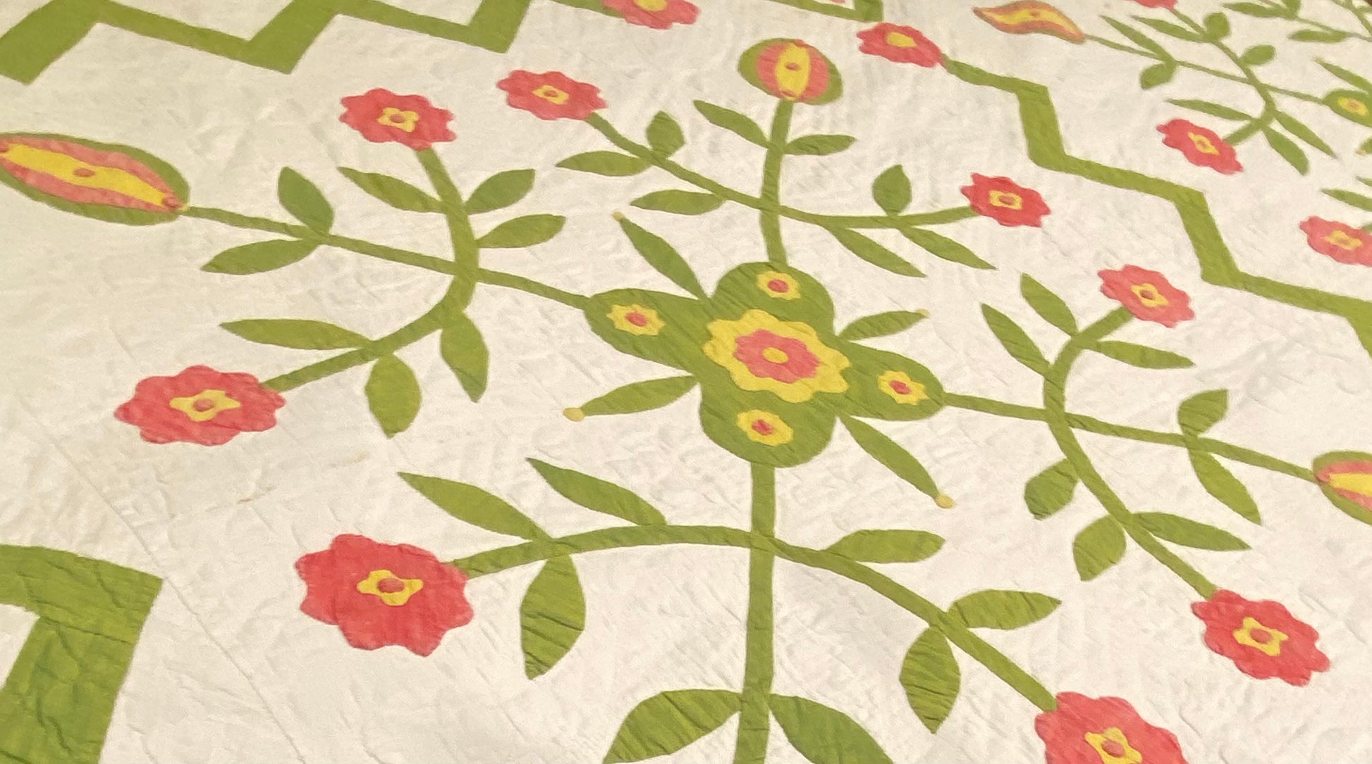 I love how the maker added some more appliqué design elements in the sashing and the central part of the quilt.