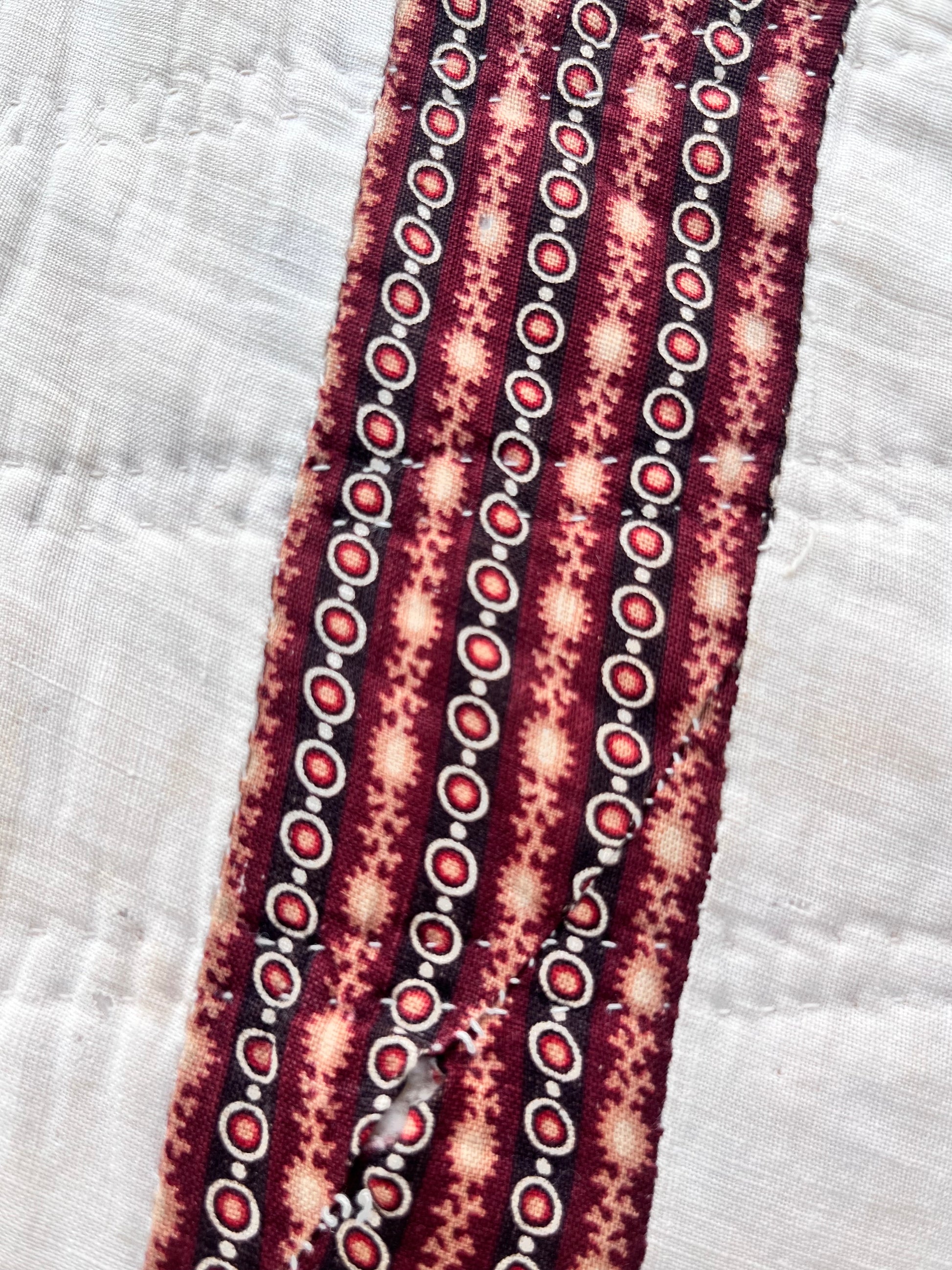 I didn’t wash this early textile as not to compromise the stability of the many early fabrics, there are a few of the small blocks with wear, really it’s more so deterioration instead of wear.