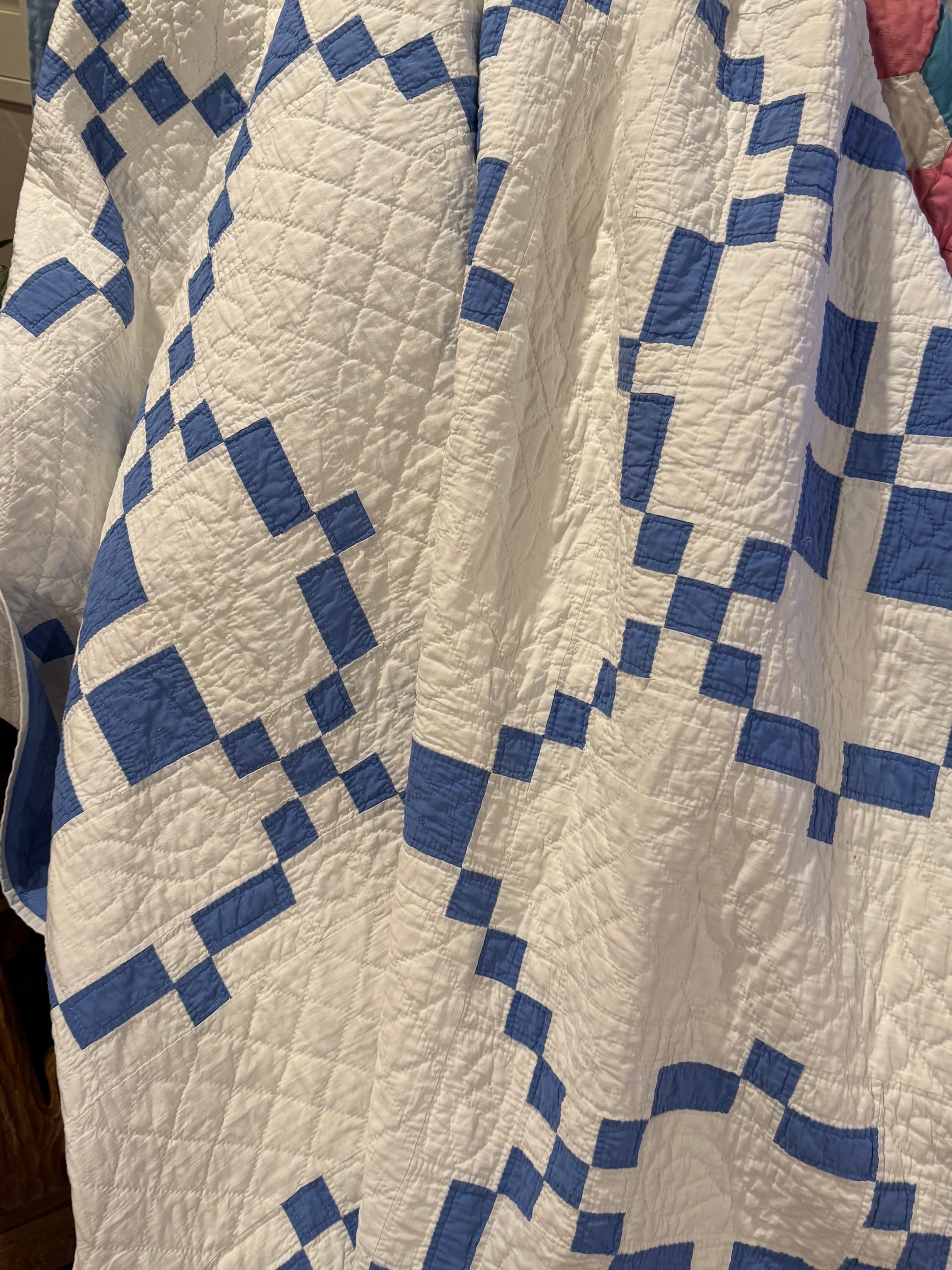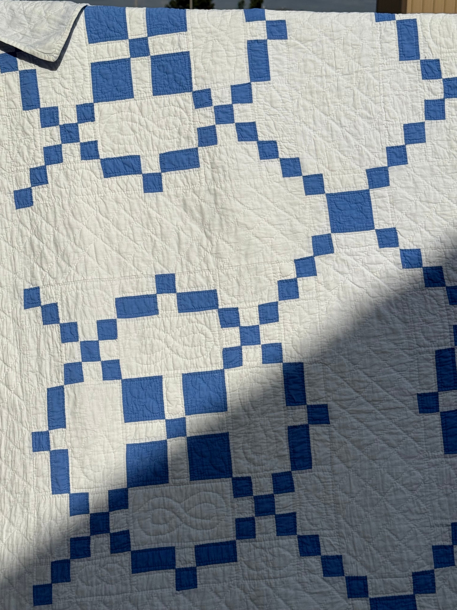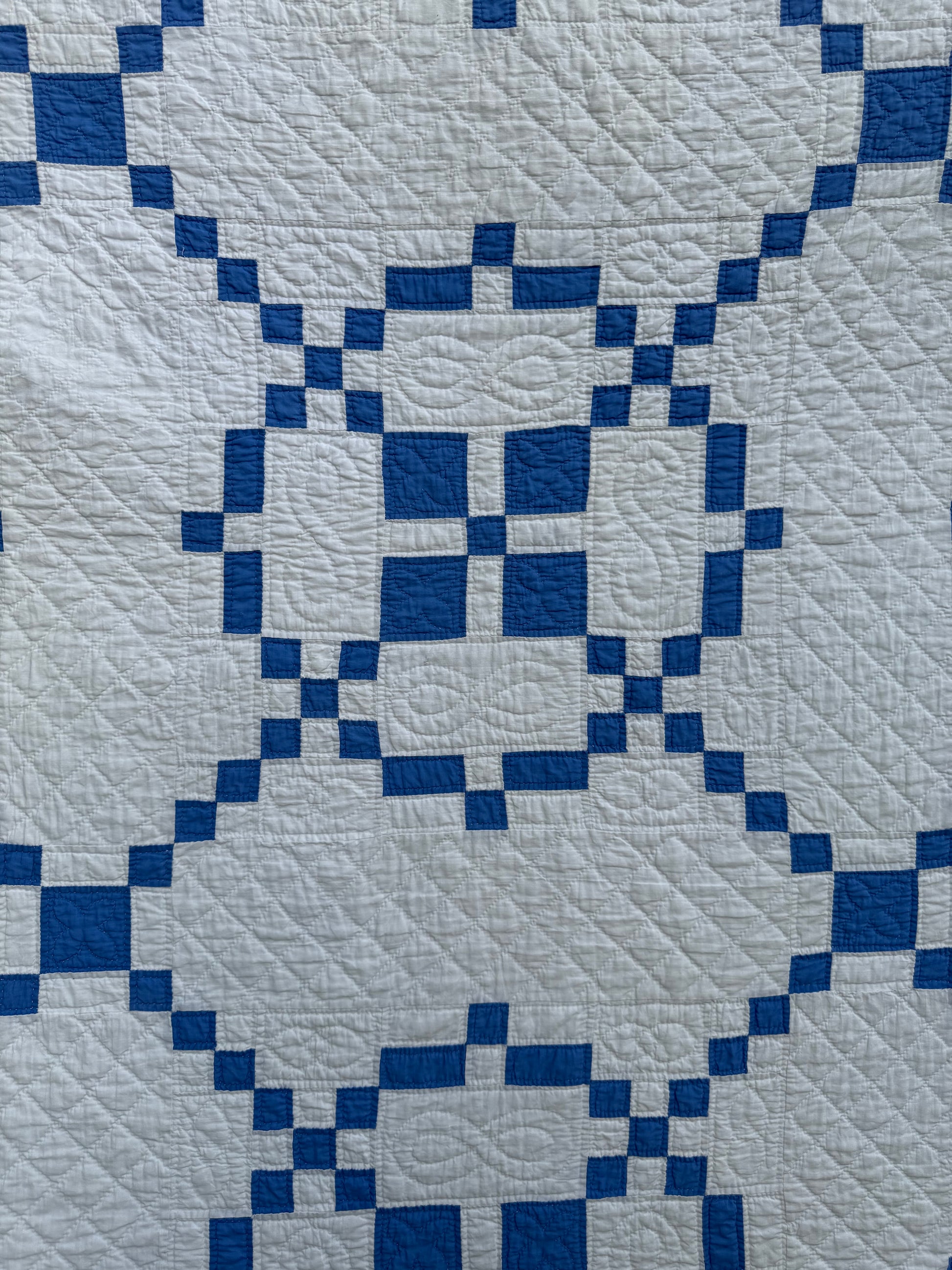 The blocks pattern stand out on a white ground. Lots of hand quilting in between the blocks add to the overall look and details of the 1930’s quilt.