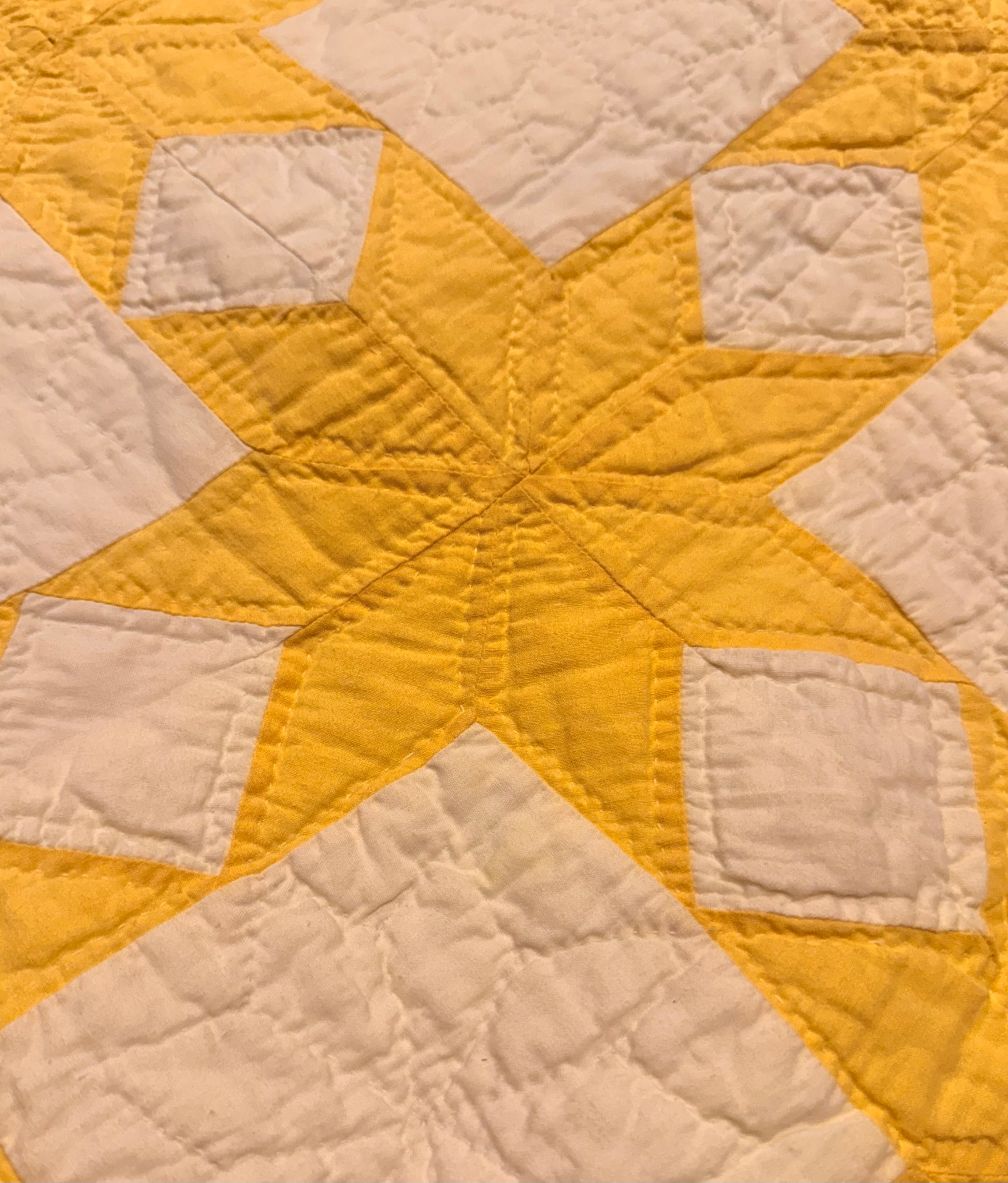 All hand quilted and hand bound. I took images both outside and inside and you can see how the lighting plays on the color, but be assured it is a beautiful shade of yellow.