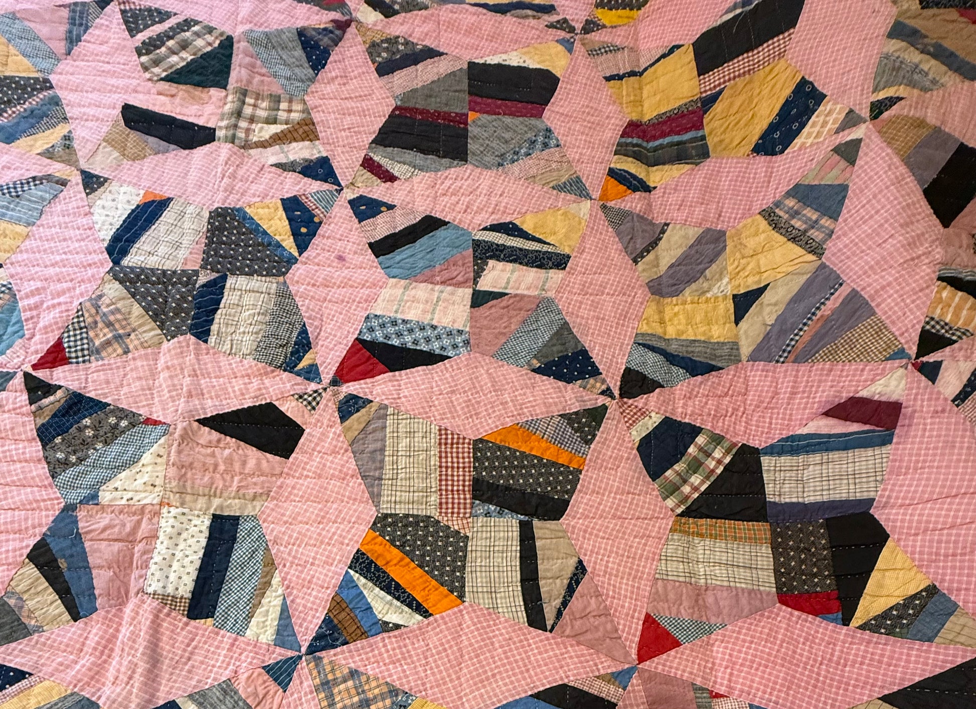 This great scrappy string quilt, a Rocky Road to Kansas, looks unwashed and really unused. Some storage/age spots, tiny color migration noted and shown.