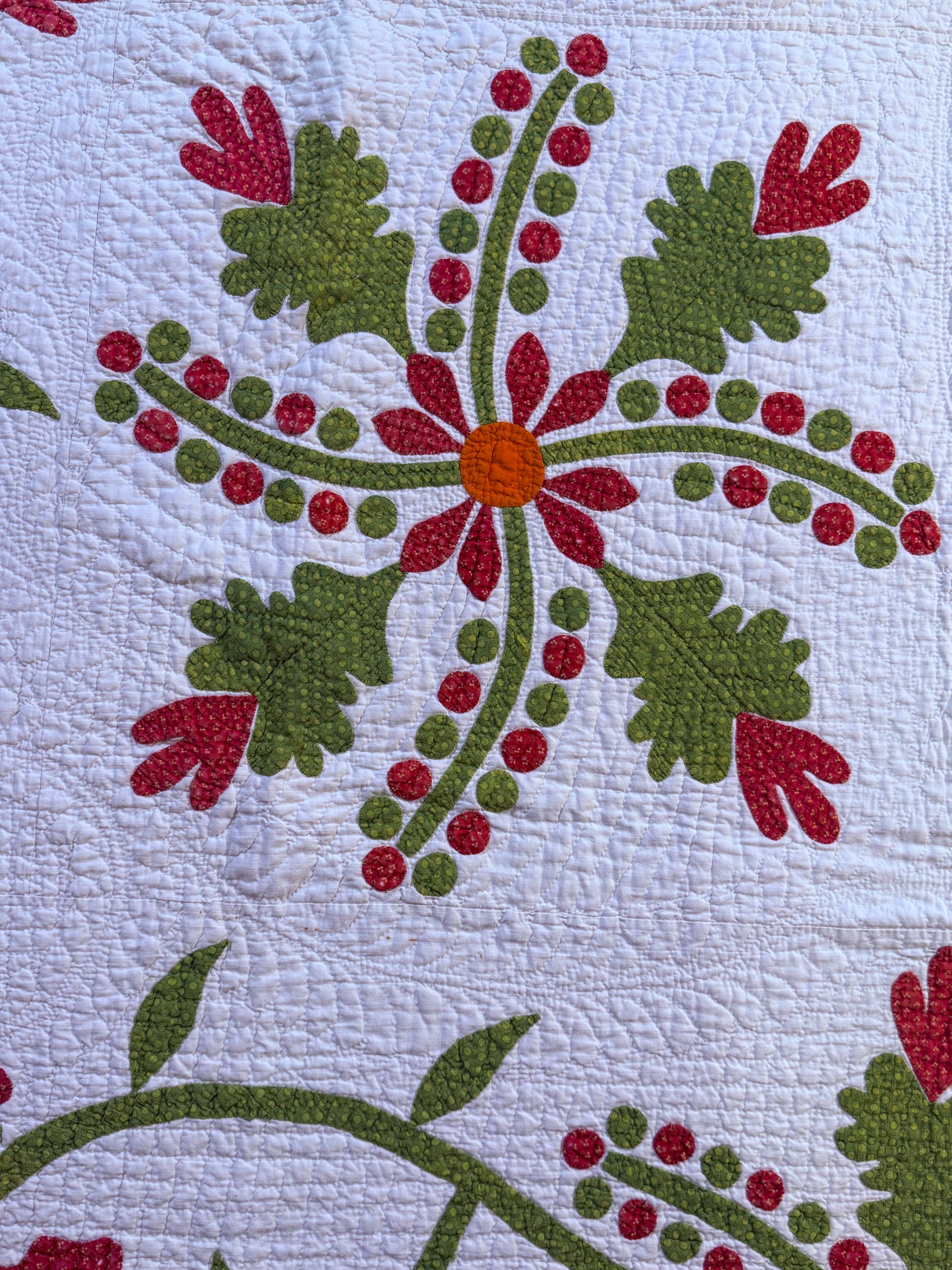 Fine detailed circa 1870’s Oak-leaf and Berries appliqué with a detailed dancing like appliqué border. The maker left no areas of ground unquilted.