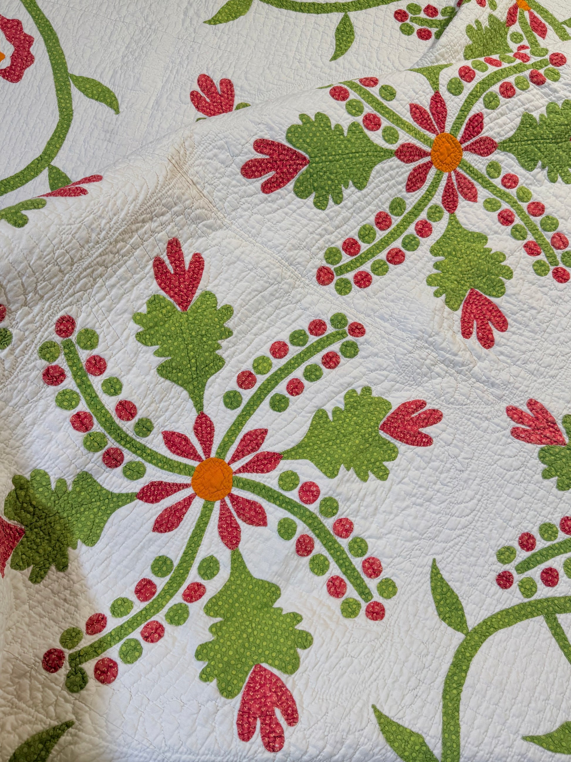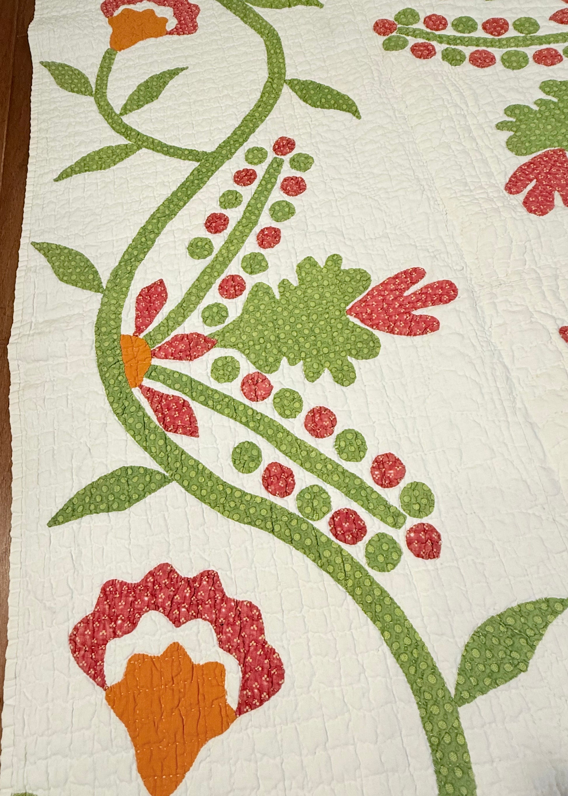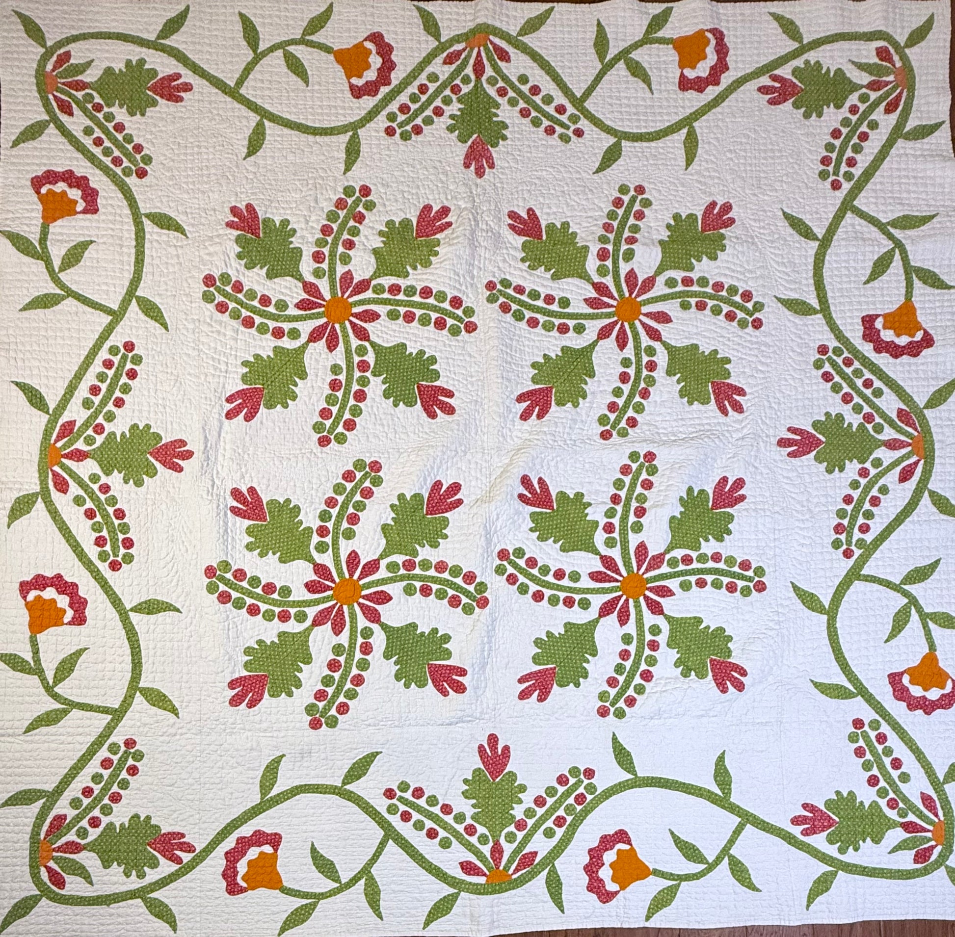 The exquisite vining border with more berries and leaves frame the central 4 blocks of appliqué.