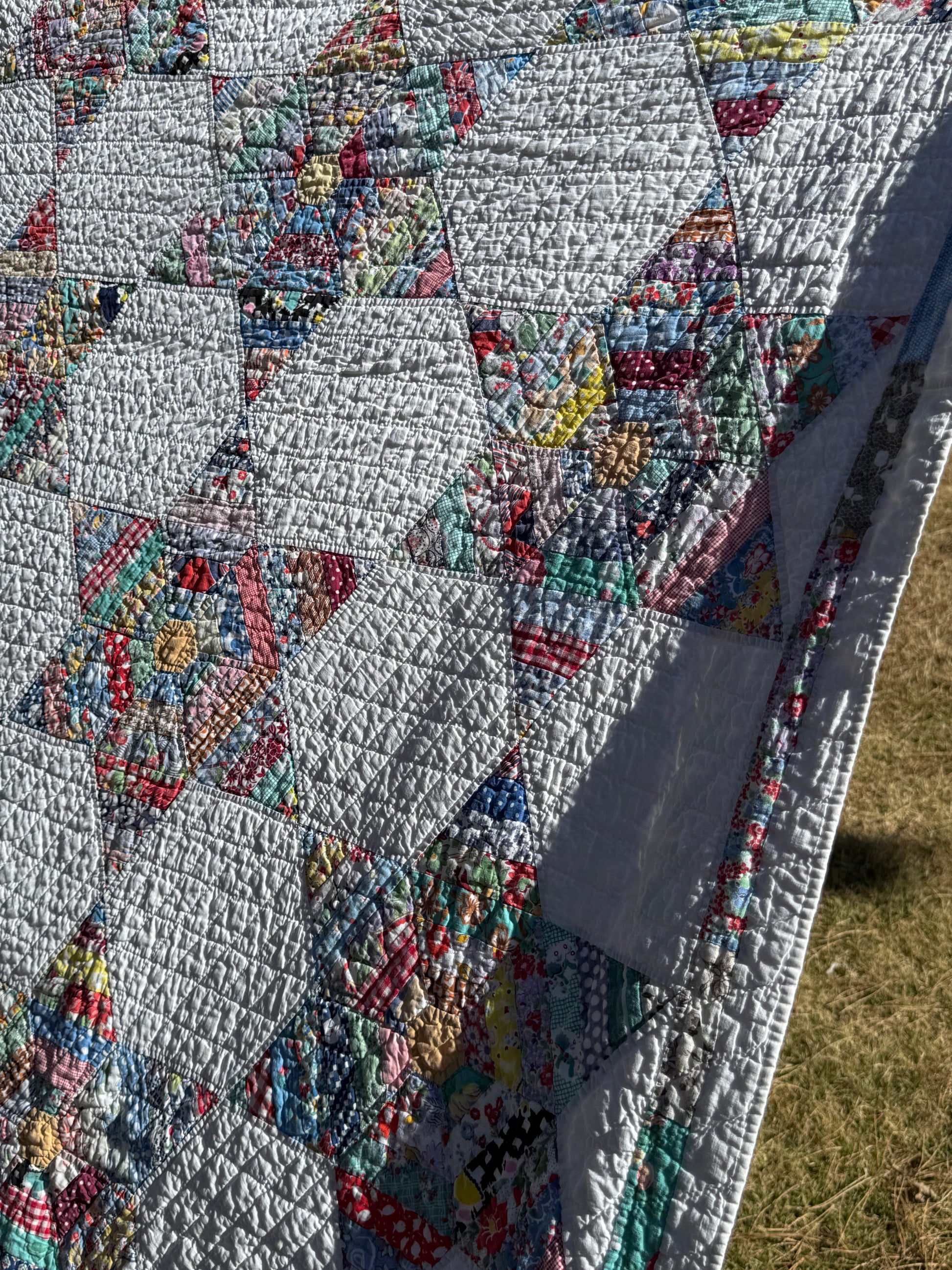 This outstanding circa 1930’s quilt is a beauty and one to enjoy the many fabrics and piecing of the design.