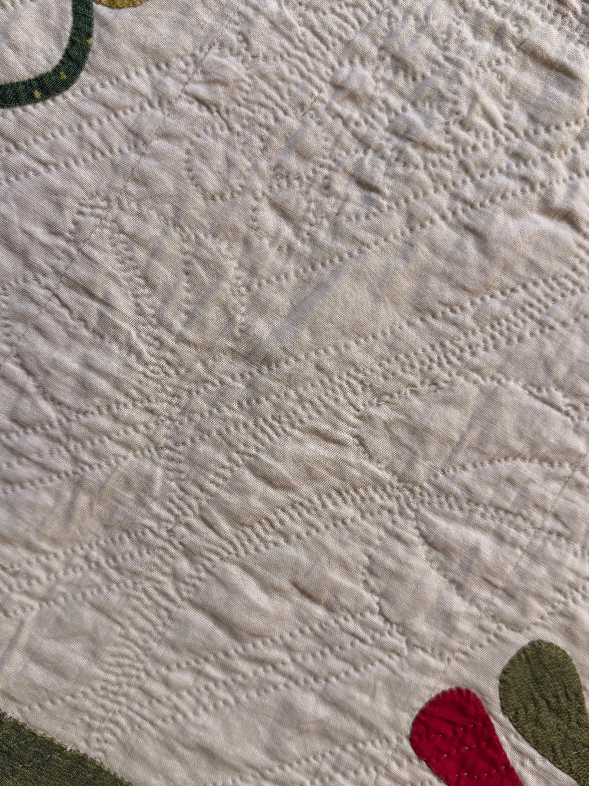 All fine hand quilting using tiny stitches. The triple rod line of stitches are a standout along with the many quilting designs. The maker had a lot of thought in the quilting designs it appears.