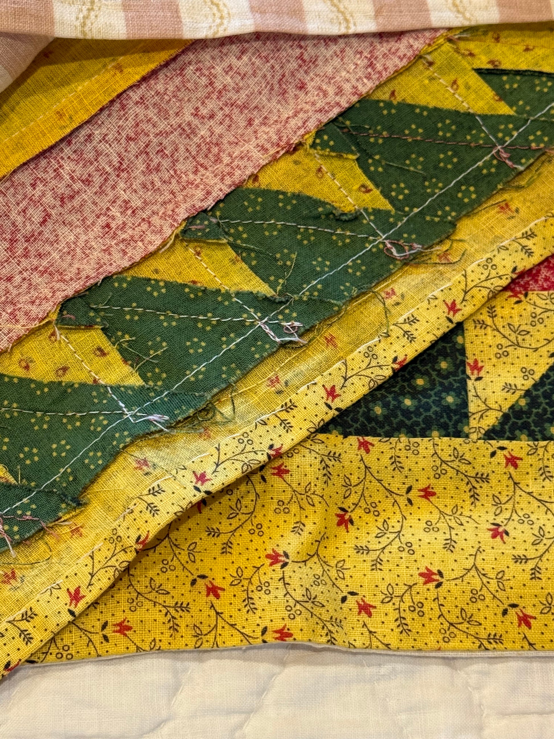 I did see with close examination of the fabrics, one of them had some deterioration, so anther antique piece of fabric was appliqued to the top and leaving the original underneath as shown.