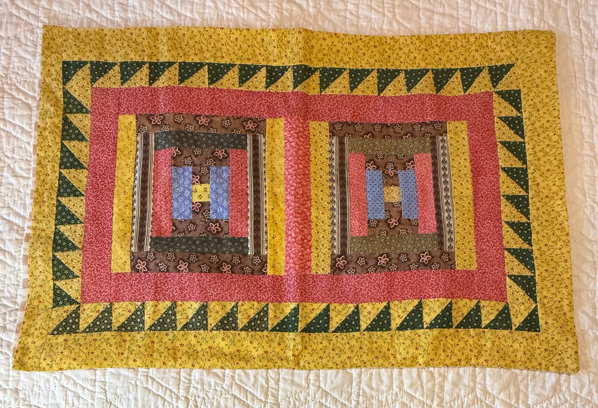 The pattern on the front a Log Cabin is then framed with an appealing sawtooth border, much like the pillowcases from the 1880’s.