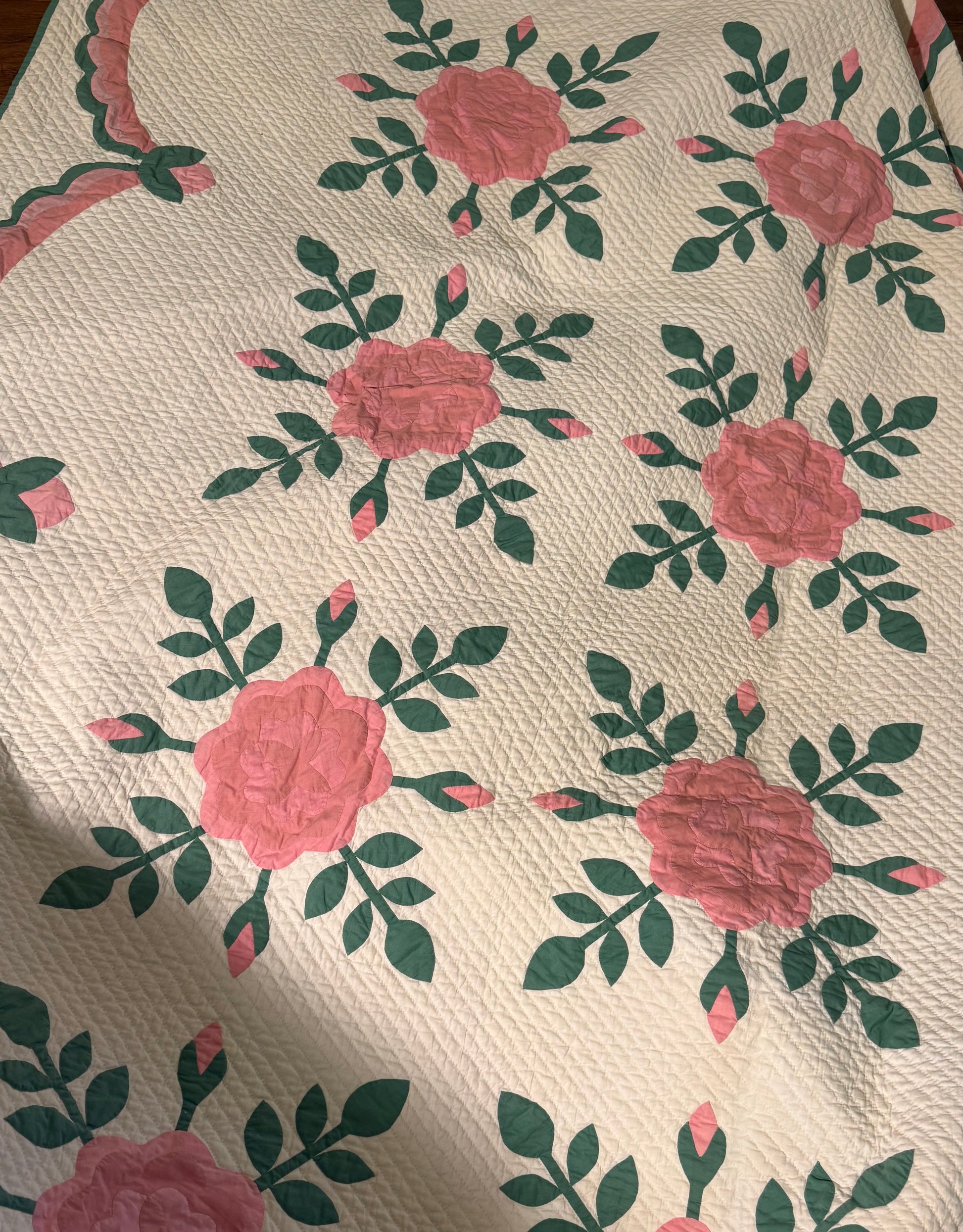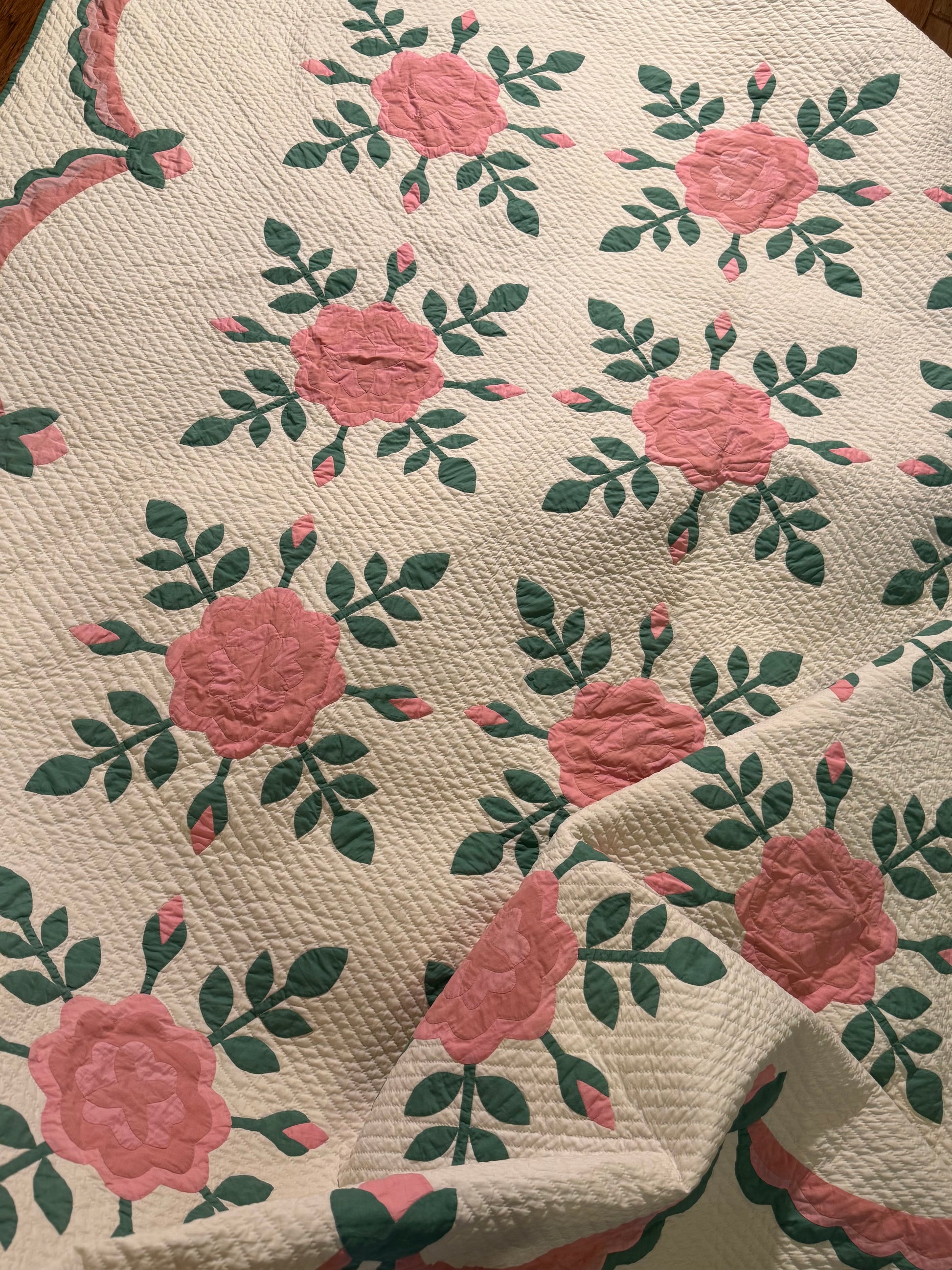 This superb appliqué, Pink Rose, is very similar to one of Marie Webster patterns and another designer, Mrs Danvers Rose.