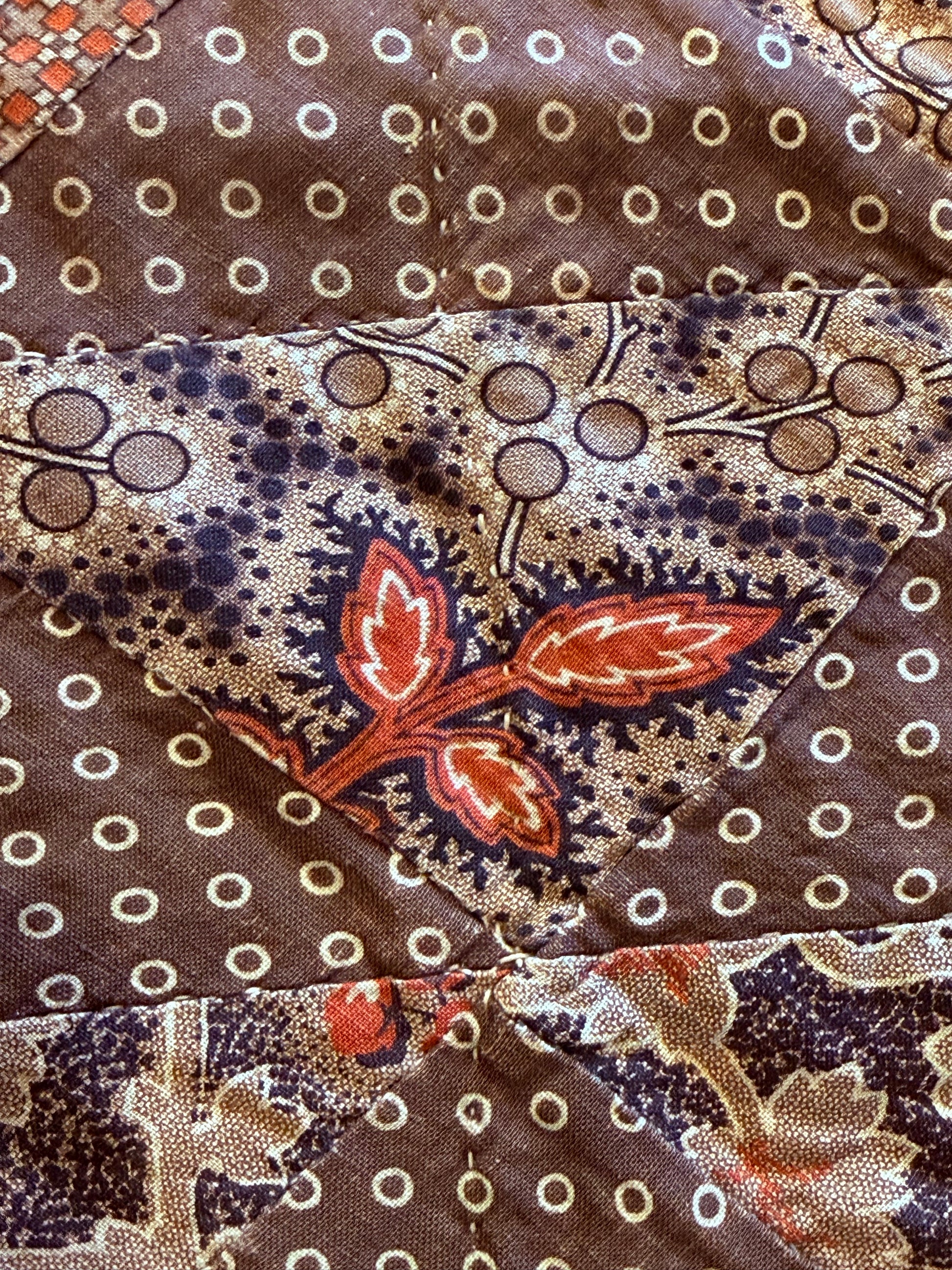 The fabrics are wonderful detailed prints of pink, browns, madders, and more.