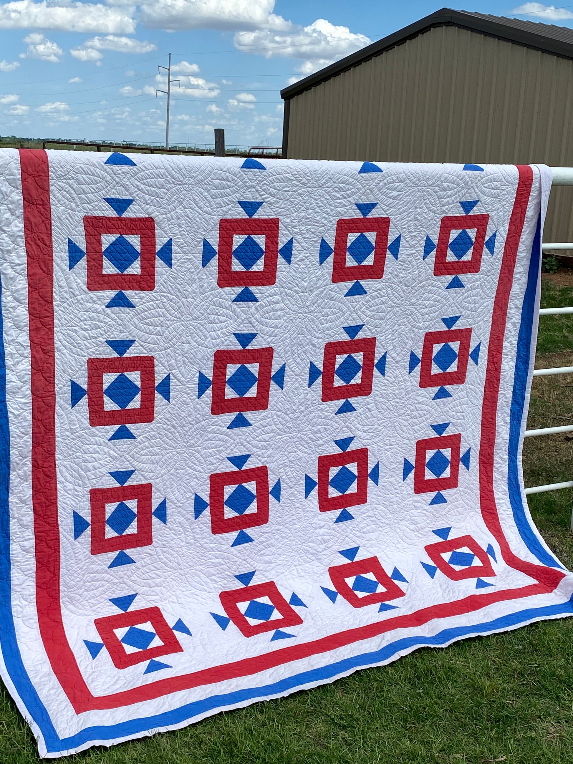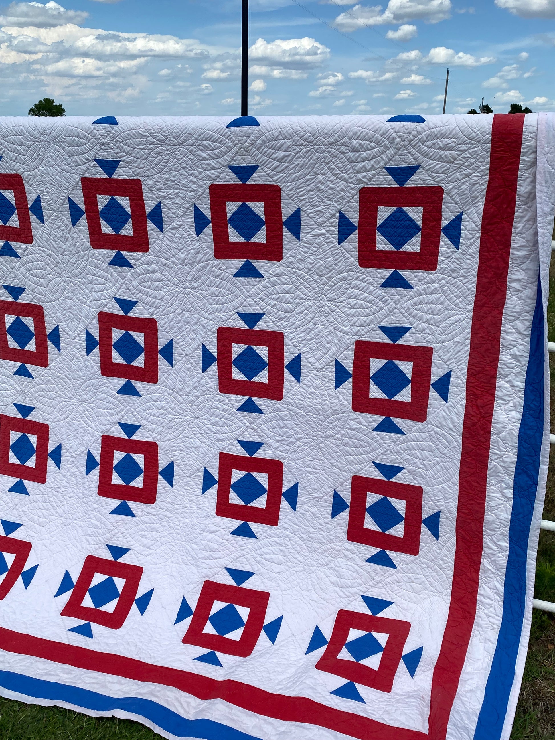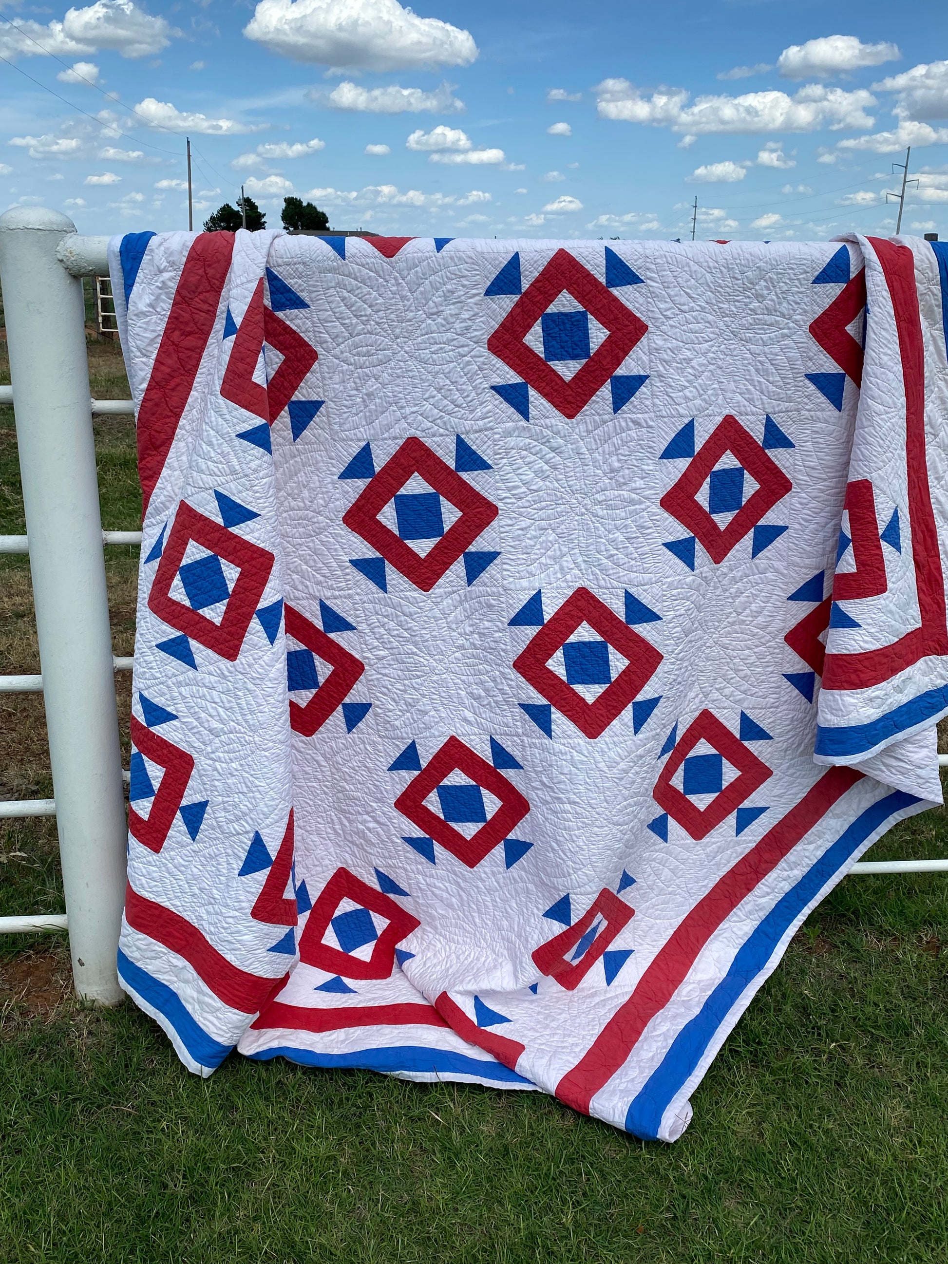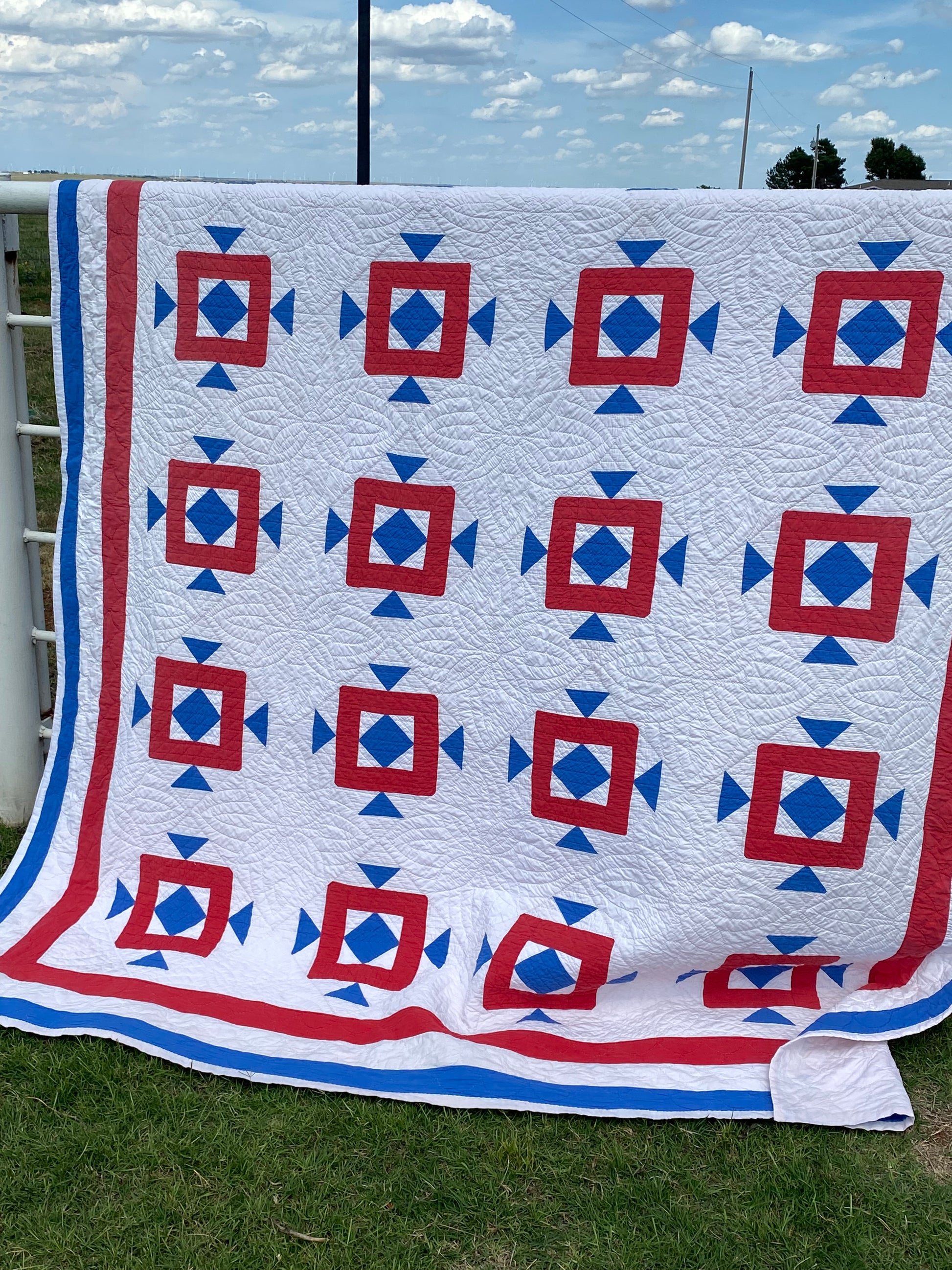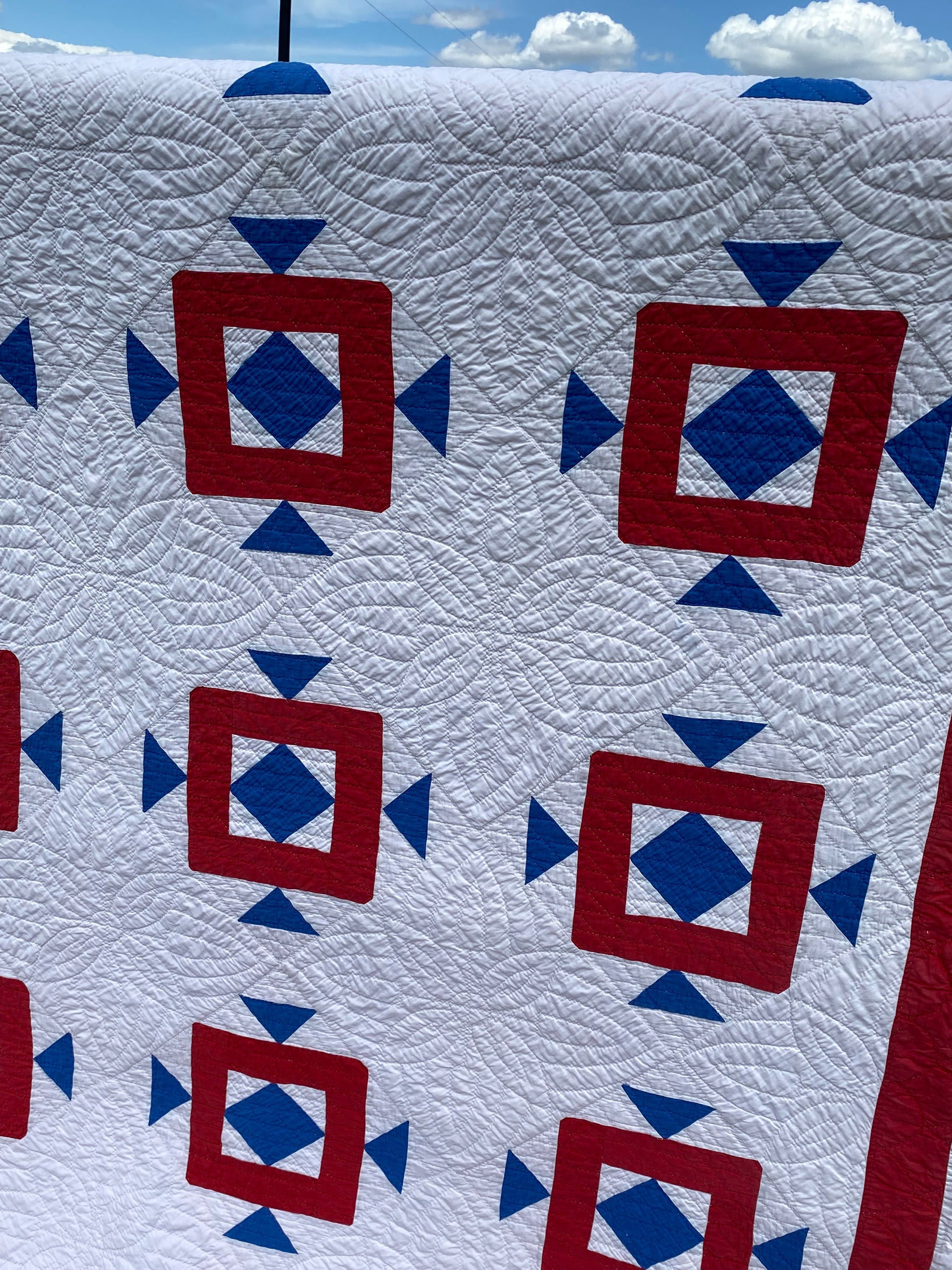 This quilt is framed with a red white and blue border and this is so patriotic/ Americana in feel and look.
