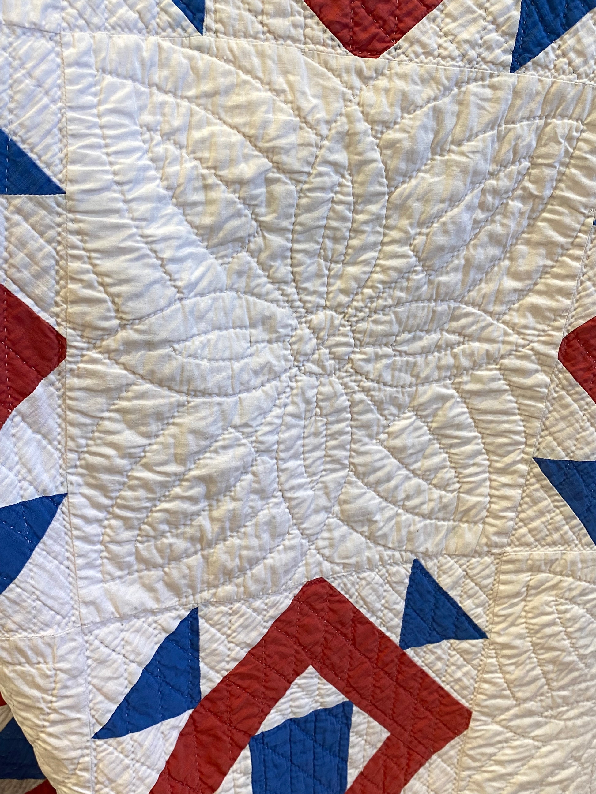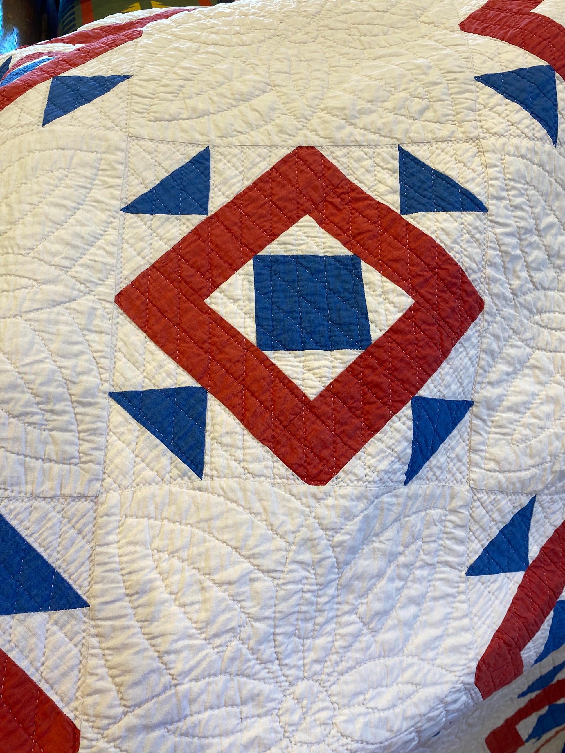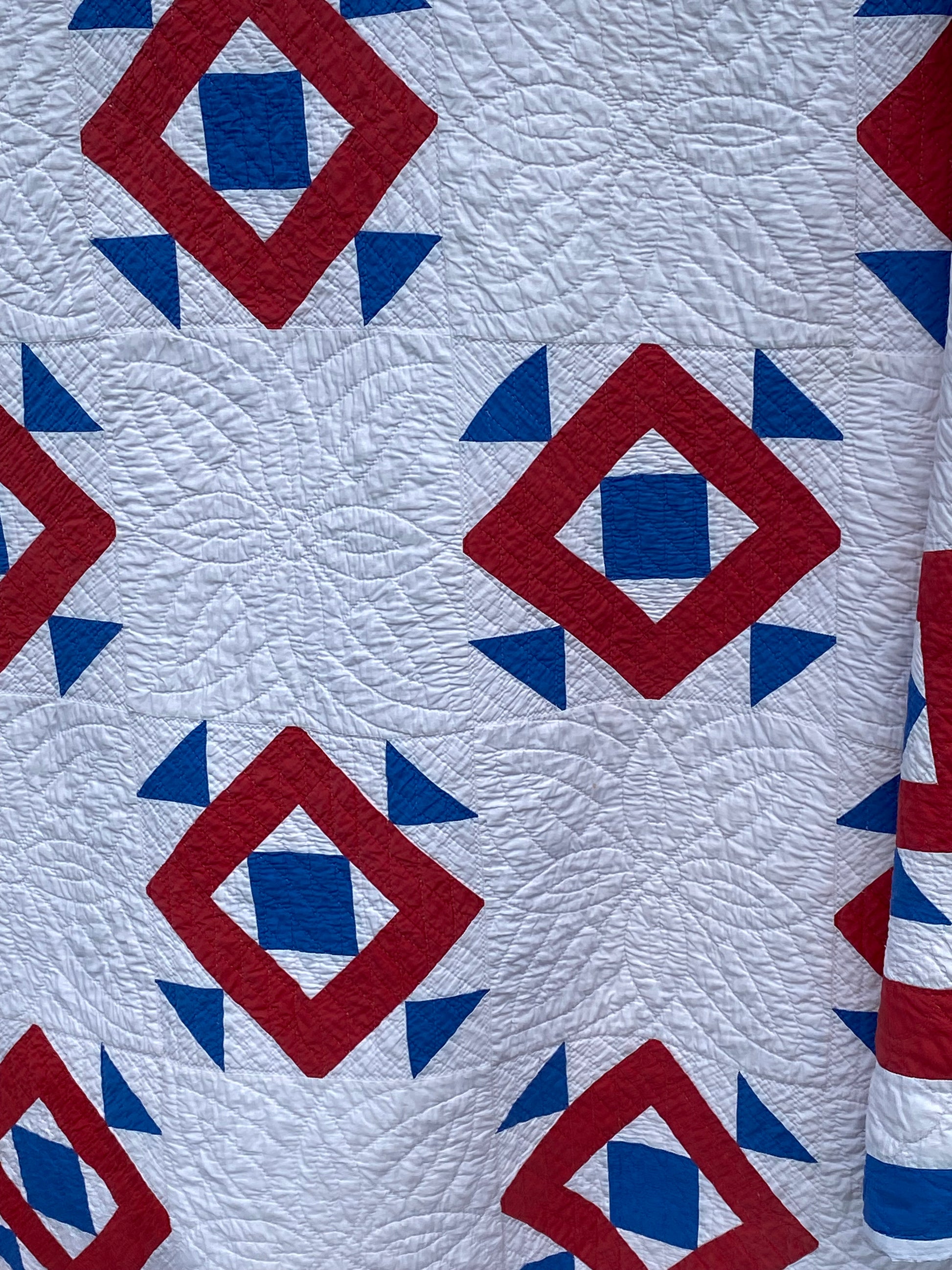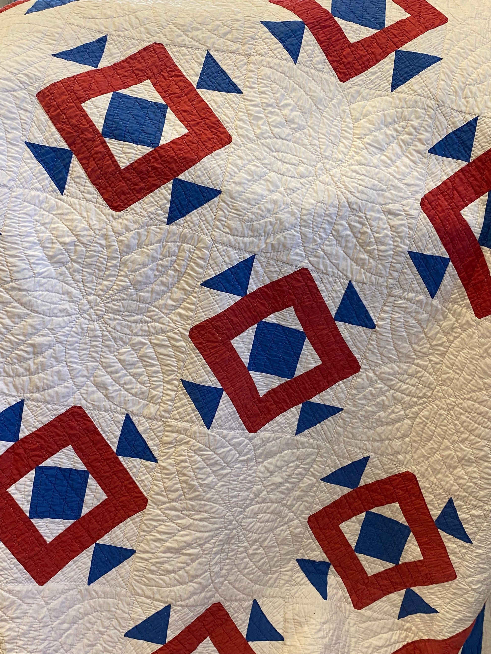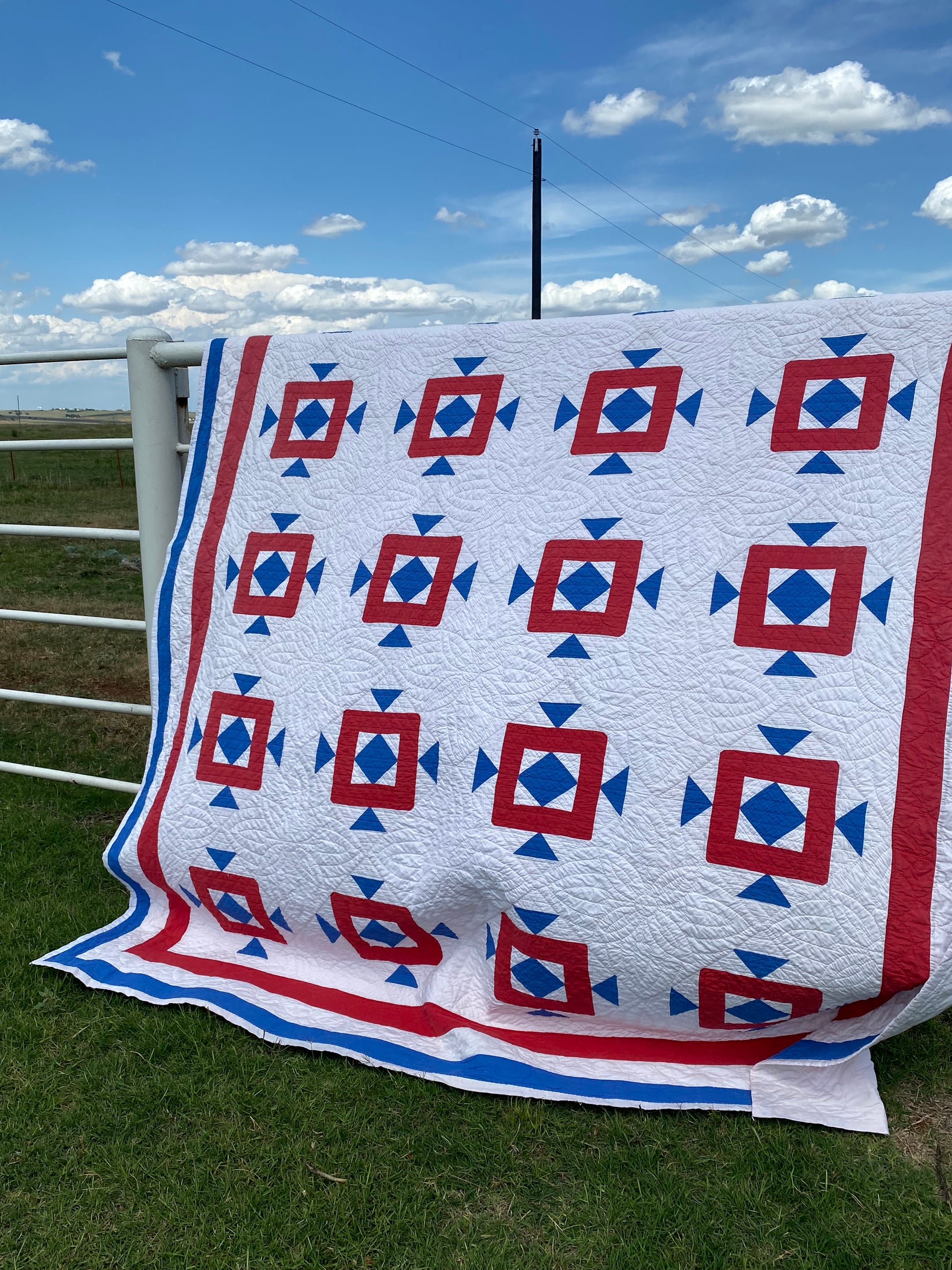 This quilt is framed with a red white and blue border and this is so patriotic/ Americana in feel and look.