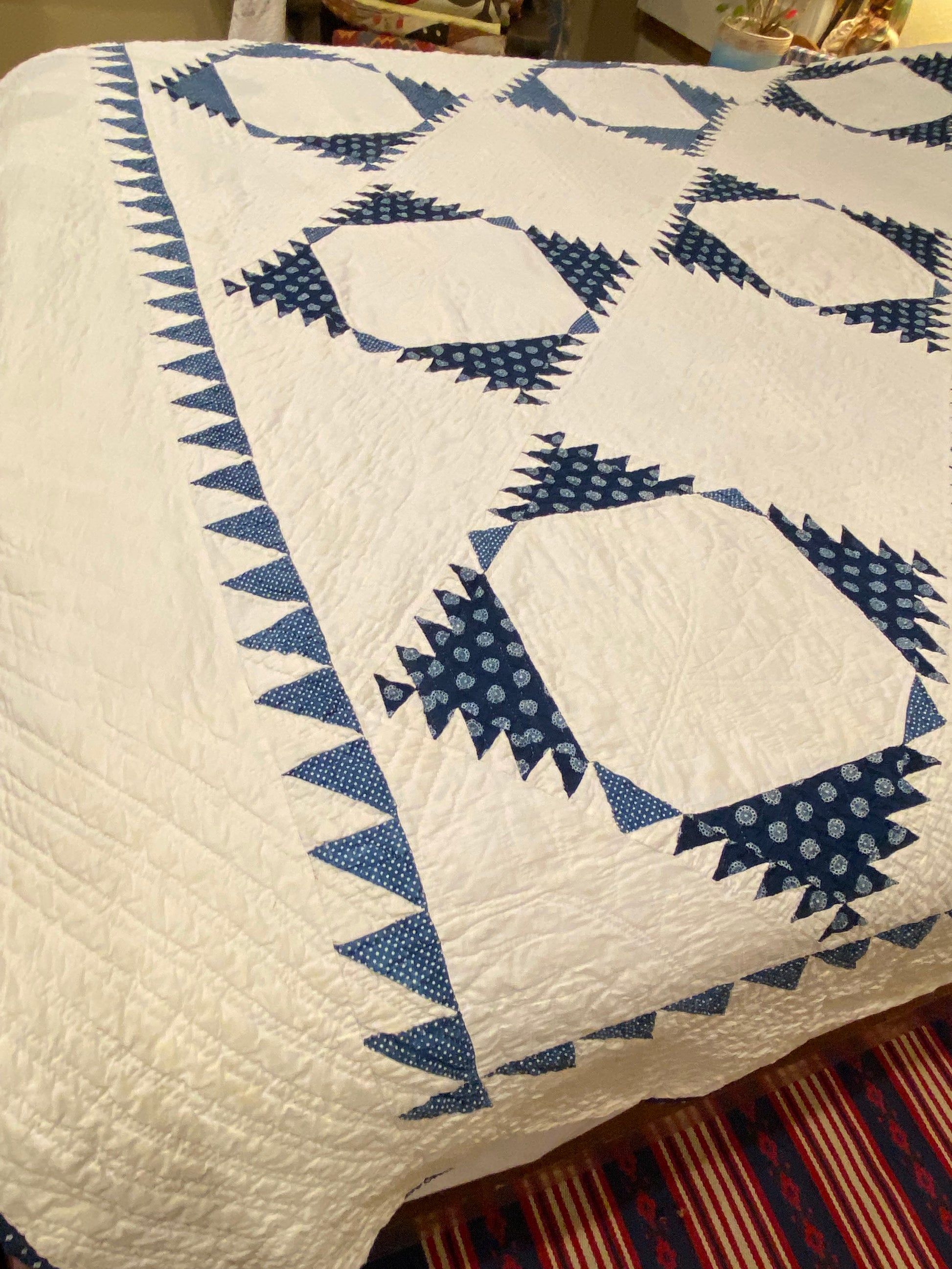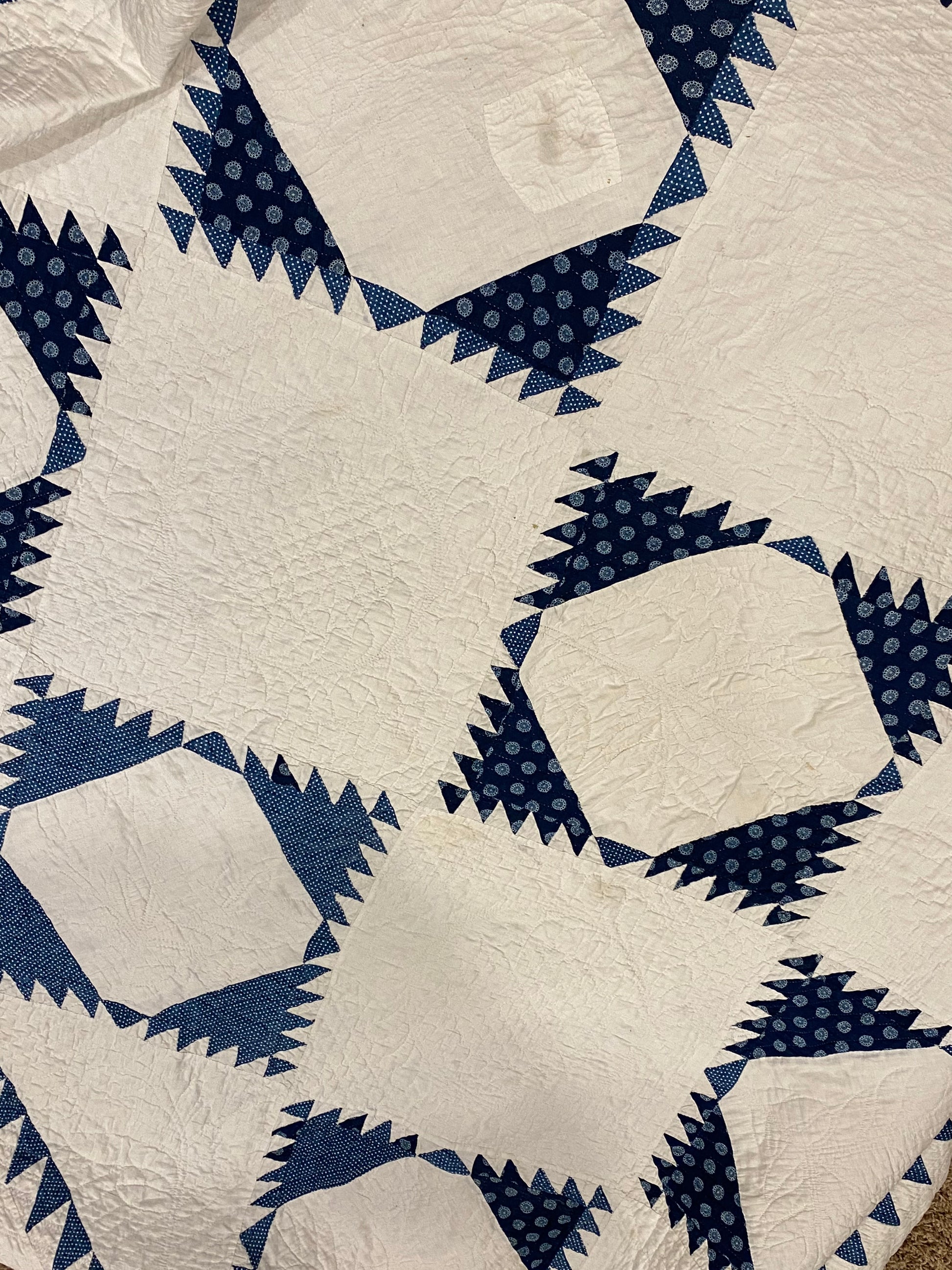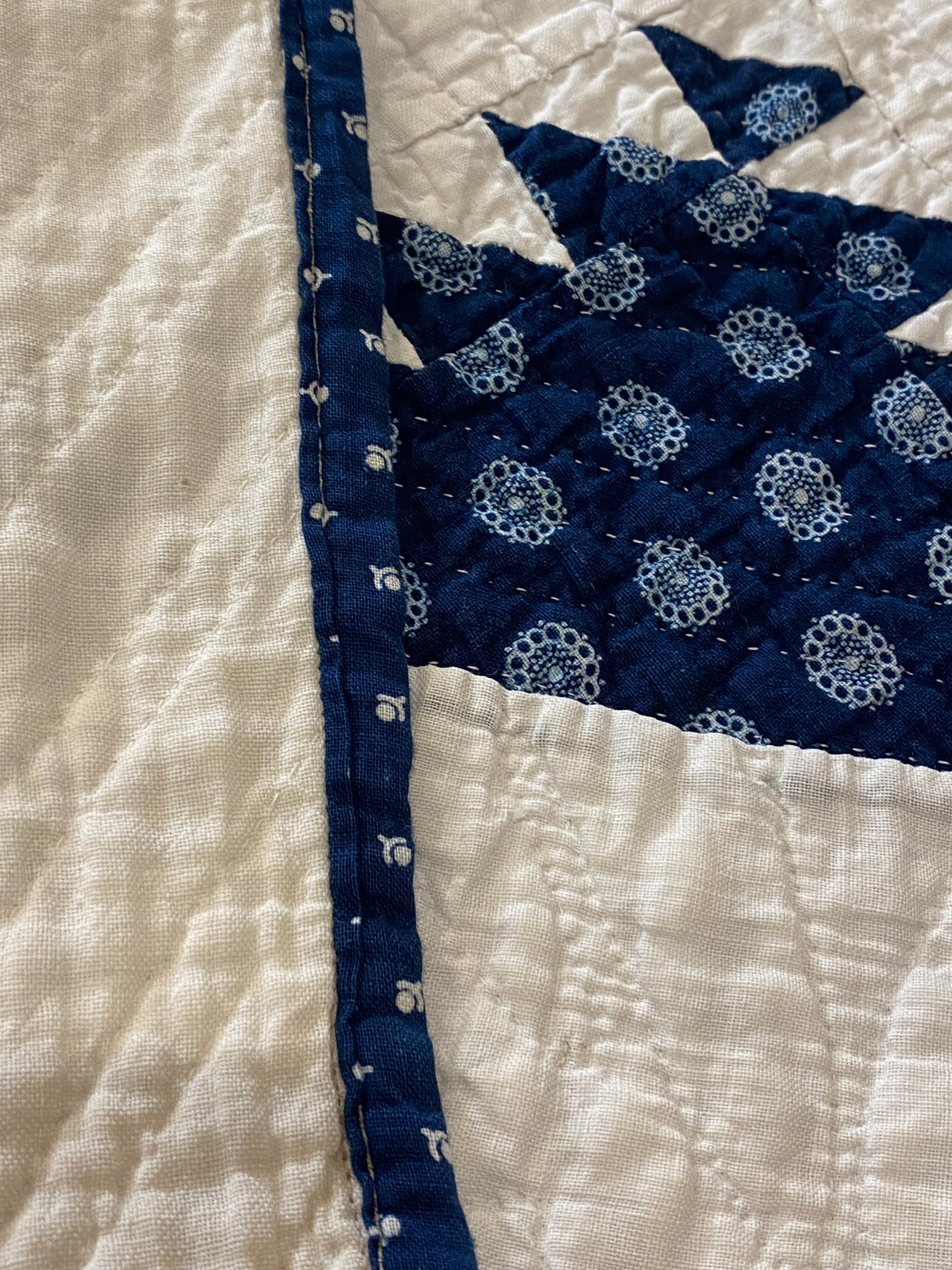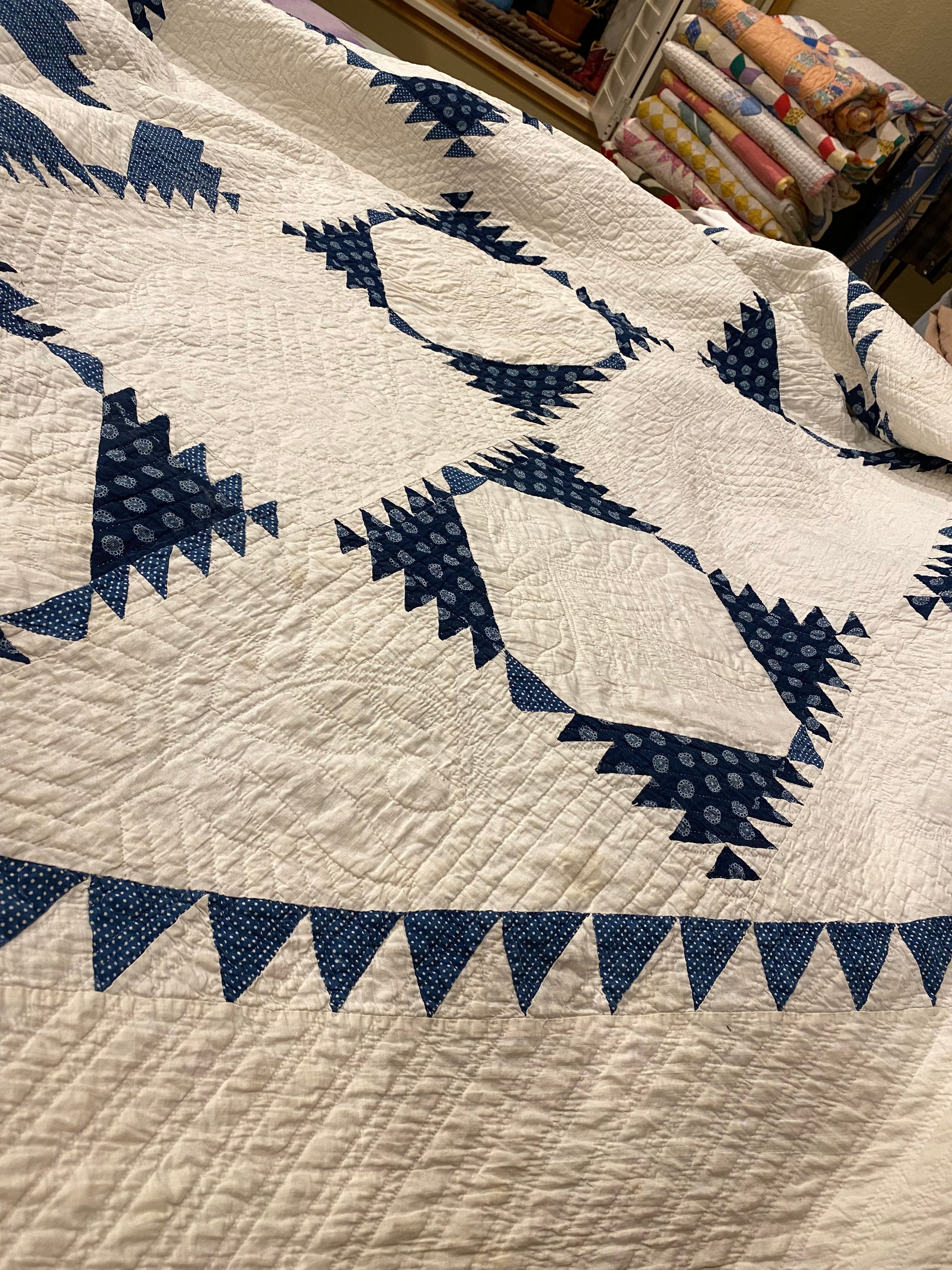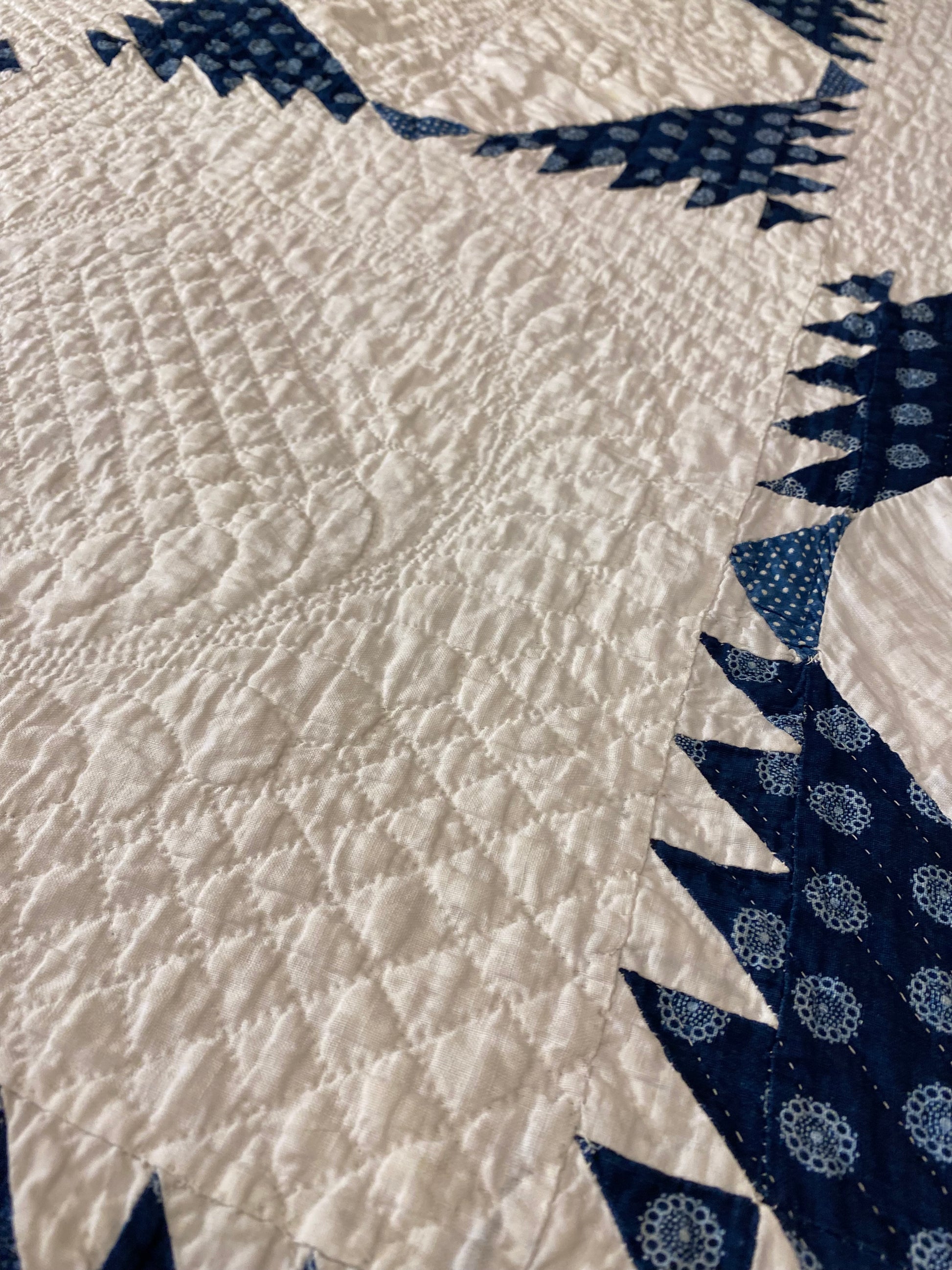 This is one wonderful antique quilt with fabrics of a rich indigo fabric and finished off with the beautifully framed sawtooth border and then the indigo binding.
