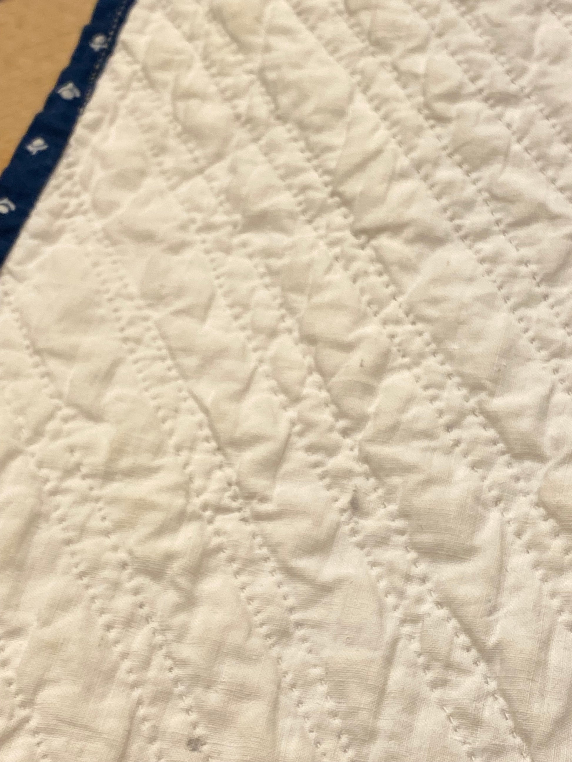 The superb hand quilting shows off the handwork of the maker and also love seeing the double rod quilting on the border. In between the blocks is a detailed wreath of hand quilting designs.