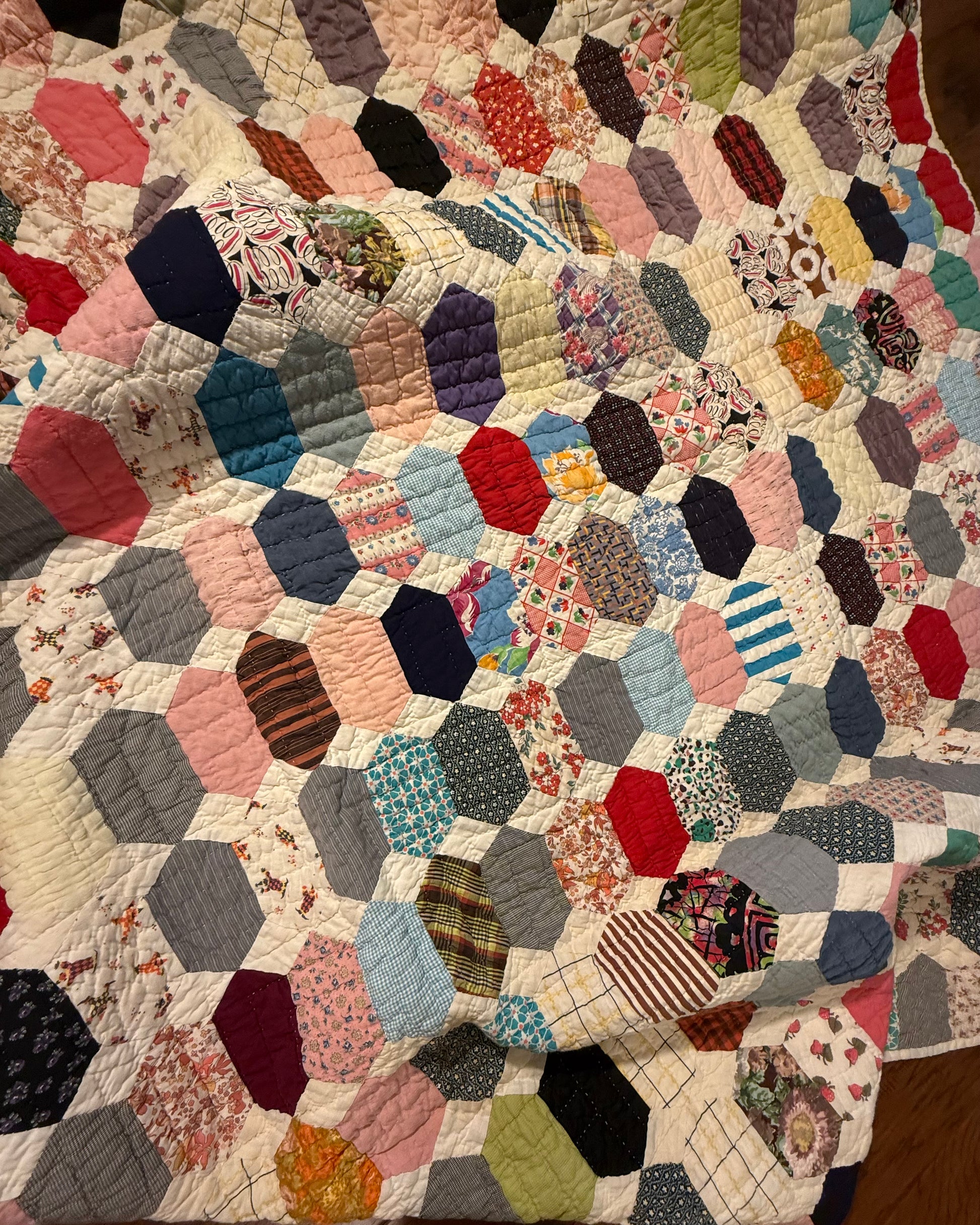 I see many feedsack fabrics were used in the making of his happy quilt.