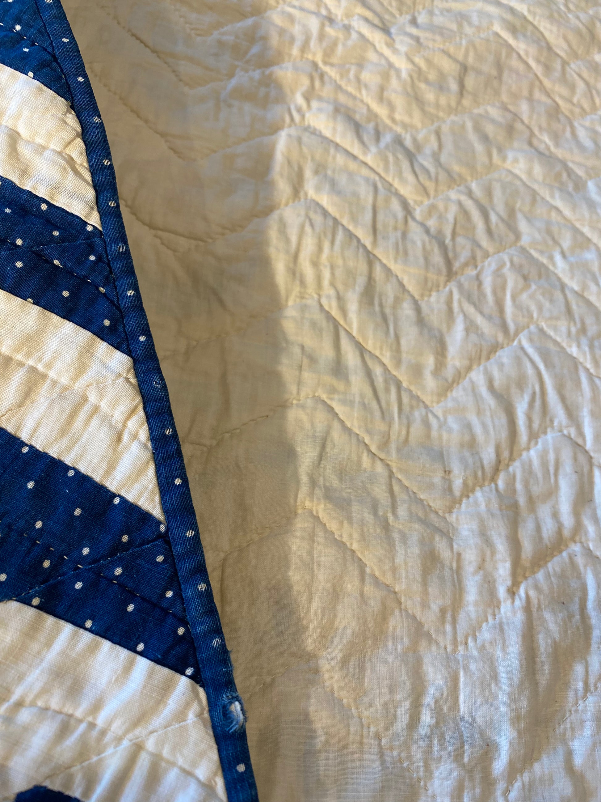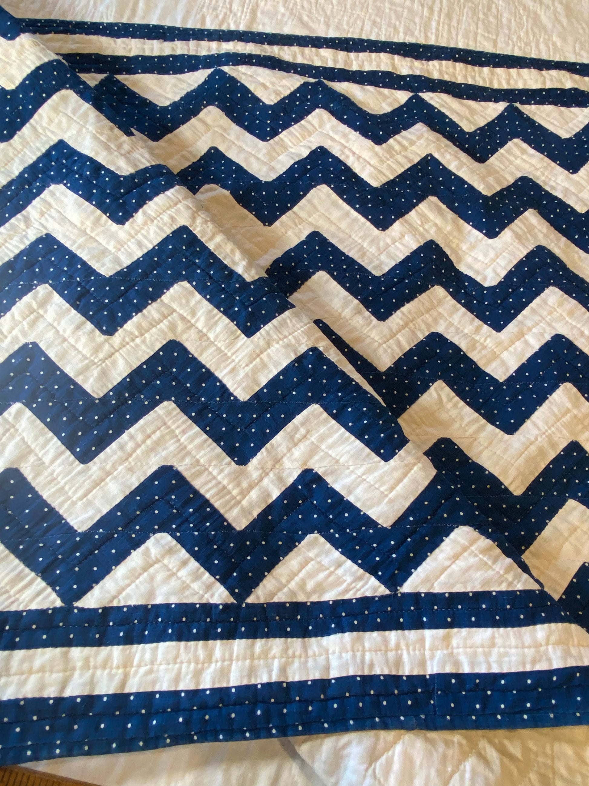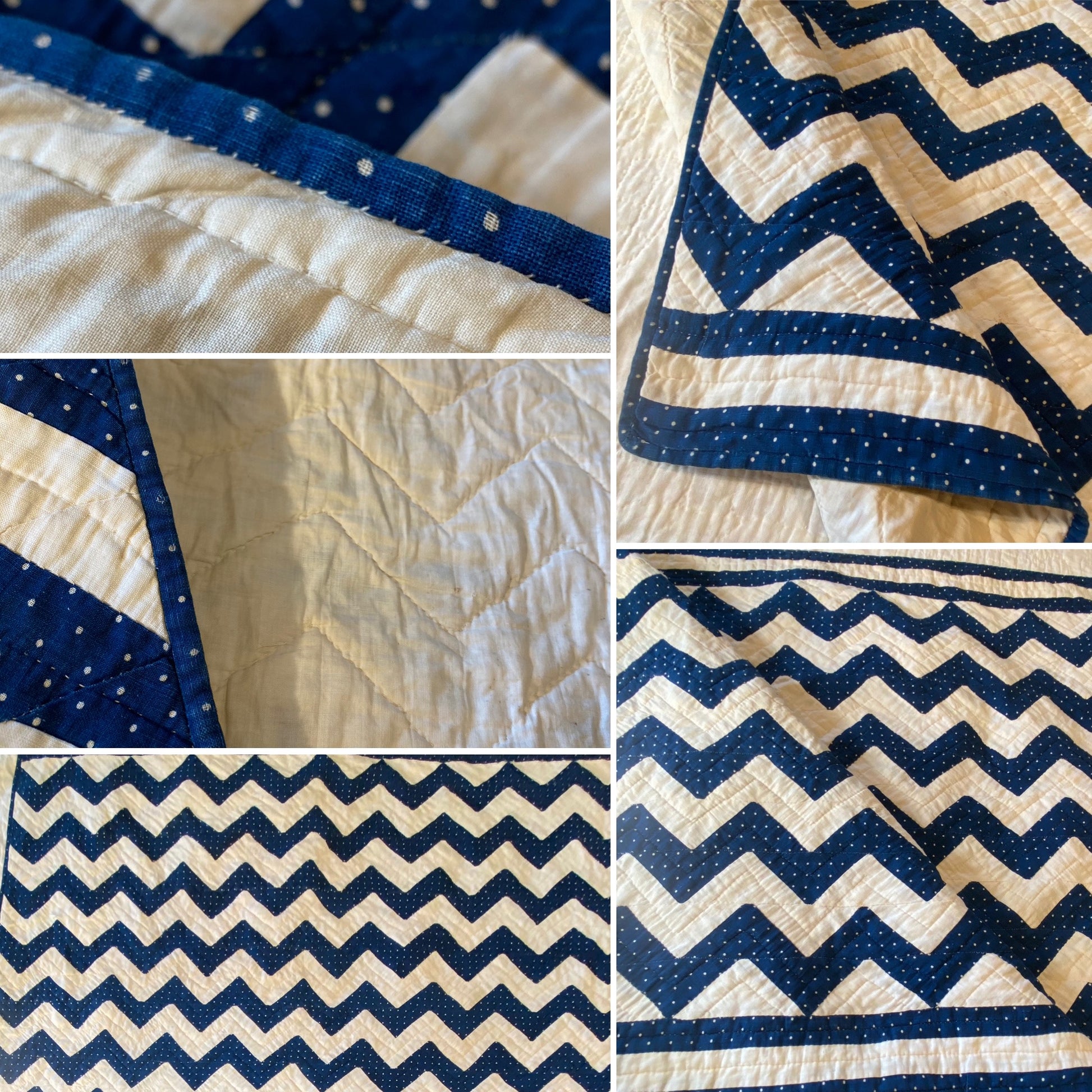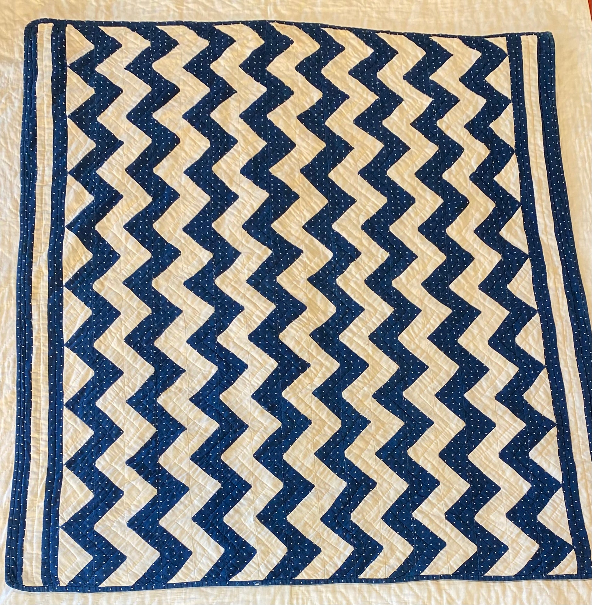 Wonderful, original indigo blue and white Chevron crib quilt having a zip zag like design.