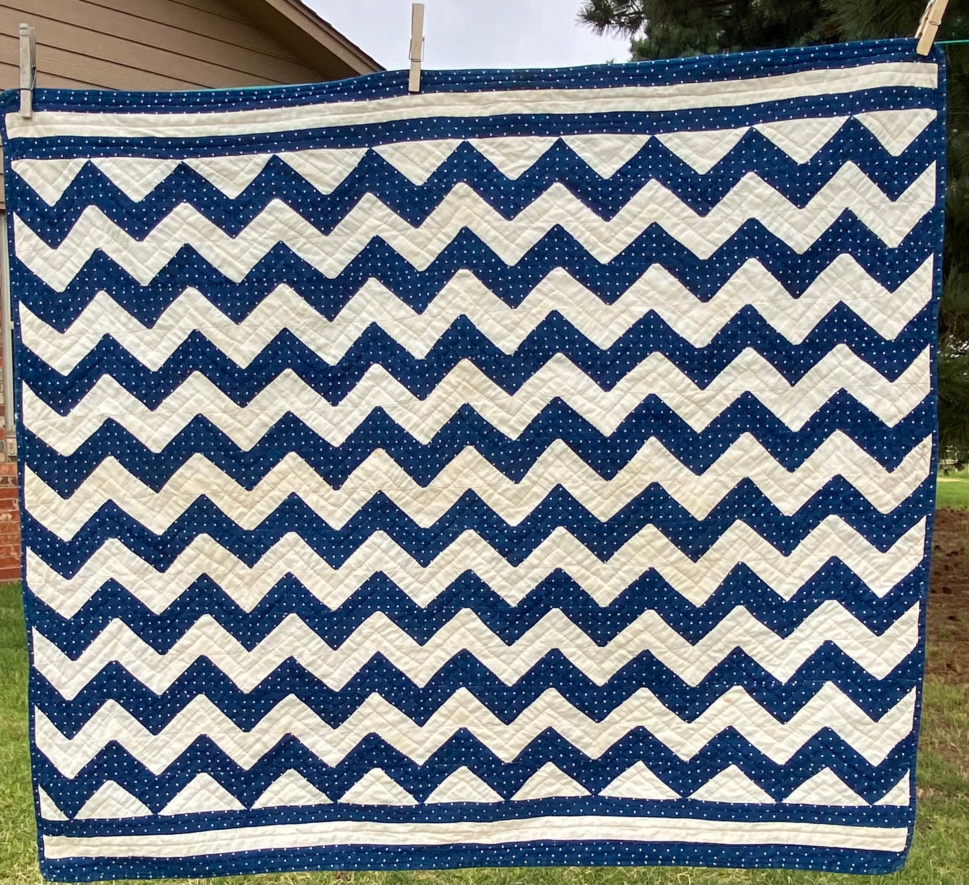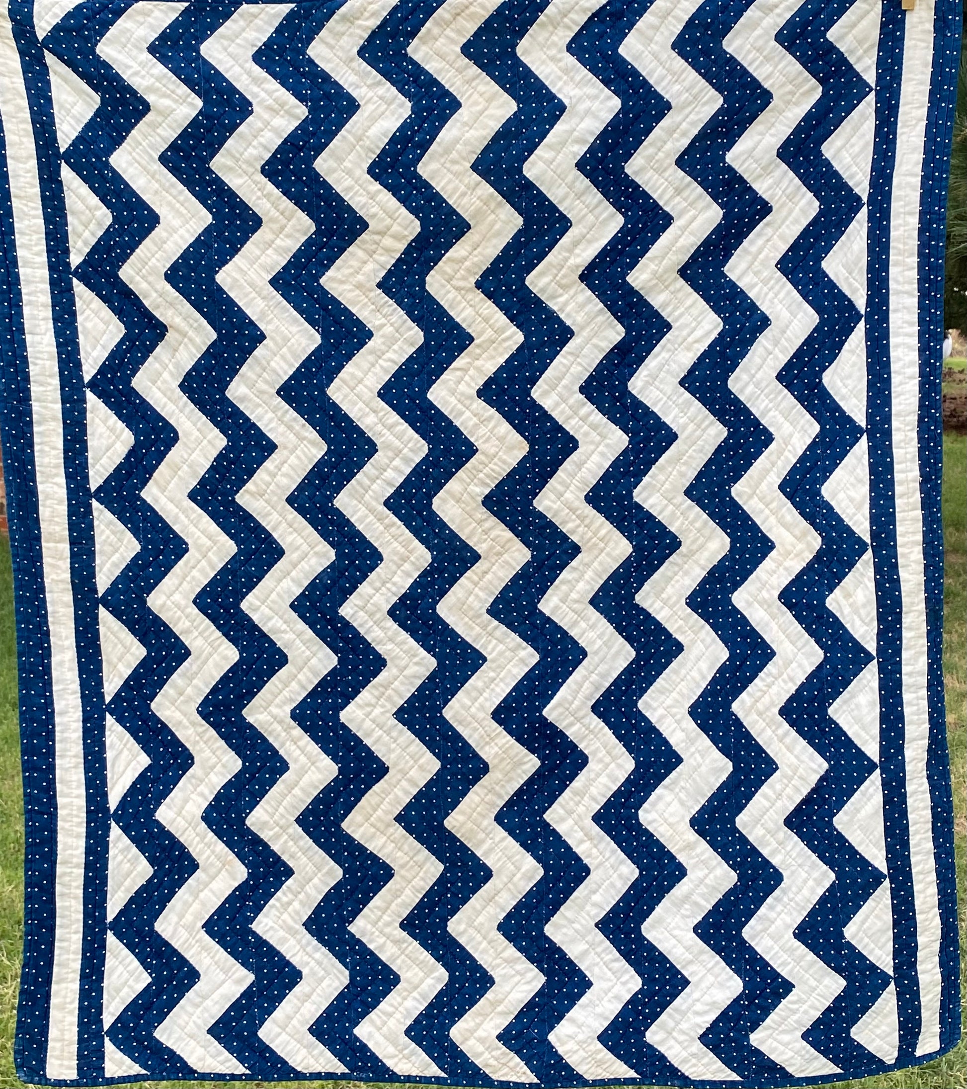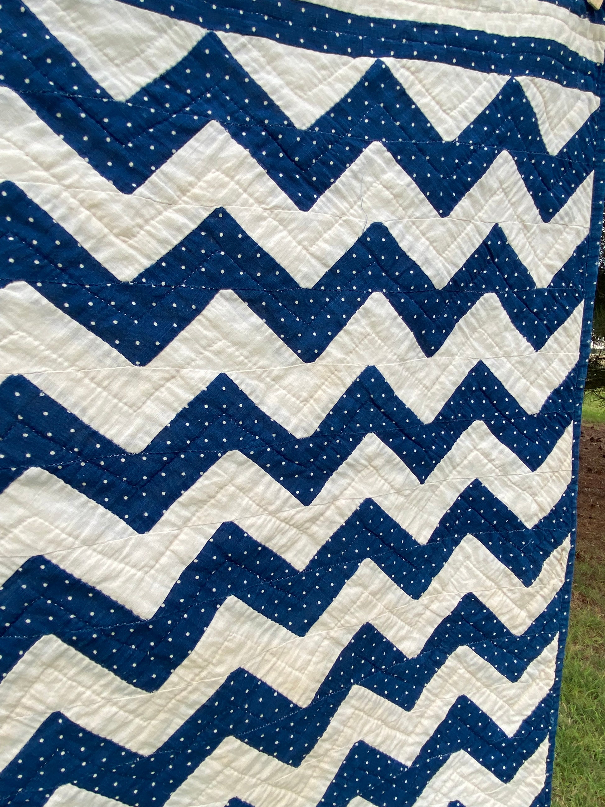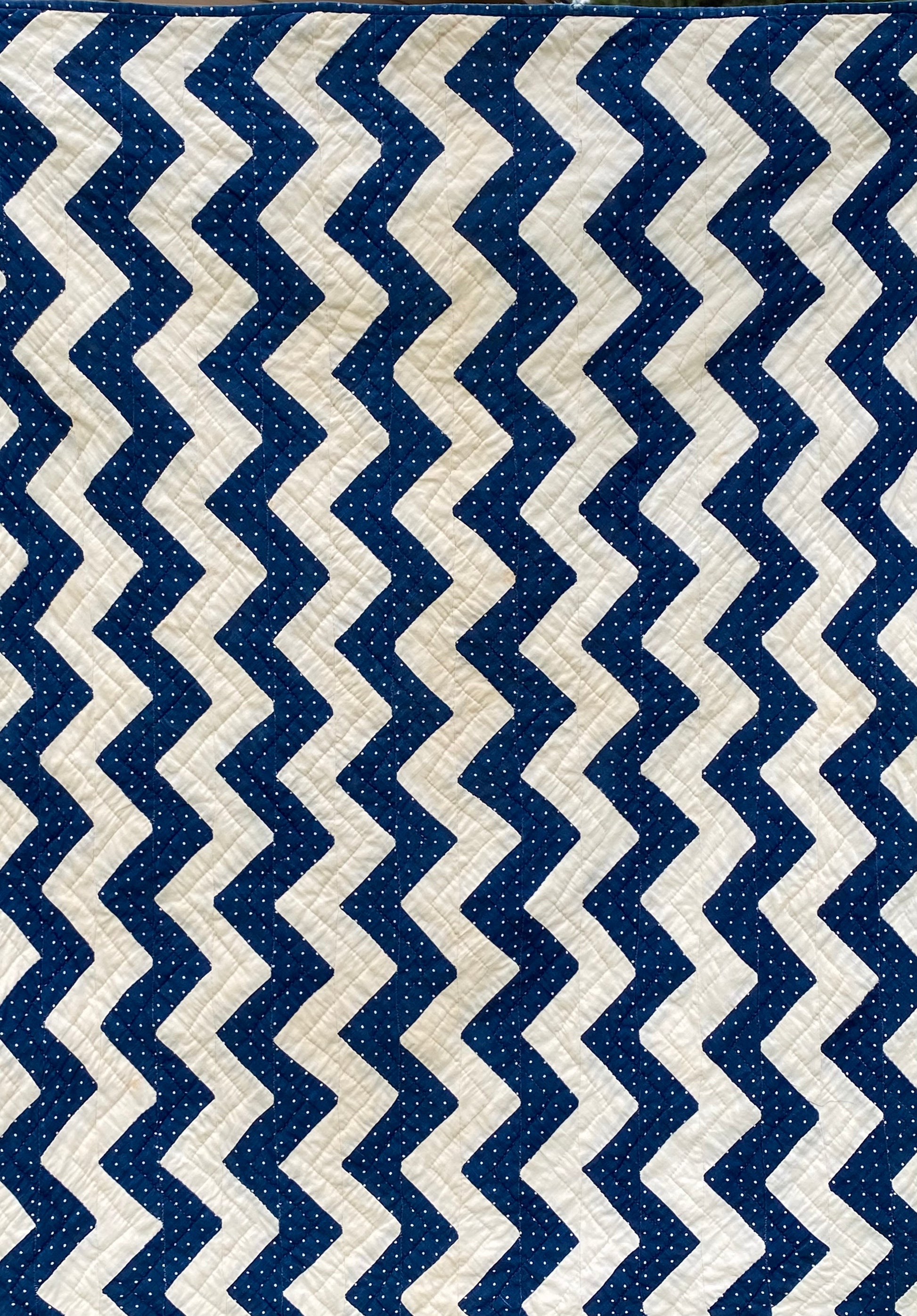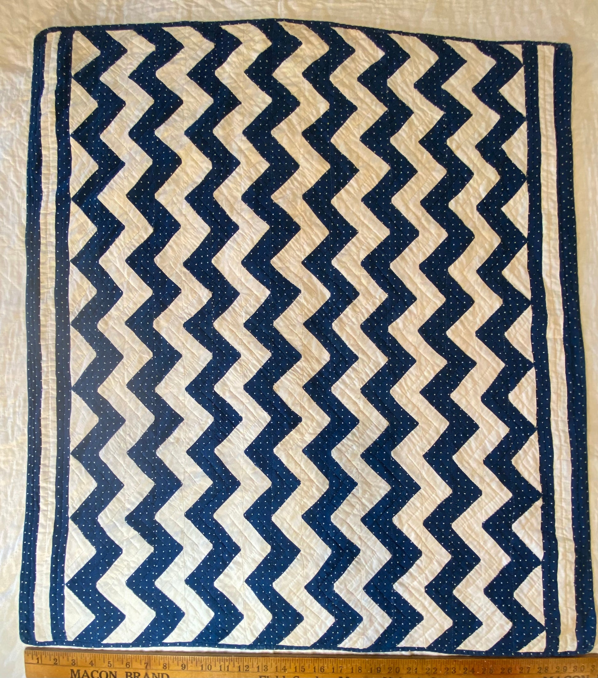Wonderful, original indigo blue and white Chevron crib quilt having a zip zag like design.