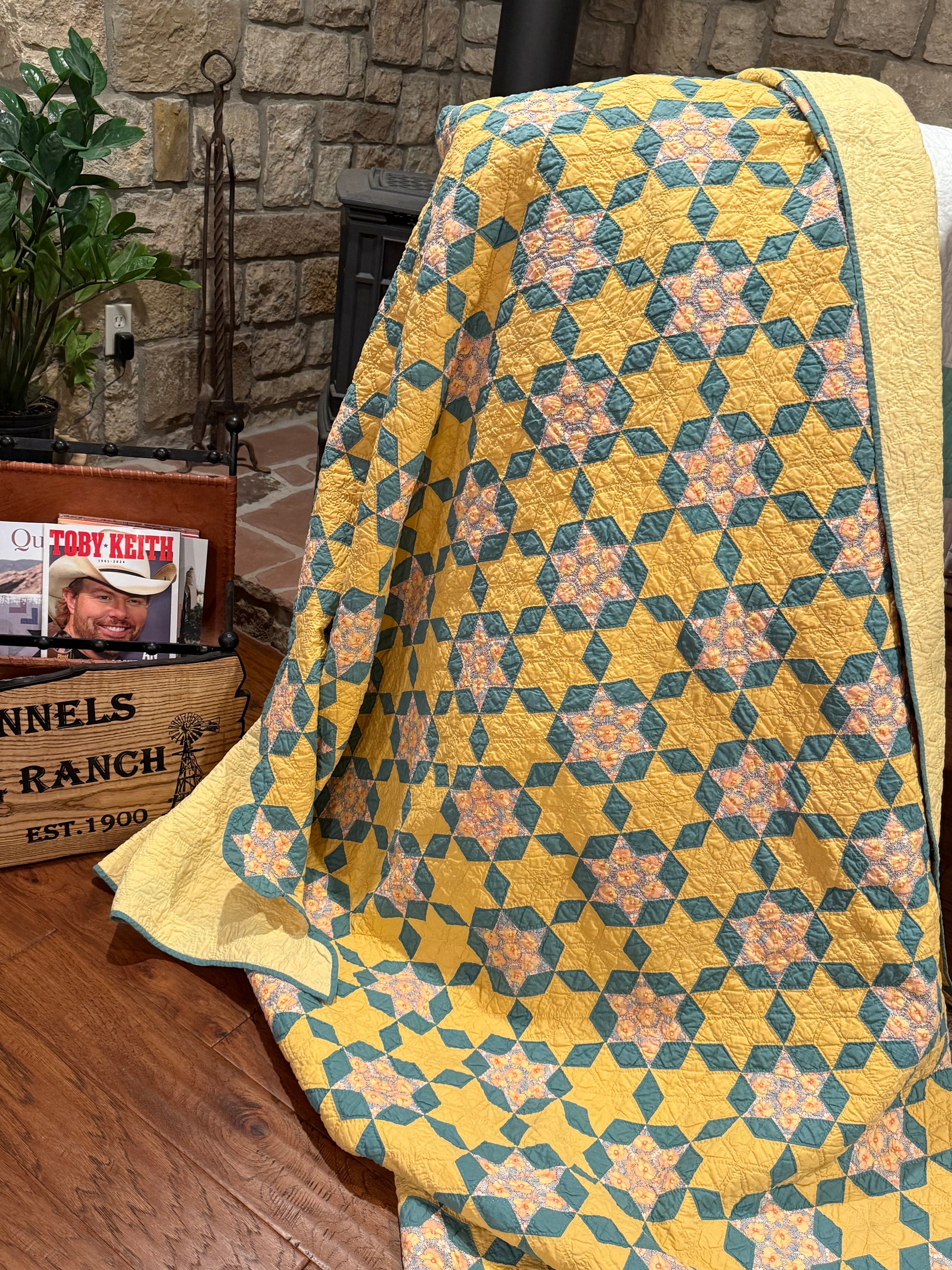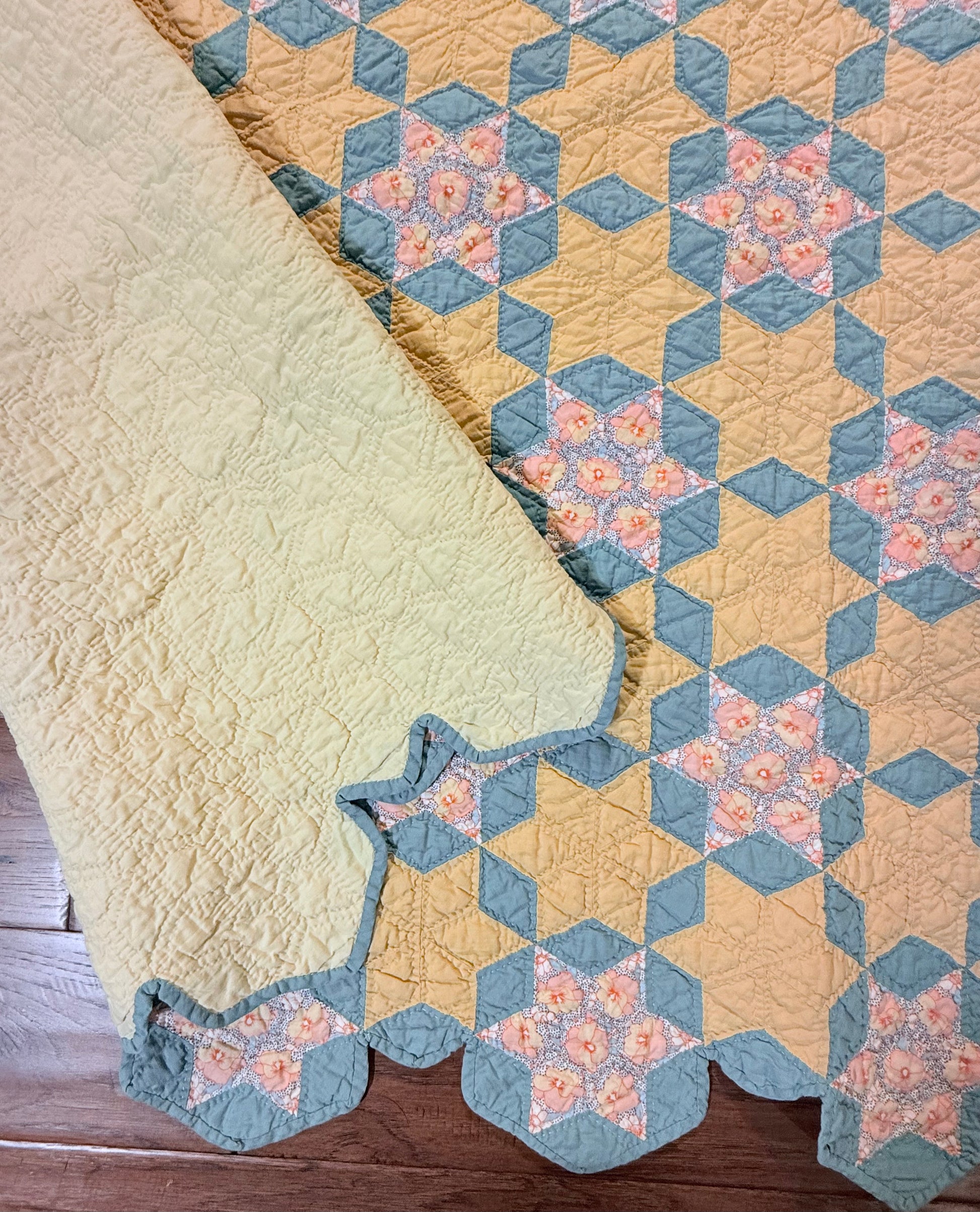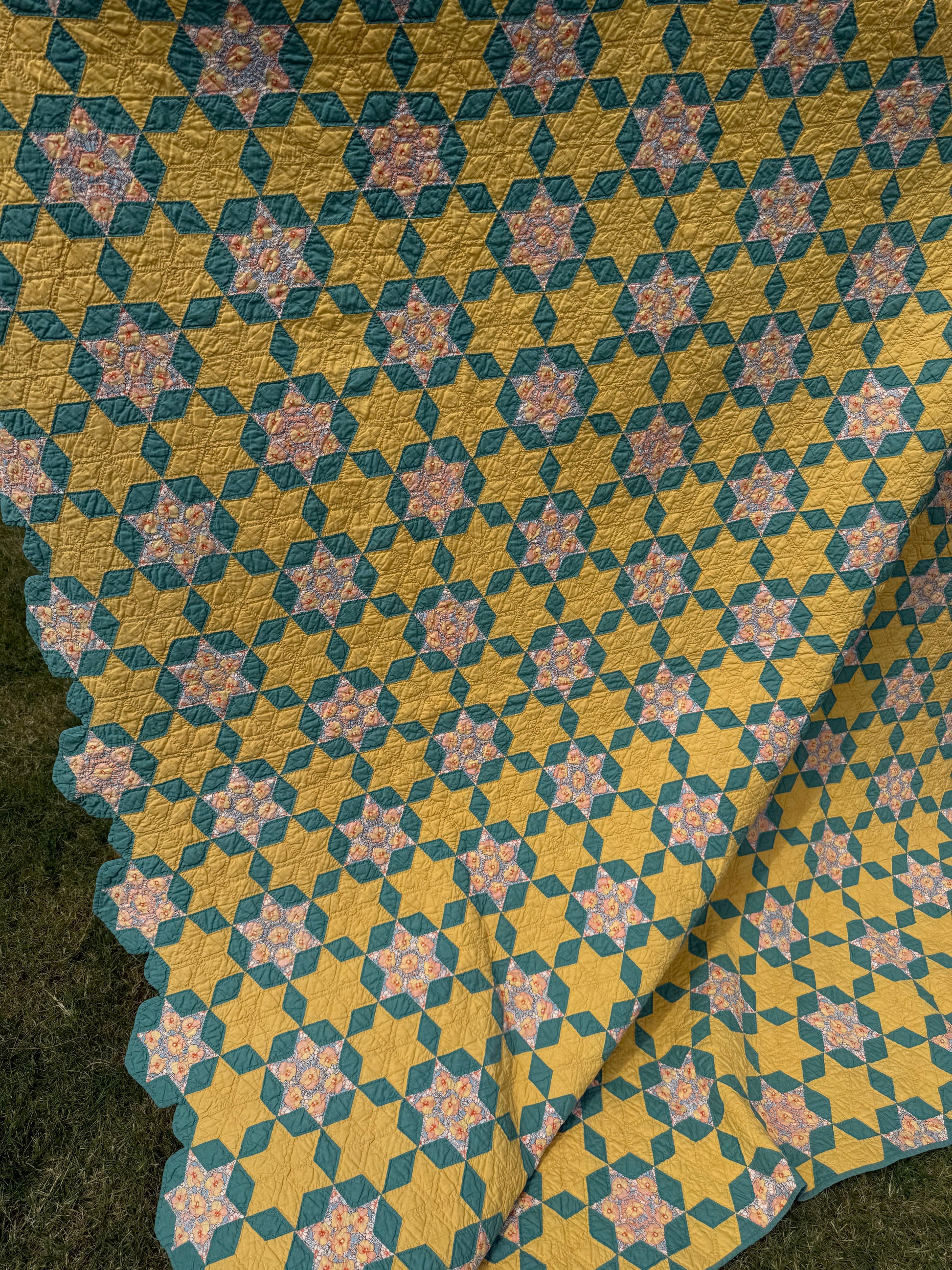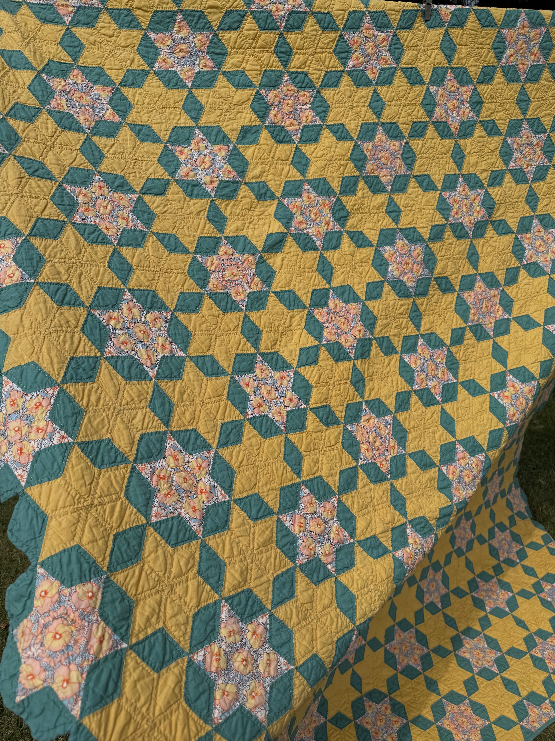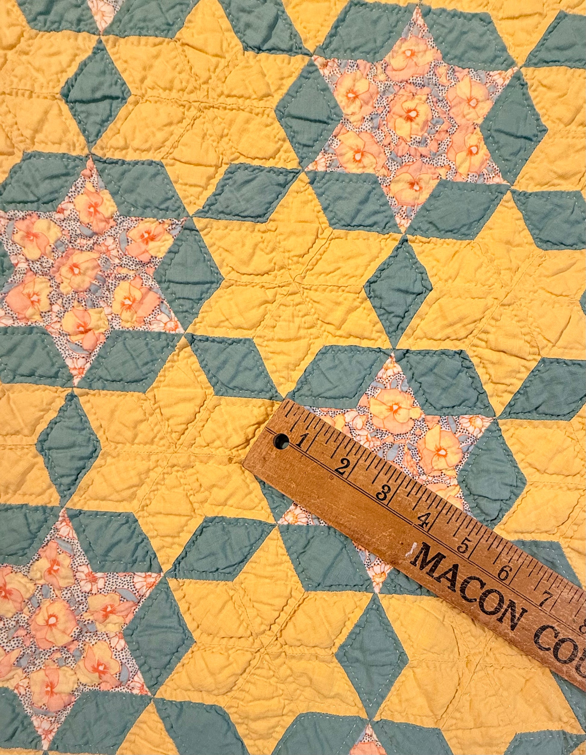The maker also fussy cut all the fabric in the stars that show the flower design. That takes a lot of doing and in cutting fabric to do this.