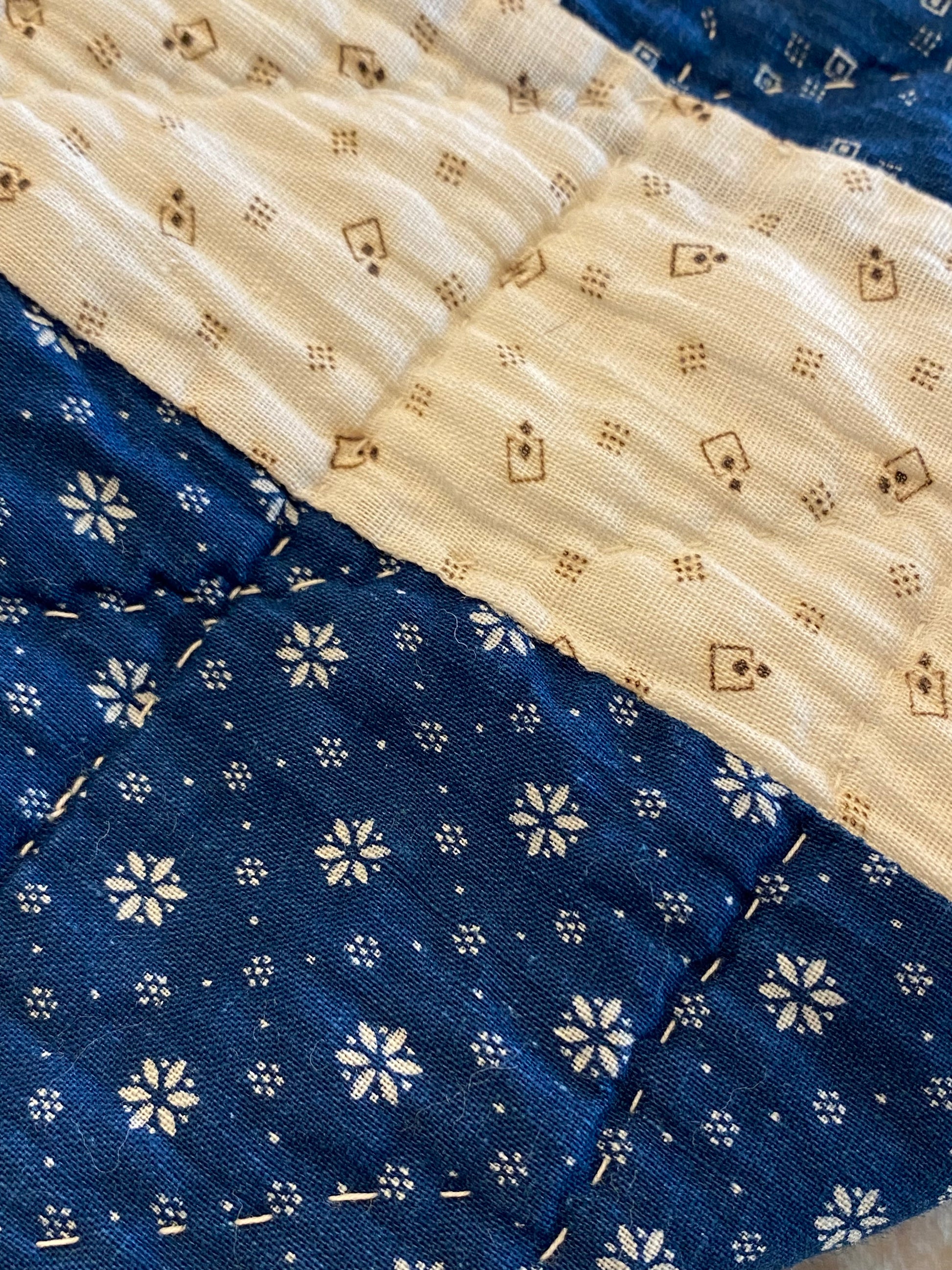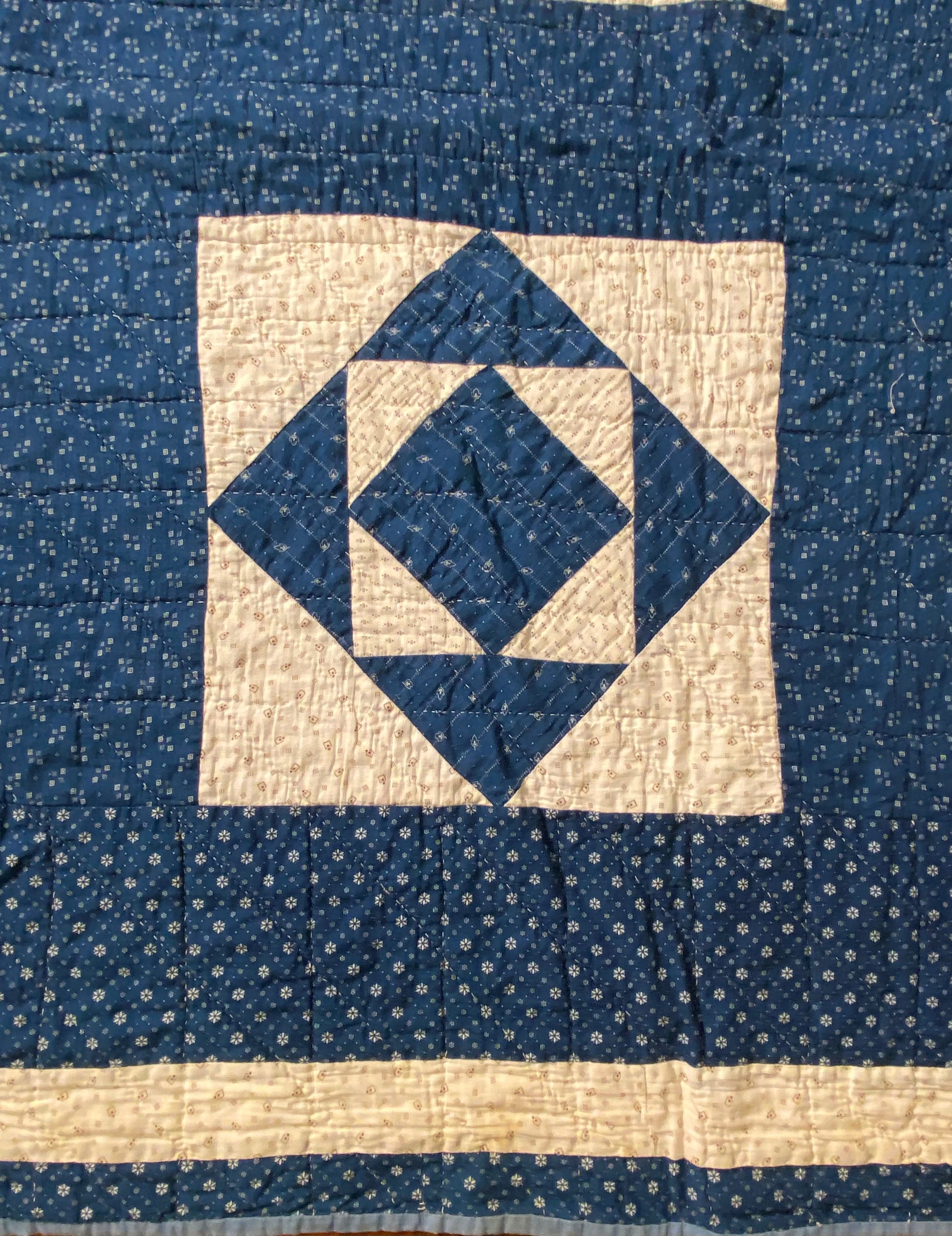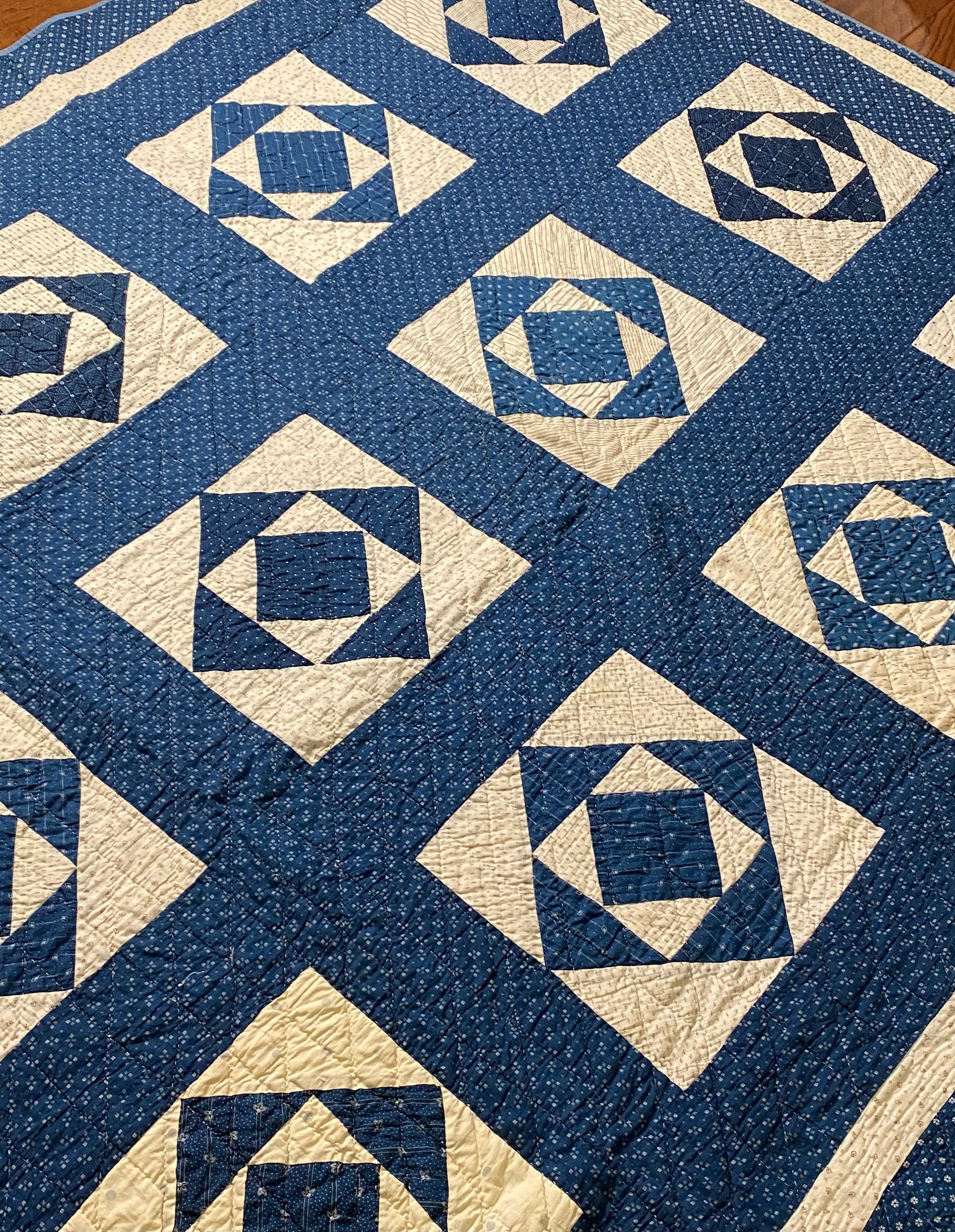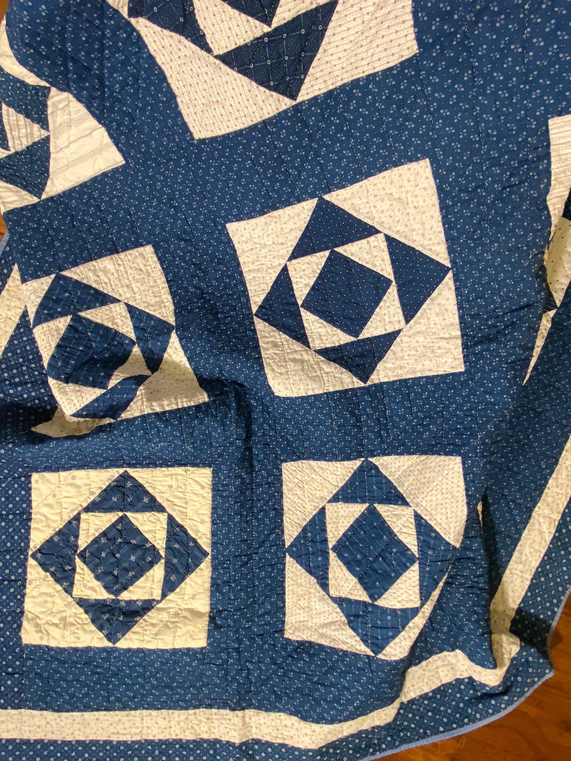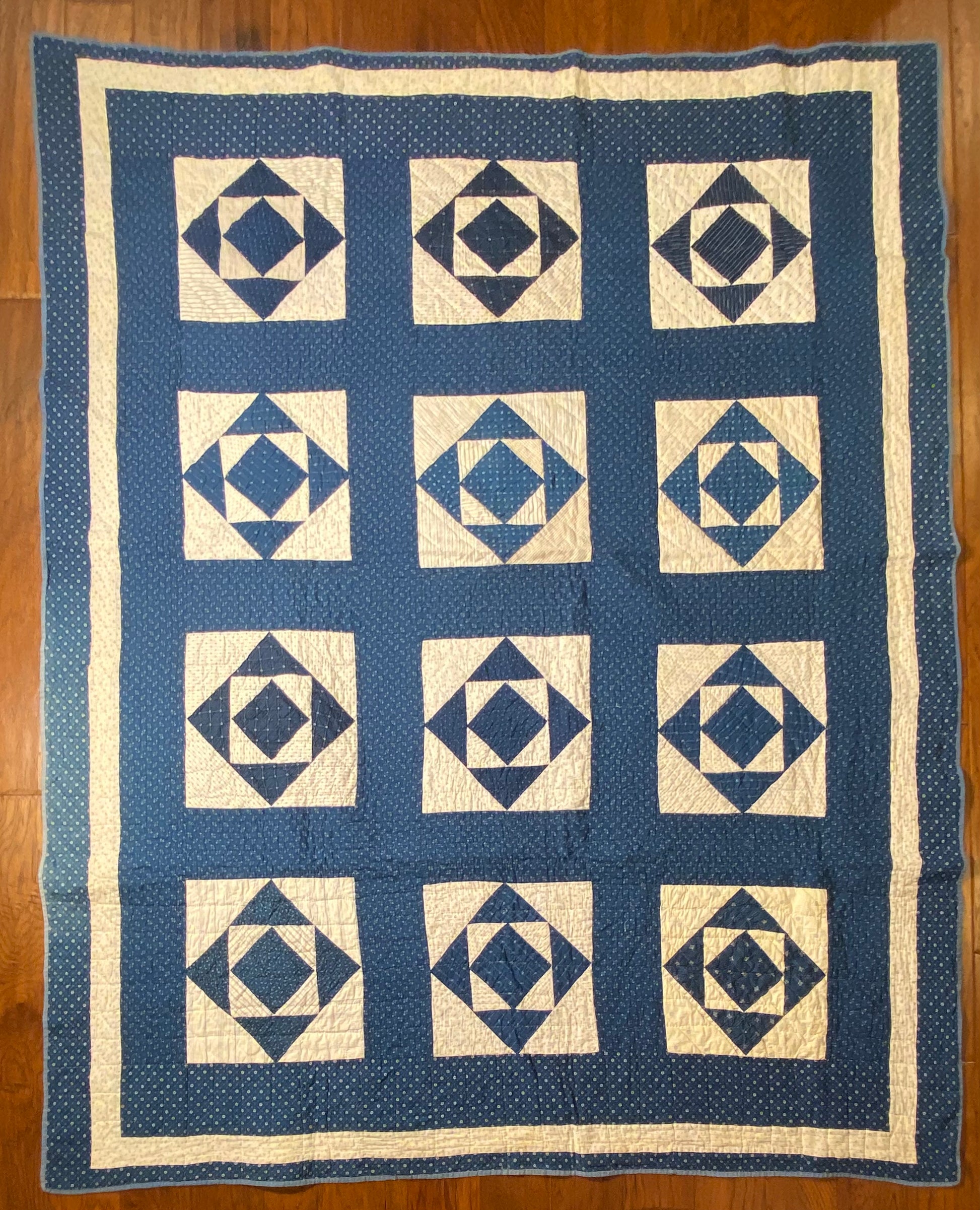 This fine antique quilt in indigo and shirting fabrics has a nice visual of simplicity, not a busy design or feel.
