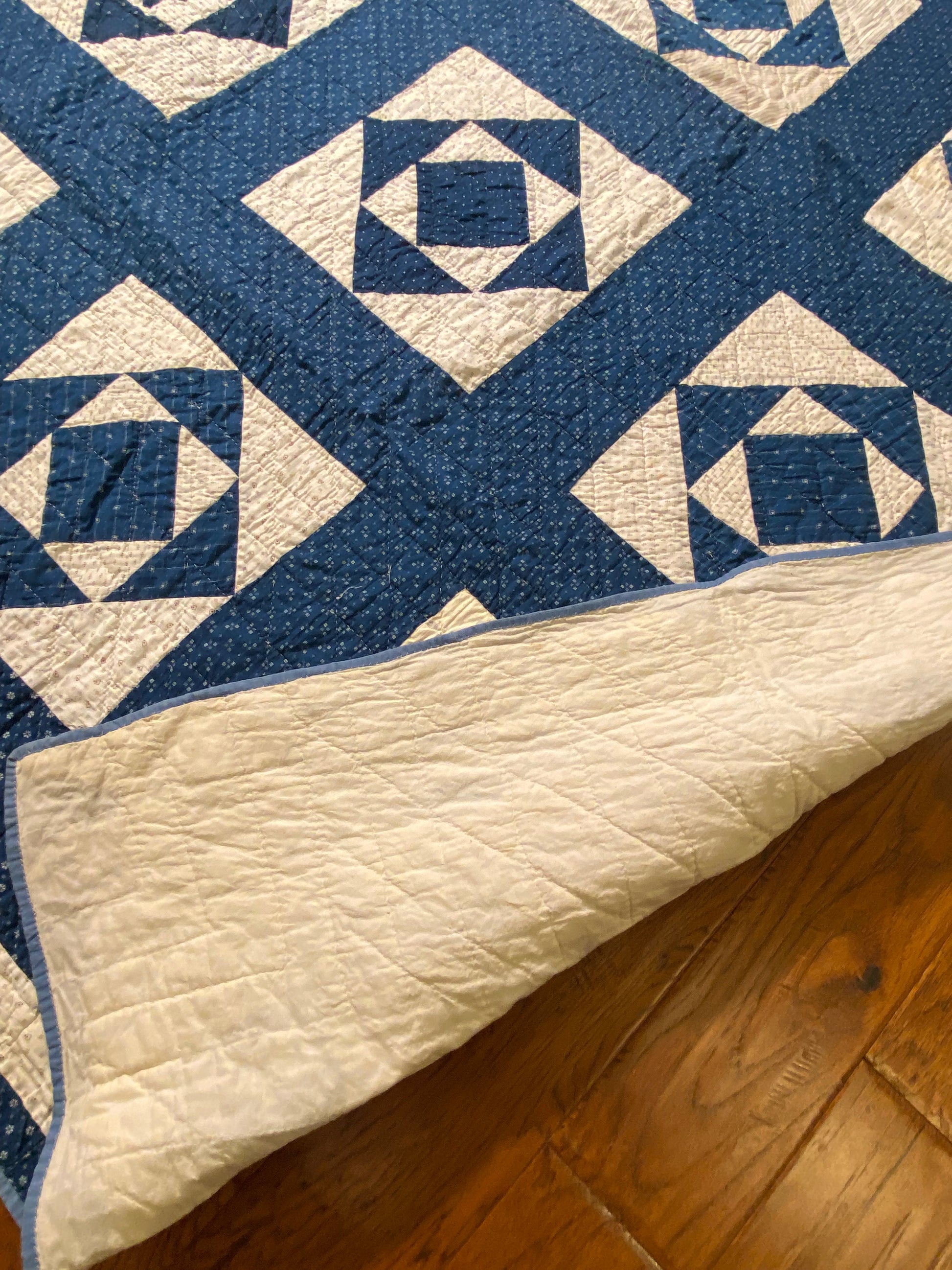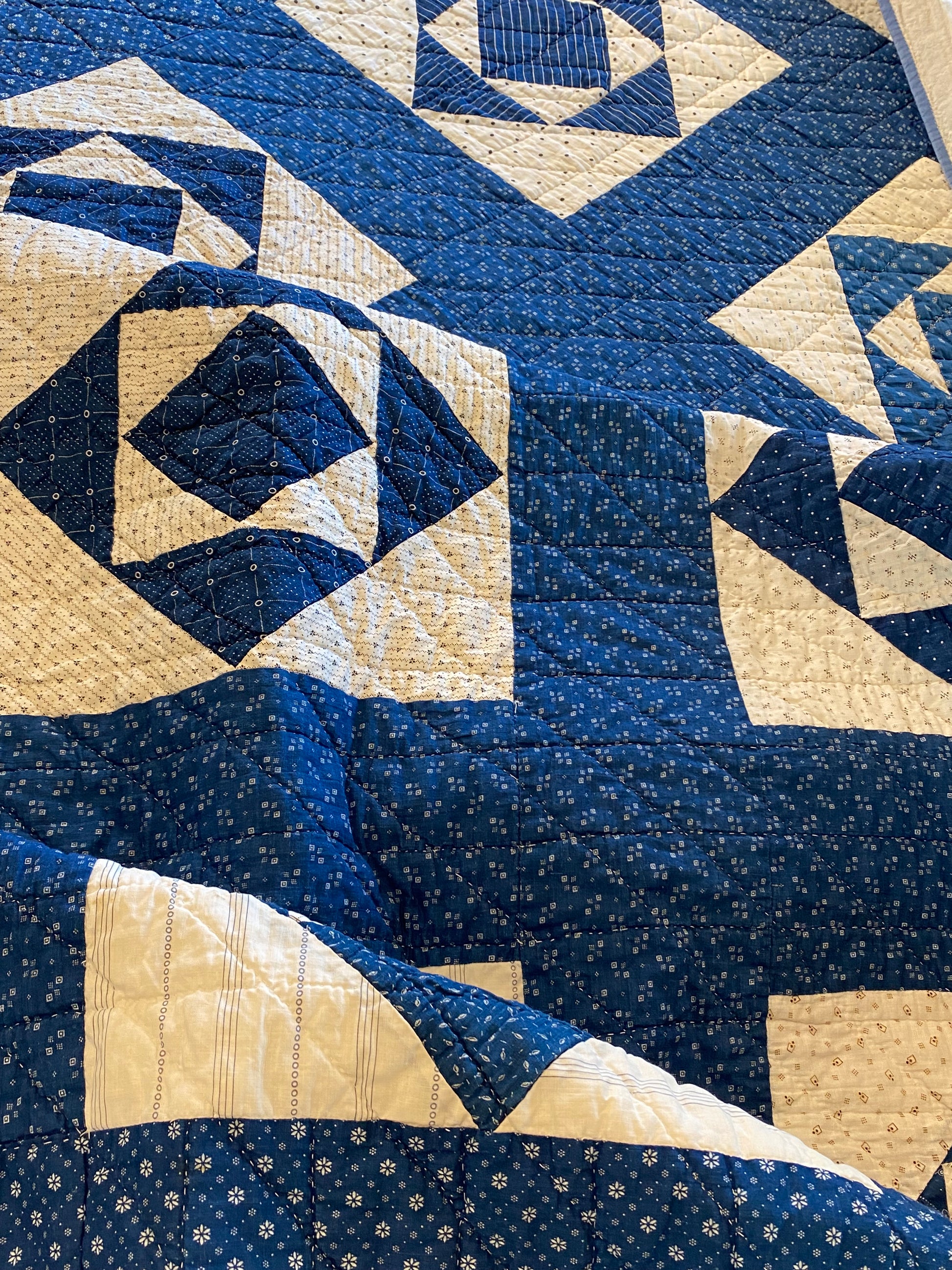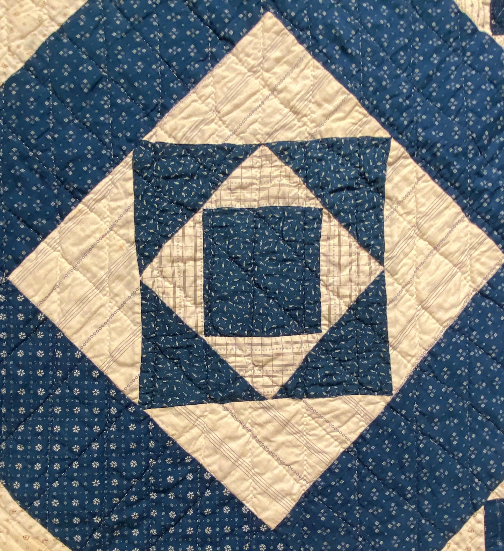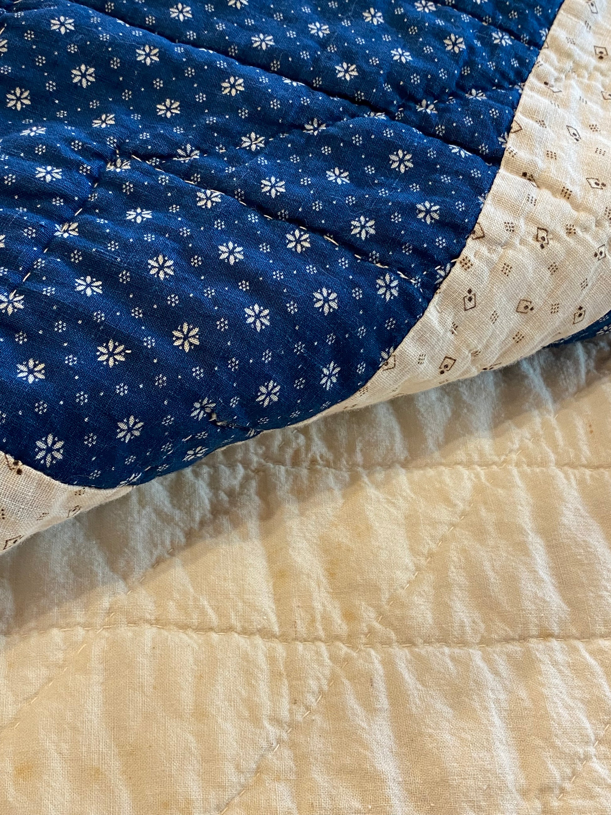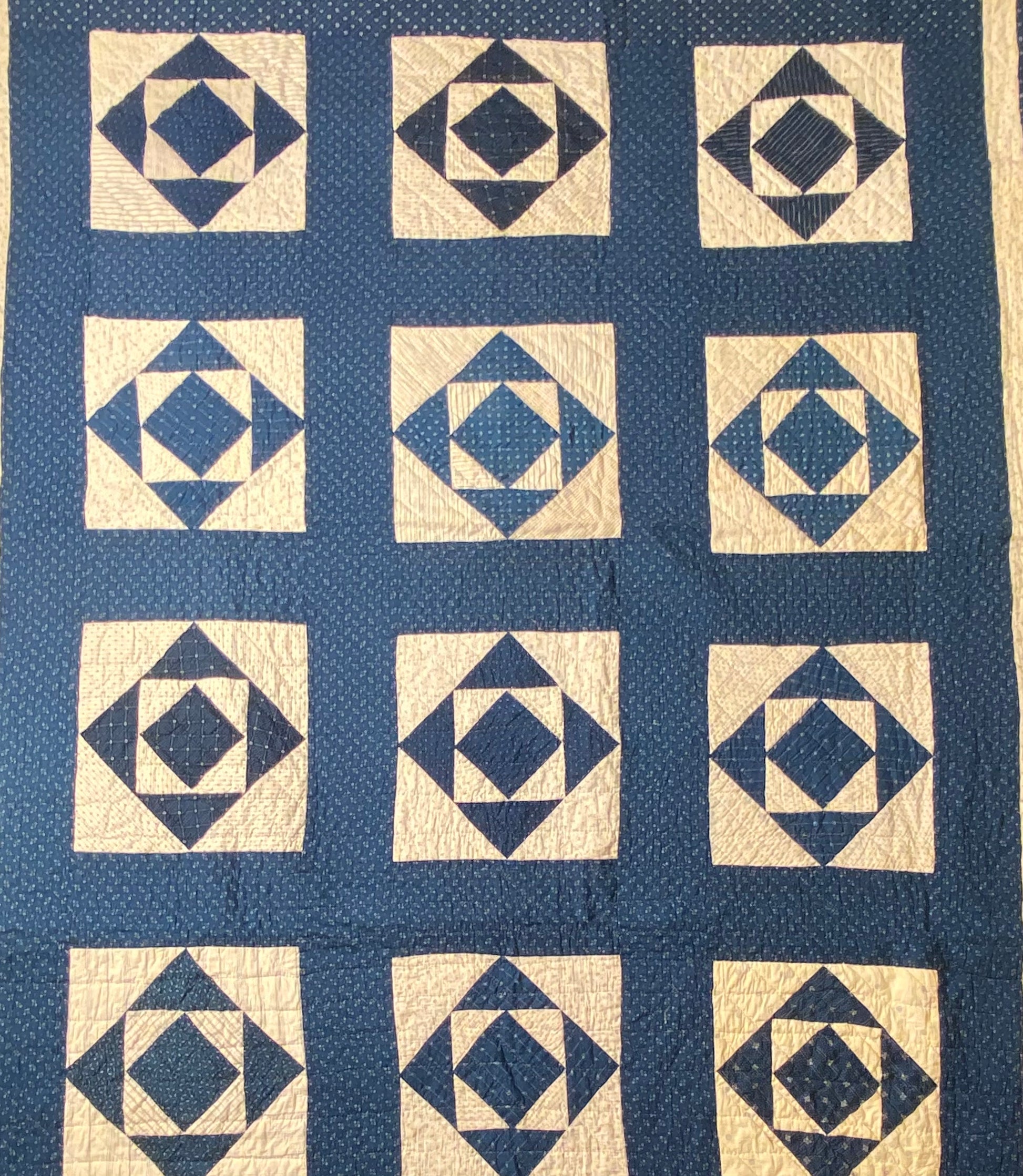 This fine antique quilt in indigo and shirting fabrics has a nice visual of simplicity, not a busy design or feel.