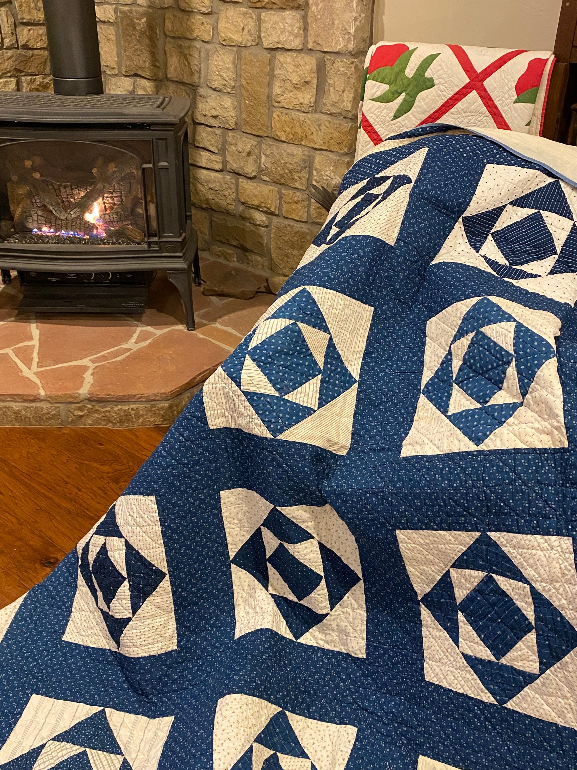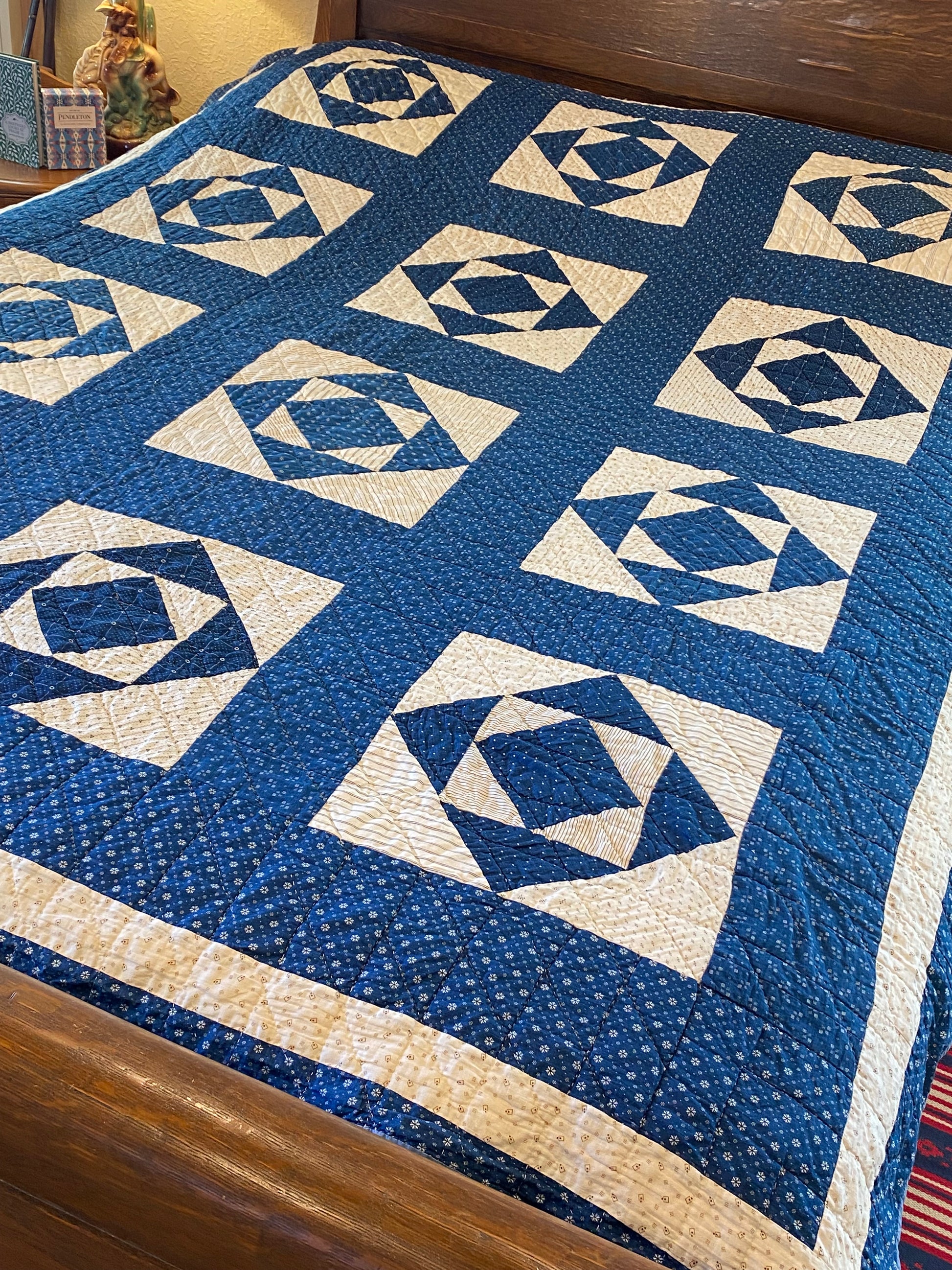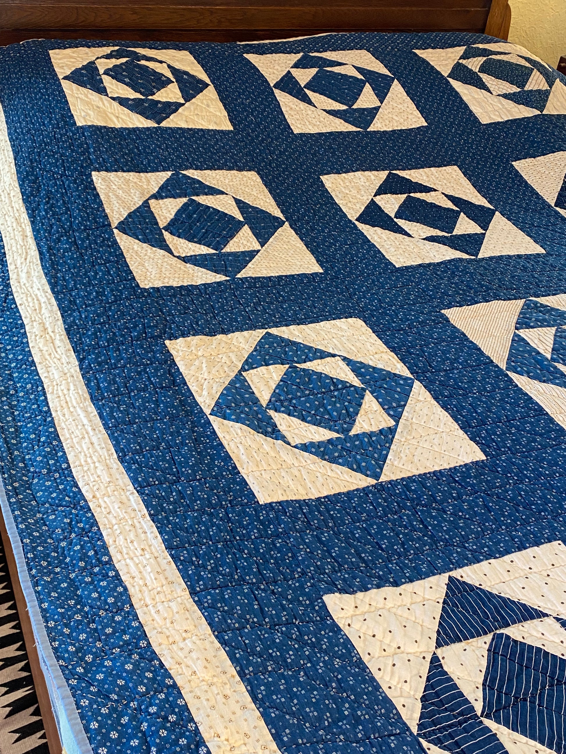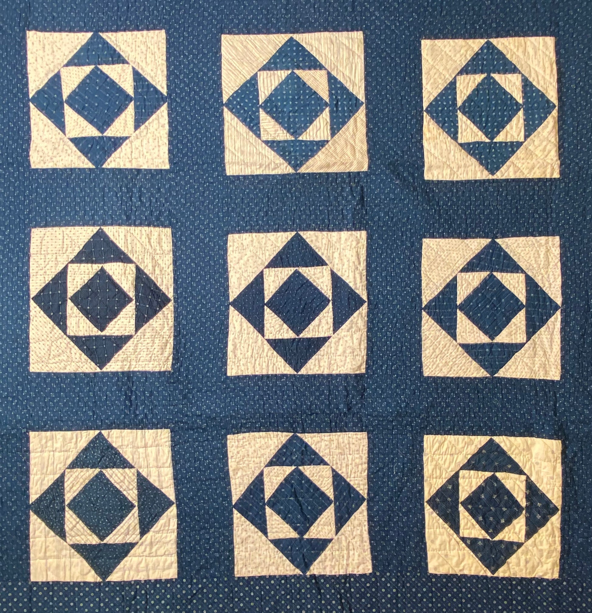 The Square in a Square block is sashed by a nice deep indigo fabric.