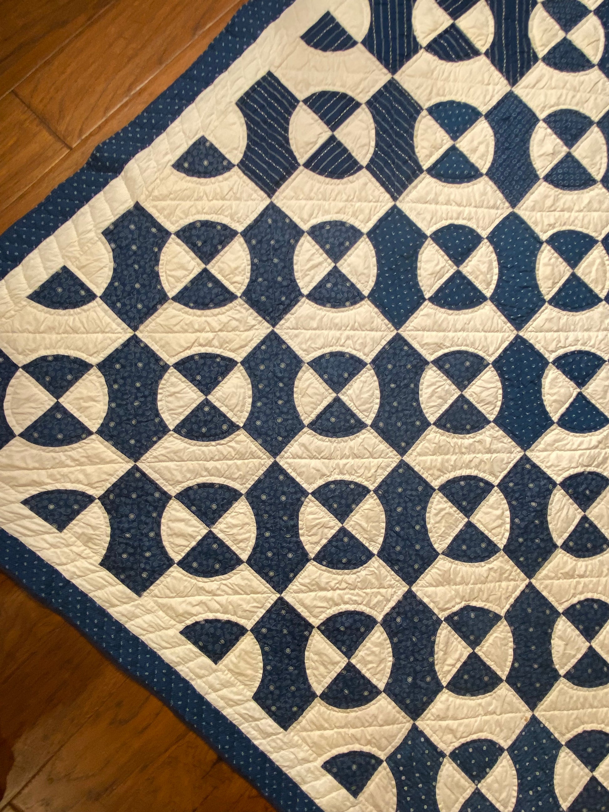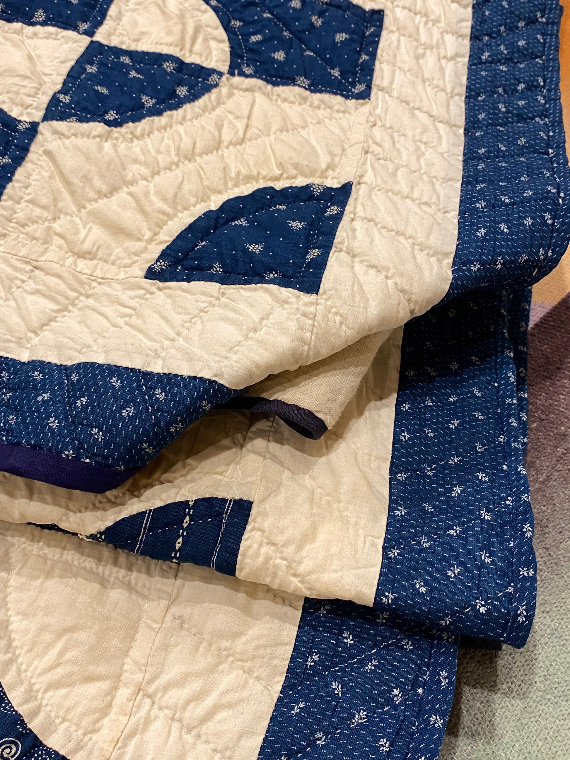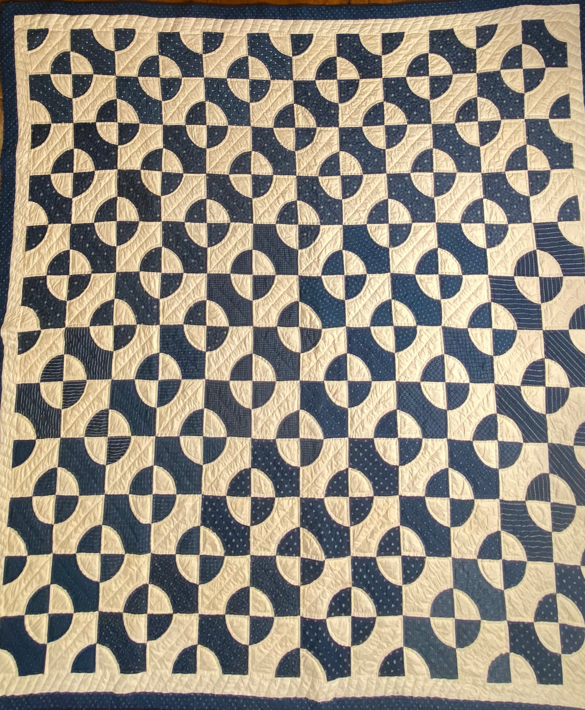 Its bound with 2 different fabrics of blue, possible the blue solids on the 2 ends was done later as it may have not been finished at the time it was actually made, as its a different shade of blue.