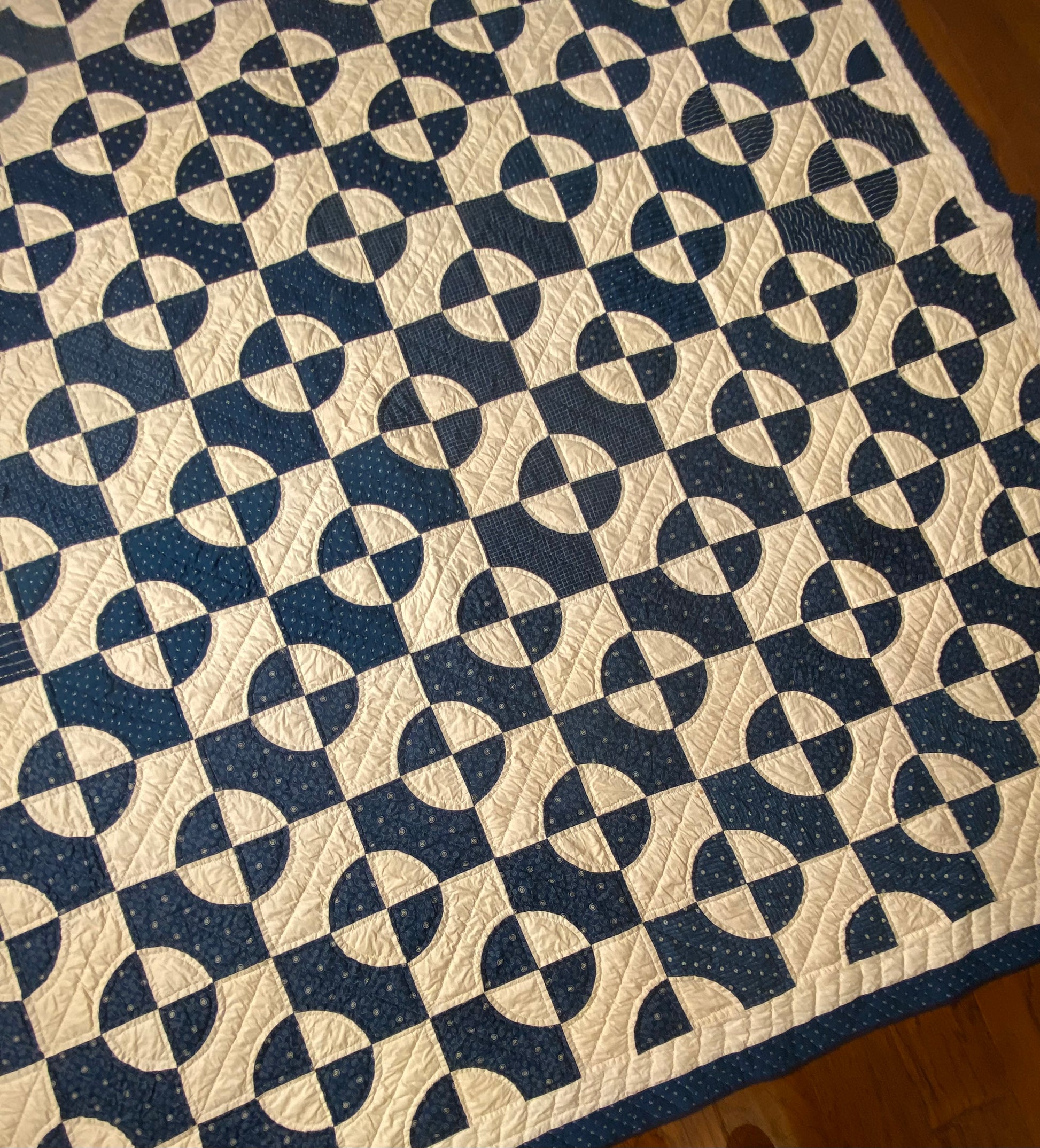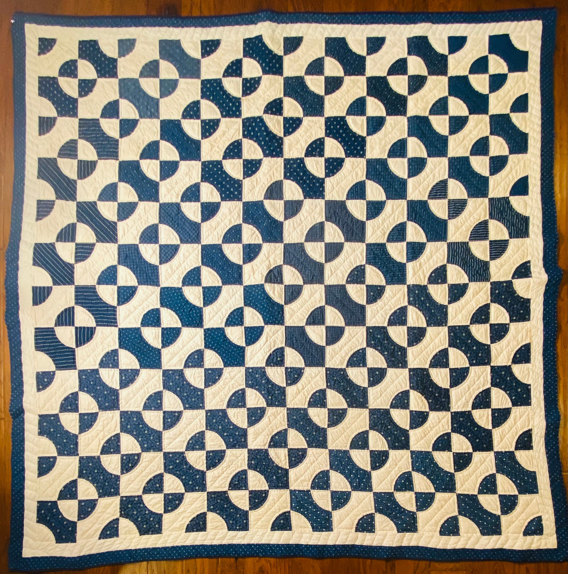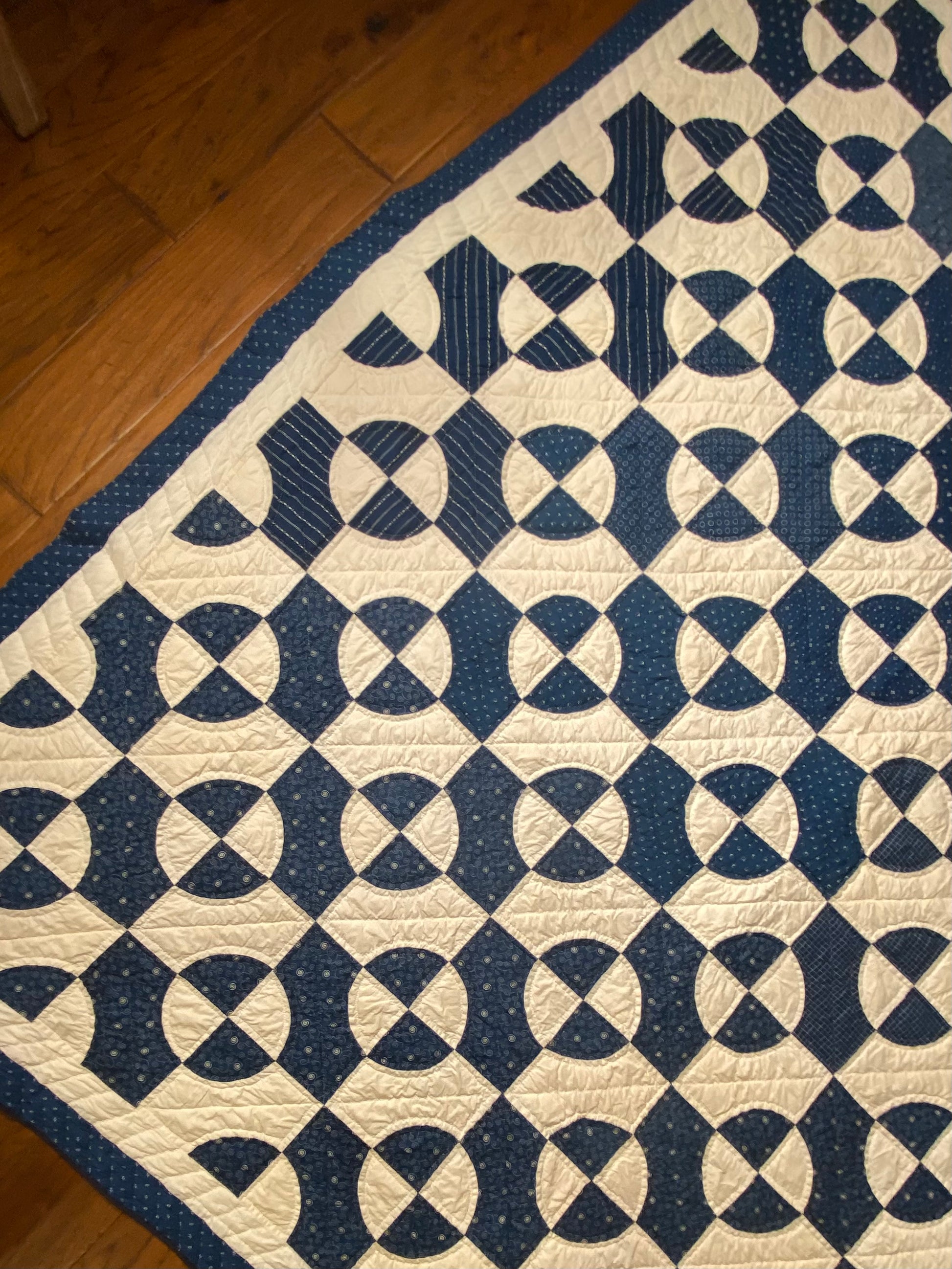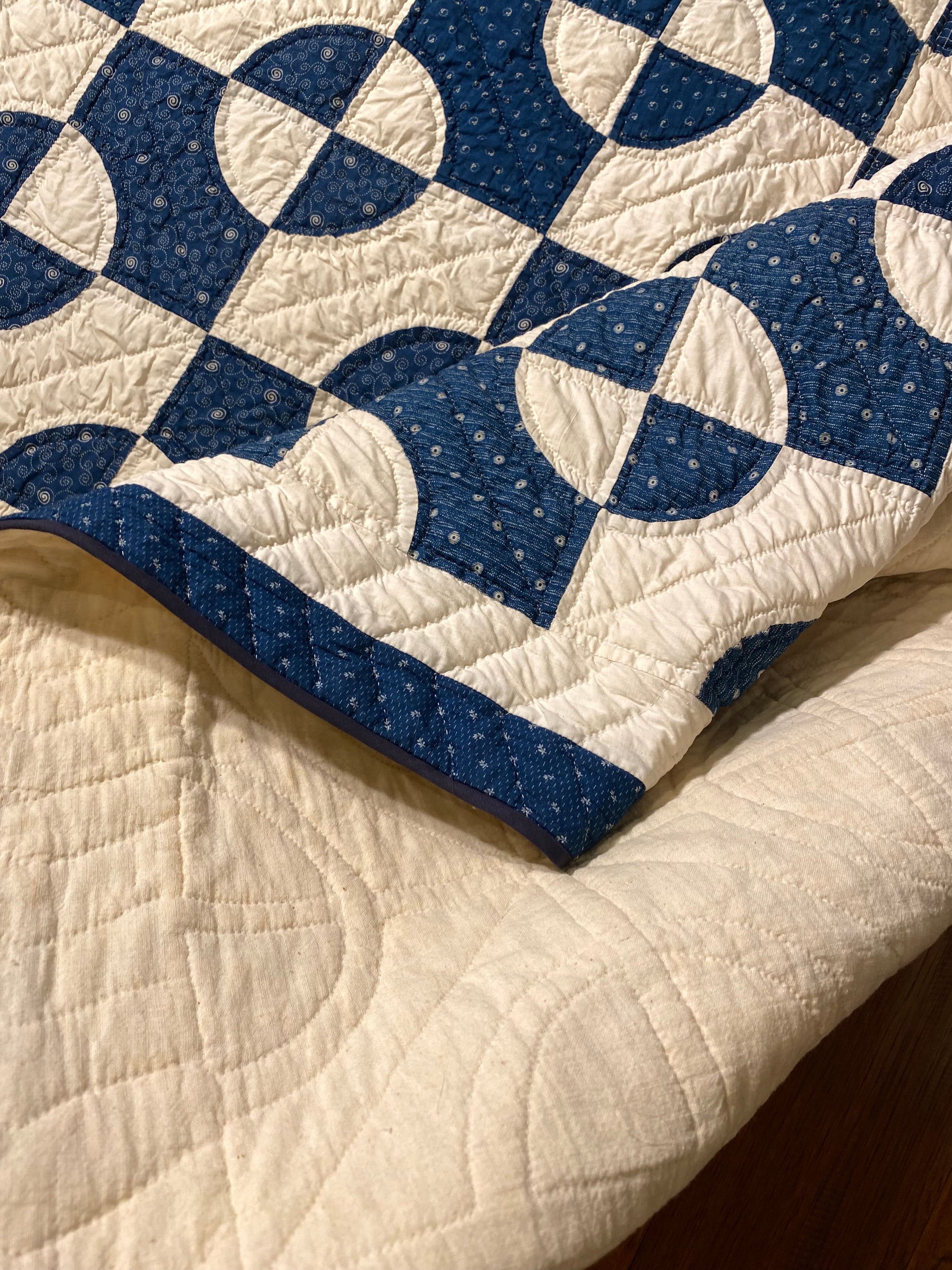 Its bound with 2 different fabrics of blue, possible the blue solids on the 2 ends was done later as it may have not been finished at the time it was actually made, as its a different shade of blue.
